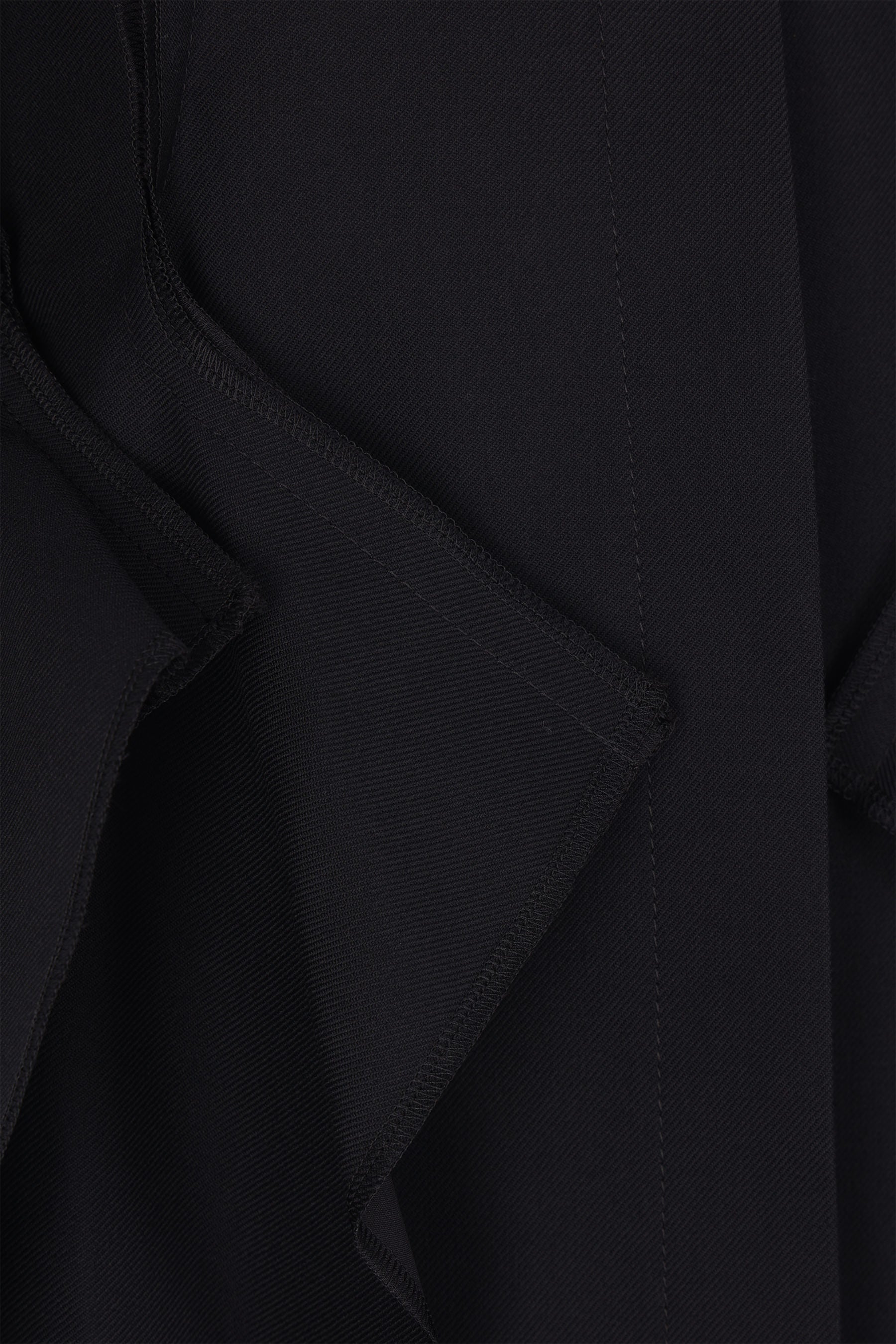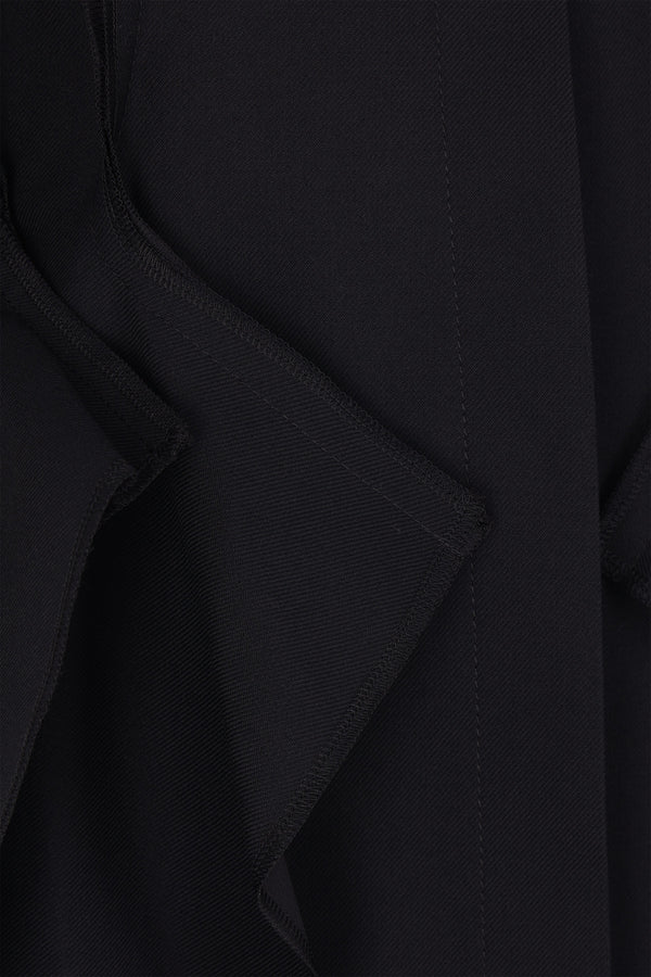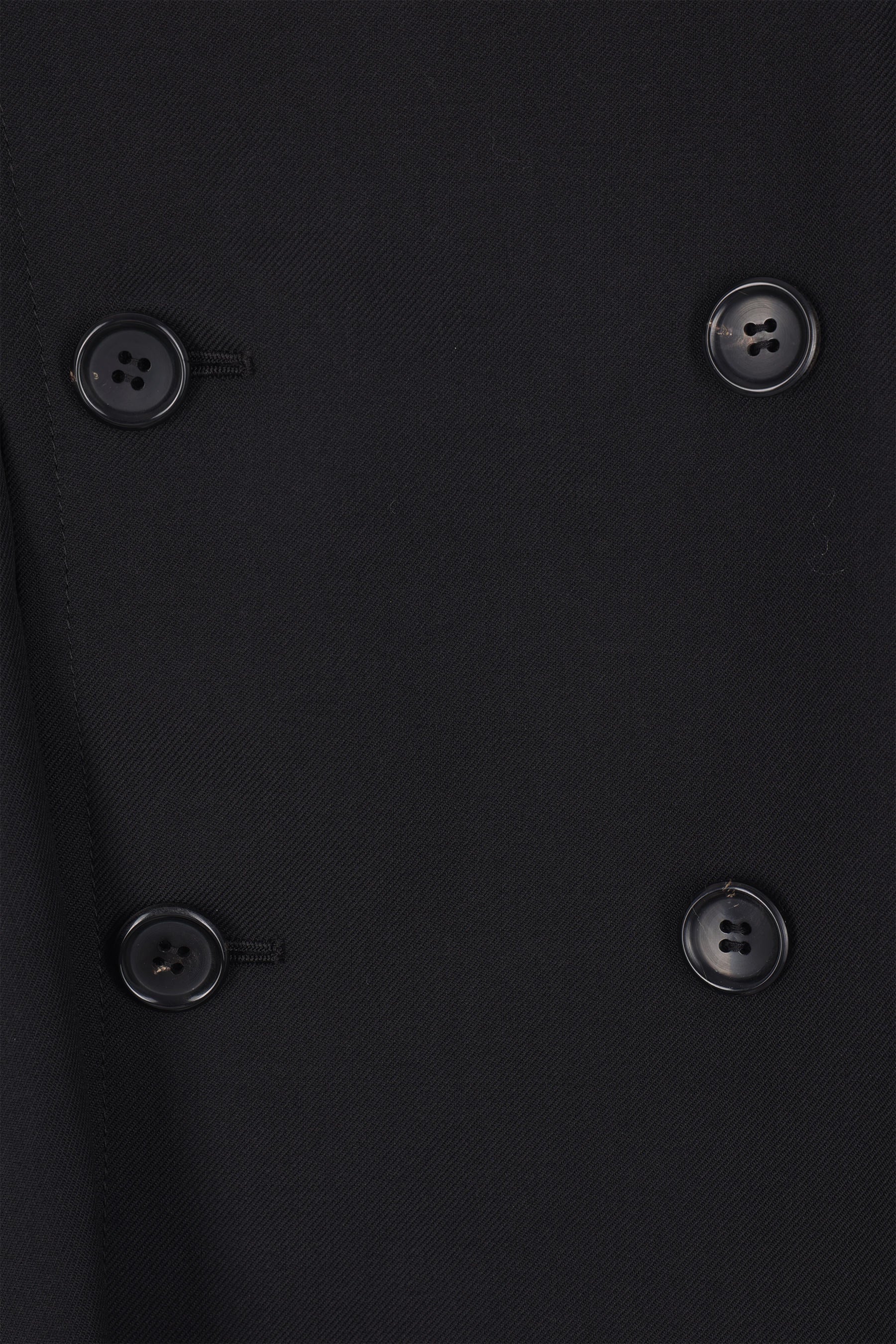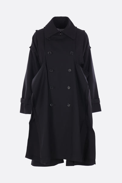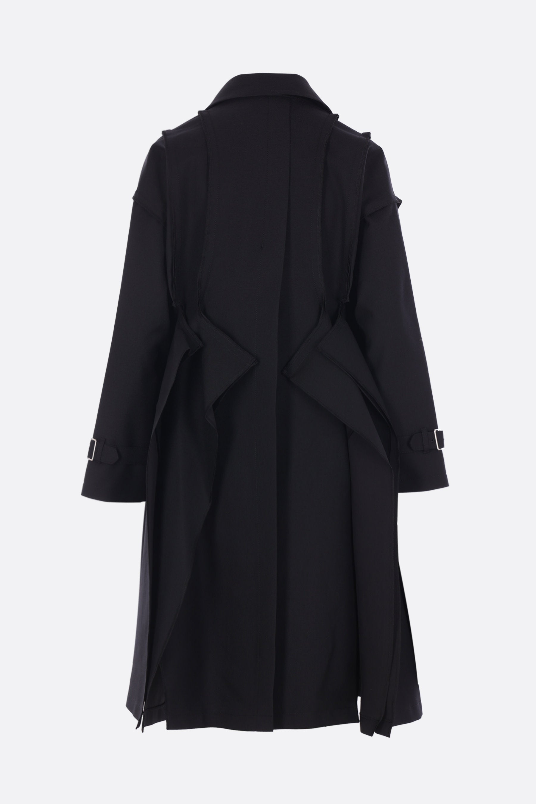 Tao Comme des Garçons deconstructed trench coat made from black wool-blend gabardine with reverse stitching. Features a pointed collar, double-breasted button closure, flap pockets, long sleeves with wrist straps, panelled construction with multiple vents, and partially lined interior.