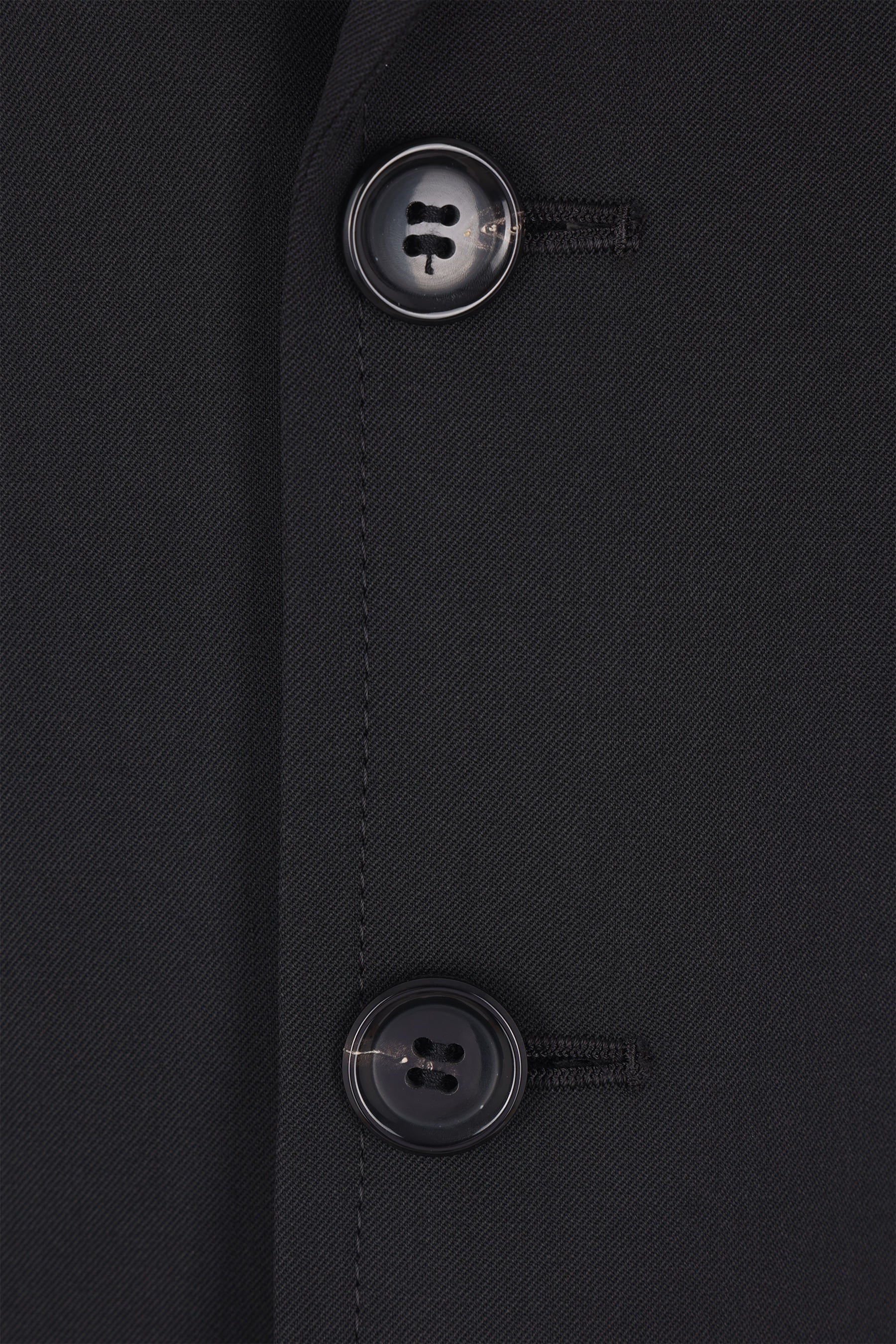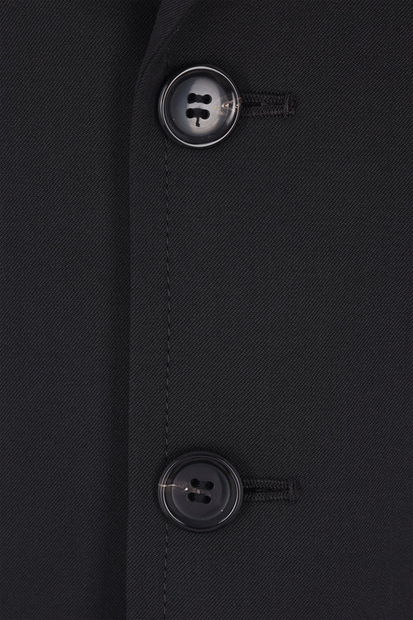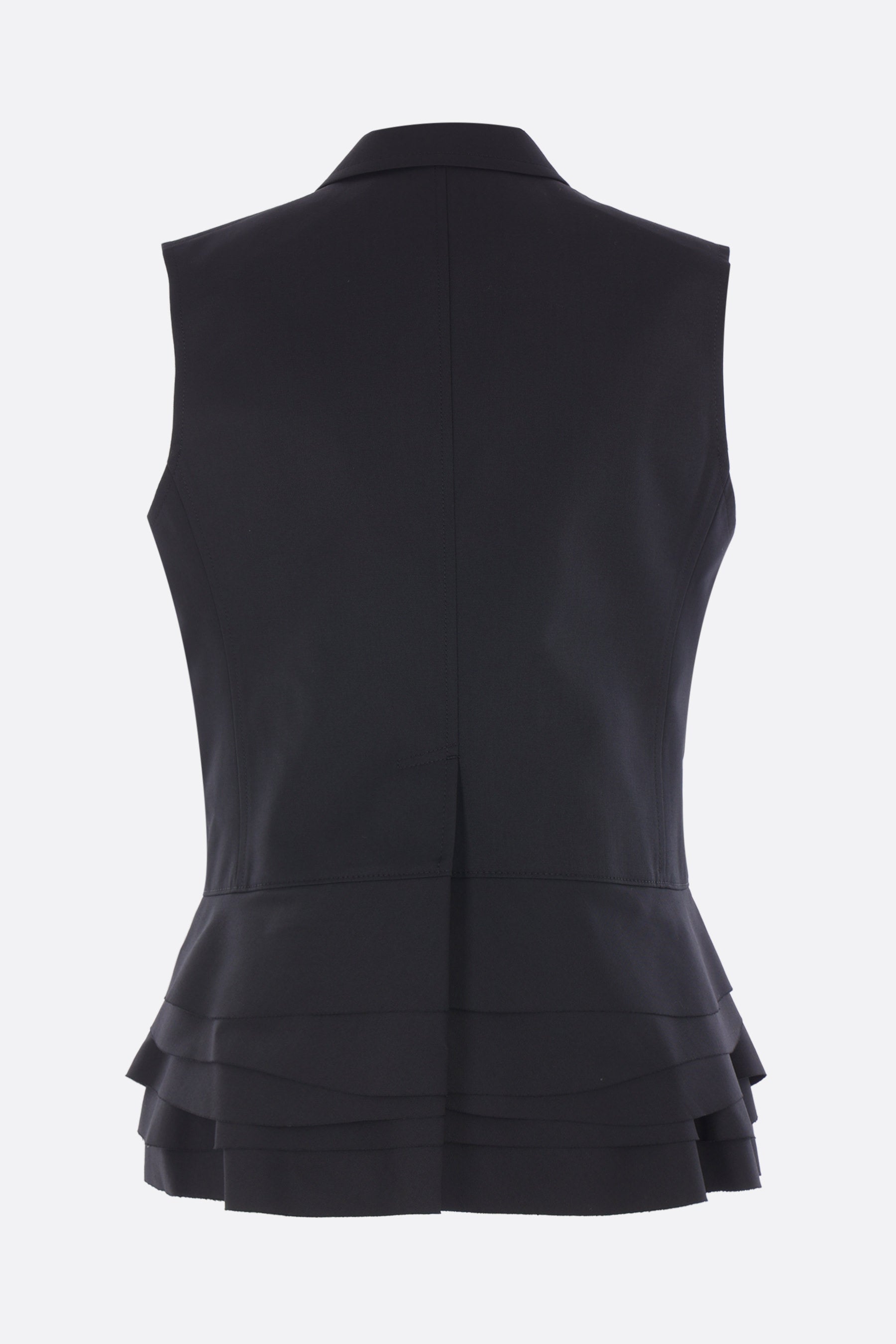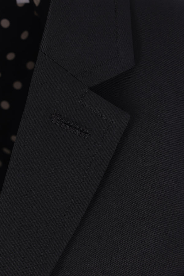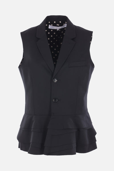 Tao Comme des Garçons single-breasted vest made from black wool-blend. Features a classic notch lapel, front button closure, welt pocket, raw-cut ruffles at the hem, central back vent, and polka dot lining.