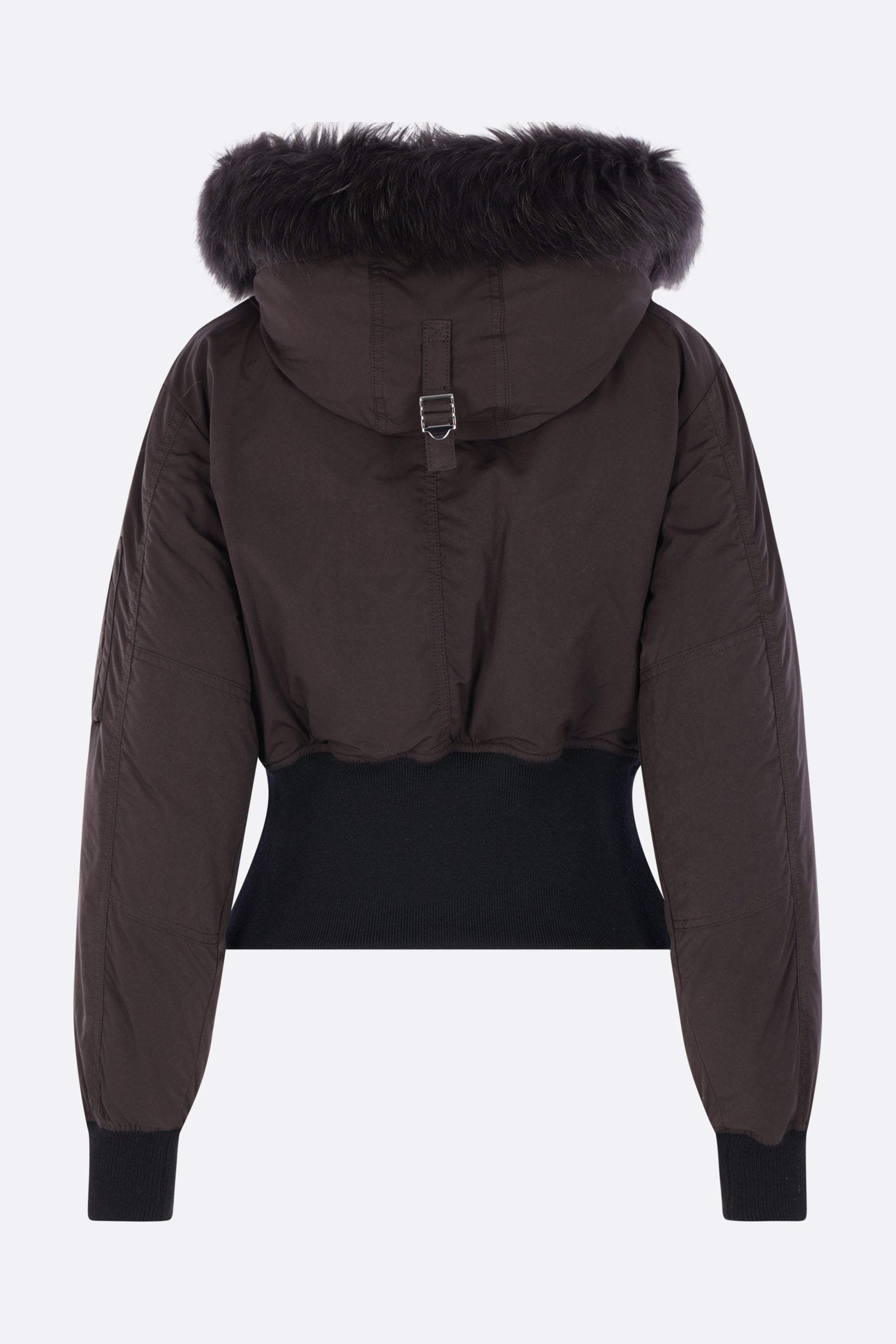 - 70% polyester, 30% nylon; filling: 90% goose down, 10% goose feathers; lining: 100% nylon; hem: 95% wool, 4% nylon, 1% polyurethane; hood trim: raccoon fur