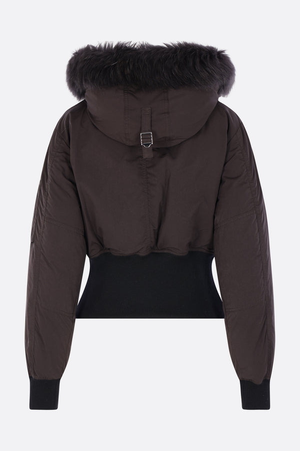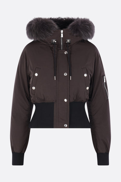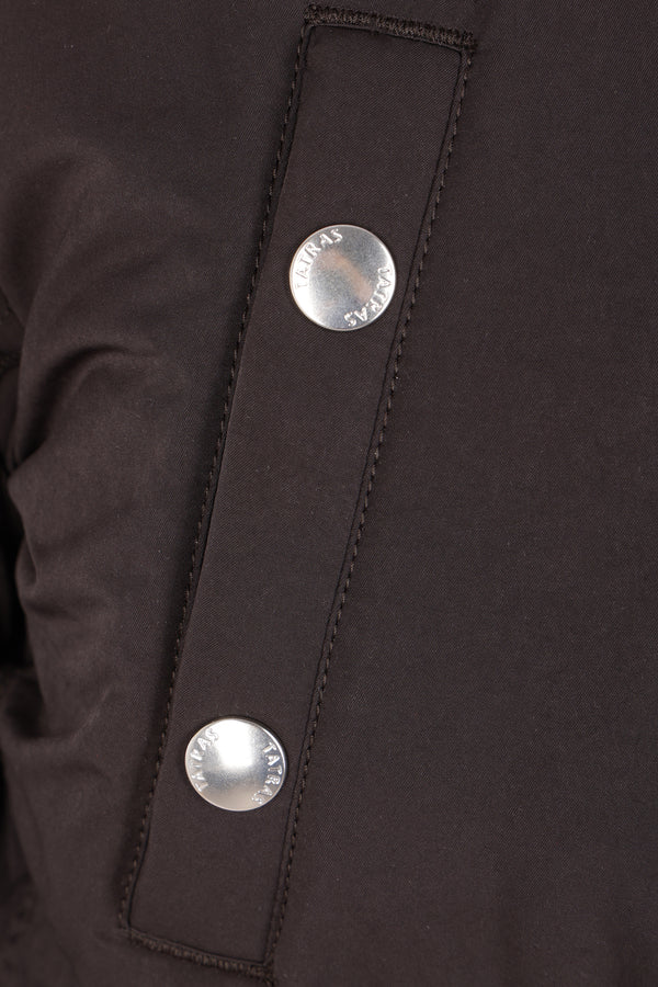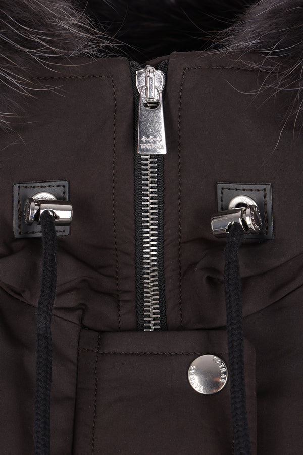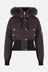 Tatras short down jacket crafted from black nylon. Featuring a high collar, hood with drawstring and removable fur trim, front closure with two-way zip and snap buttons, multiple pockets, long sleeves, and ribbed knit edges. Completed with an embroidered logo on the left sleeve.
