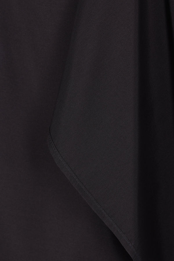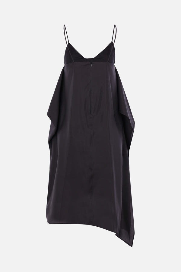 Ter et Bantine short dress made of black silk. Features a sweetheart neckline, thin straps, invisible back zip closure, asymmetric hem, and a fully lined interior.