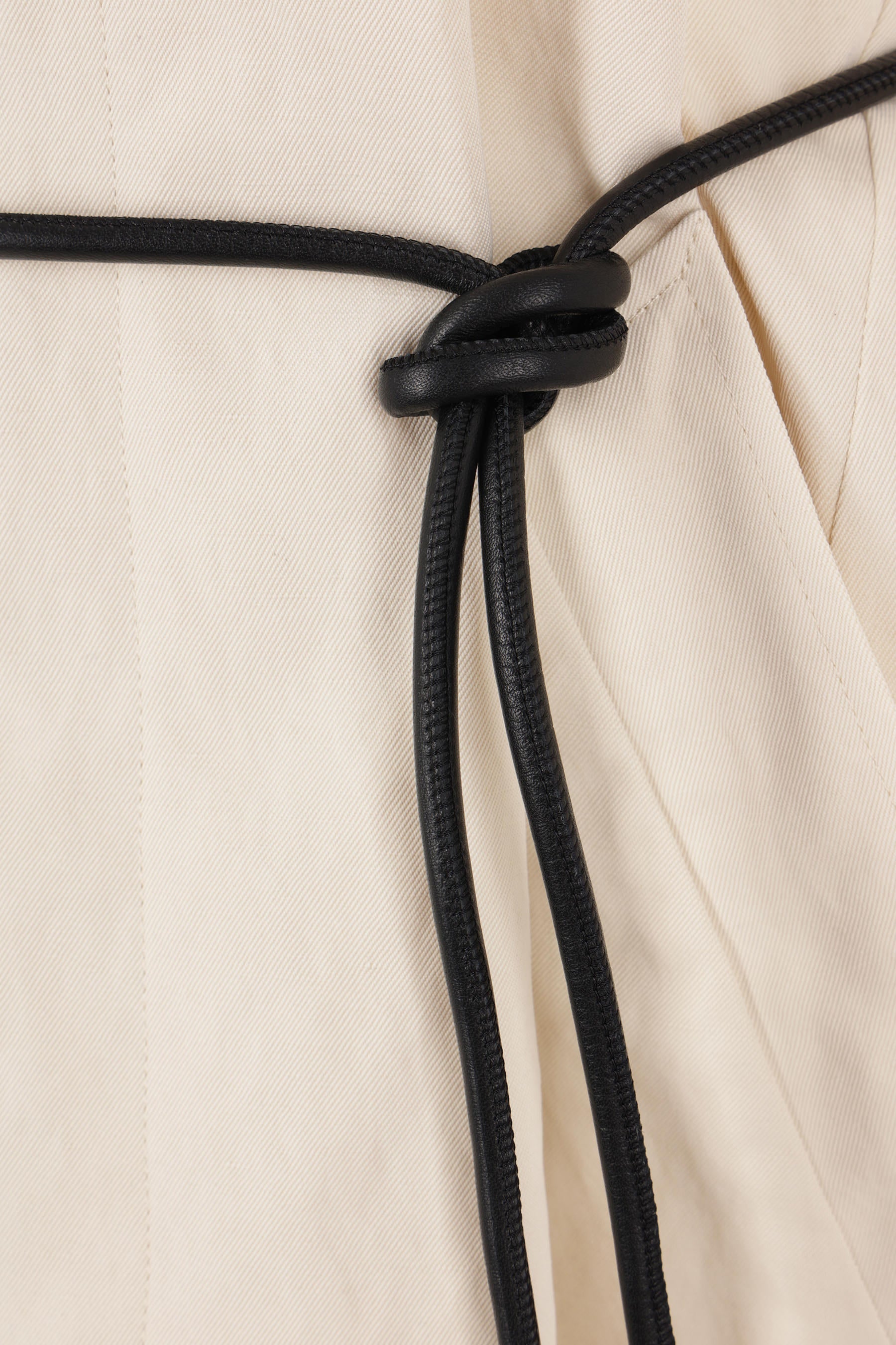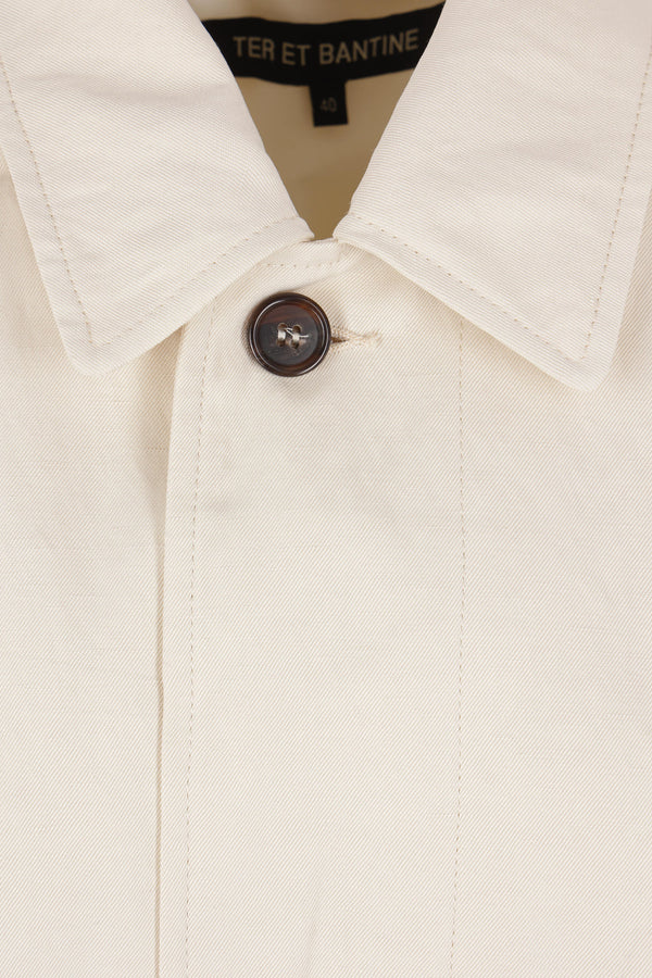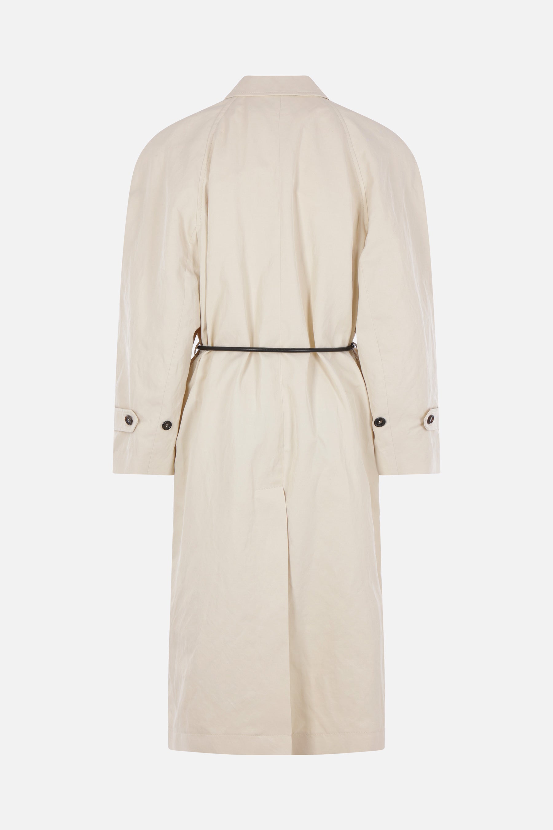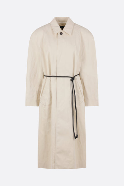 Ter et Bantine overcoat made of a butter-colored linen blend. Features a pointed collar, concealed front button closure, padded shoulders, raglan sleeves with buttoned tabs, welt pockets, black leather tubular belt, central back vent, and a partially lined interior.