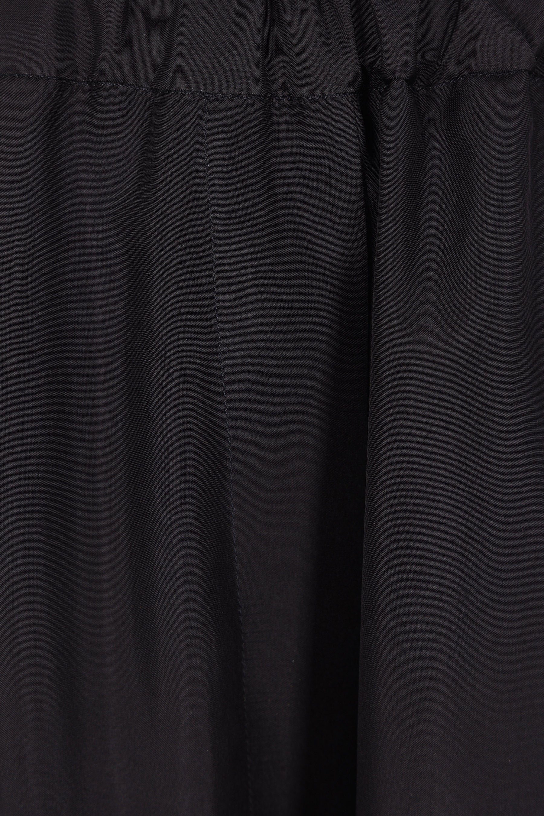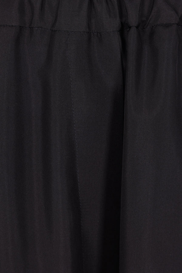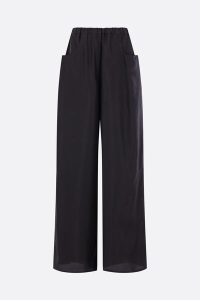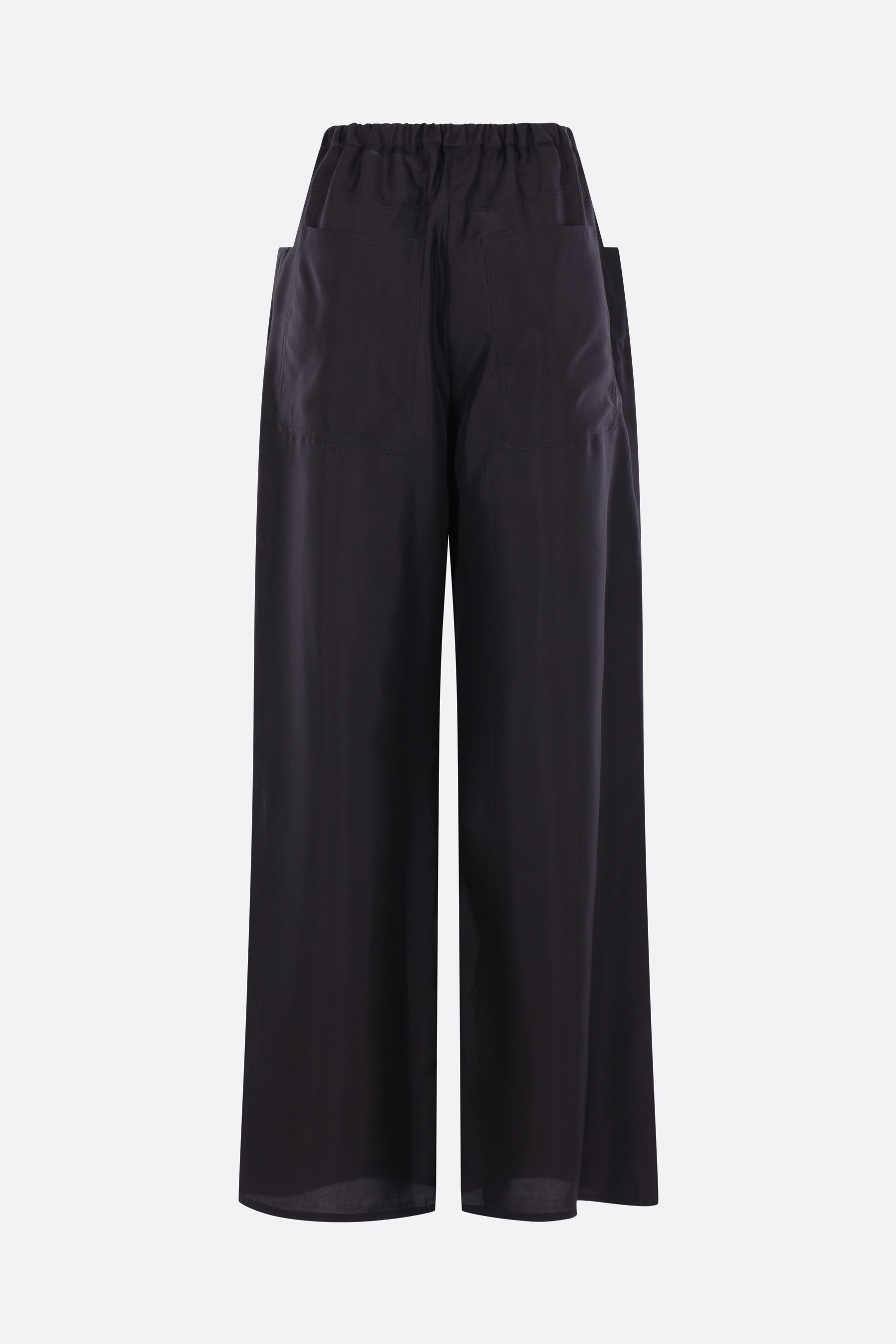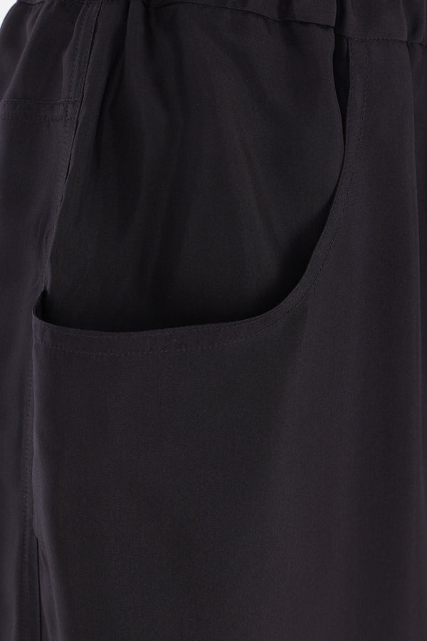 Ter et Bantine wide-leg trousers made of black silk. Features an elasticated waistband, multiple pockets, and an unlined interior.