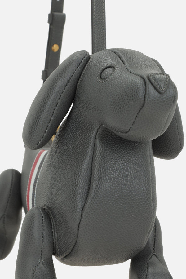Thom Browne handbag crafted from dark grey Pebble Grain leather with a printed tricolor stripe centered on both sides. Featuring gold-tone hardware, zip closure, and adjustable handle. The tricolor fabric-lined interior includes a flat pocket.