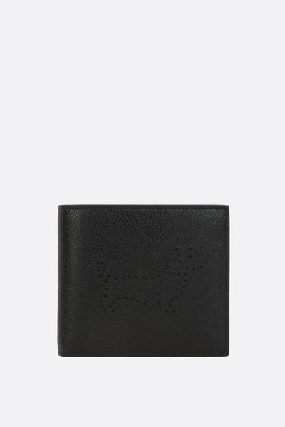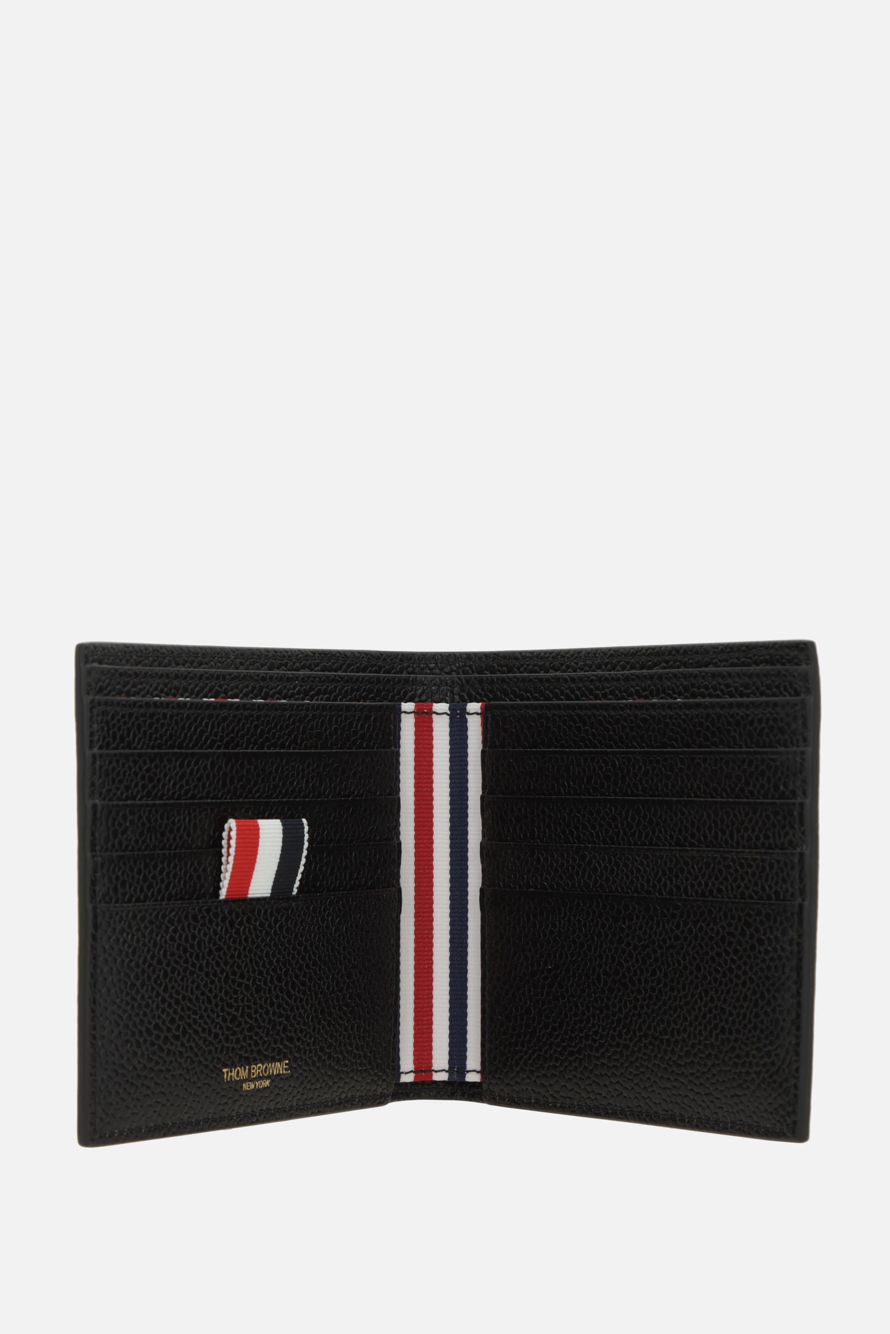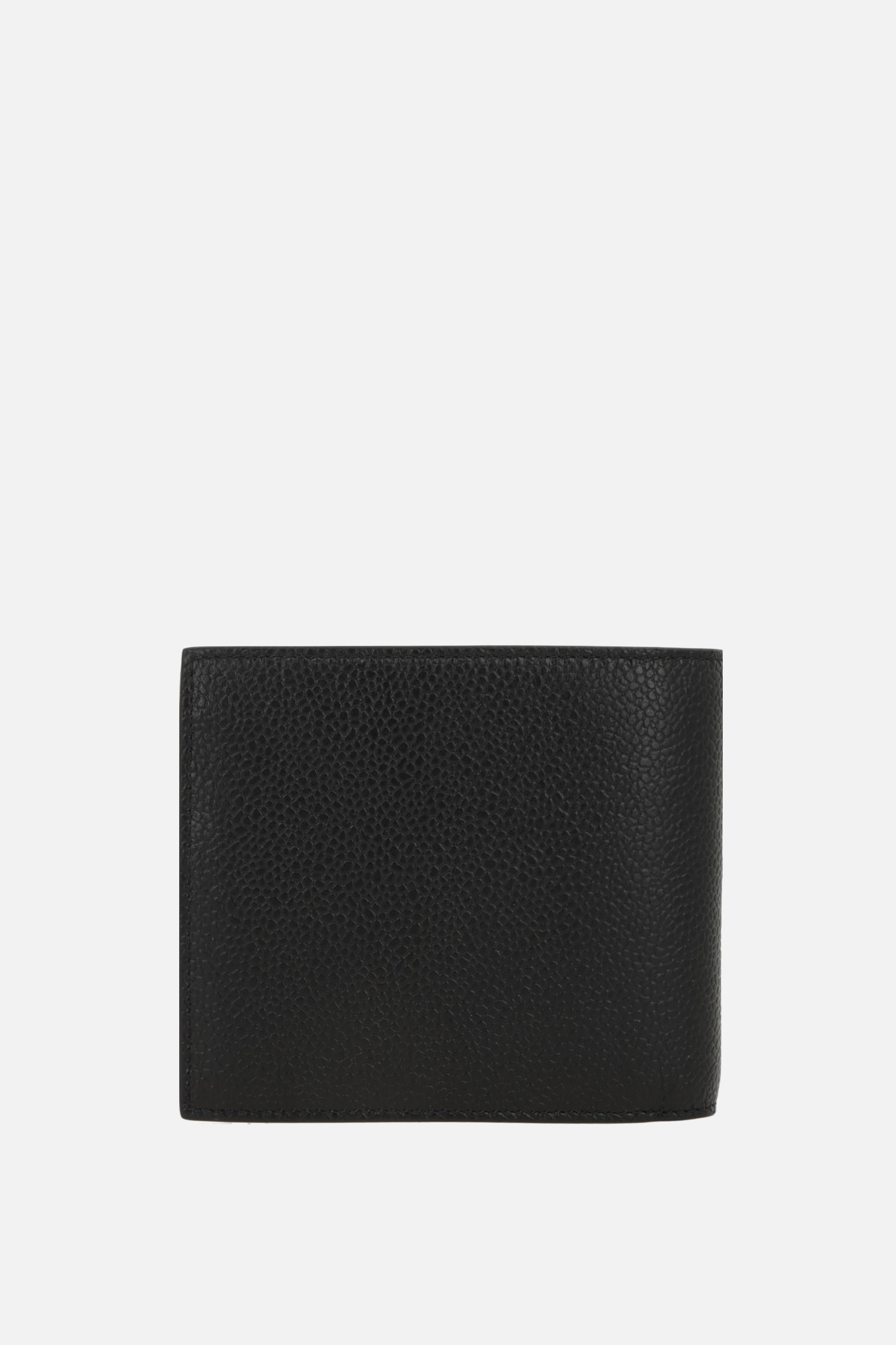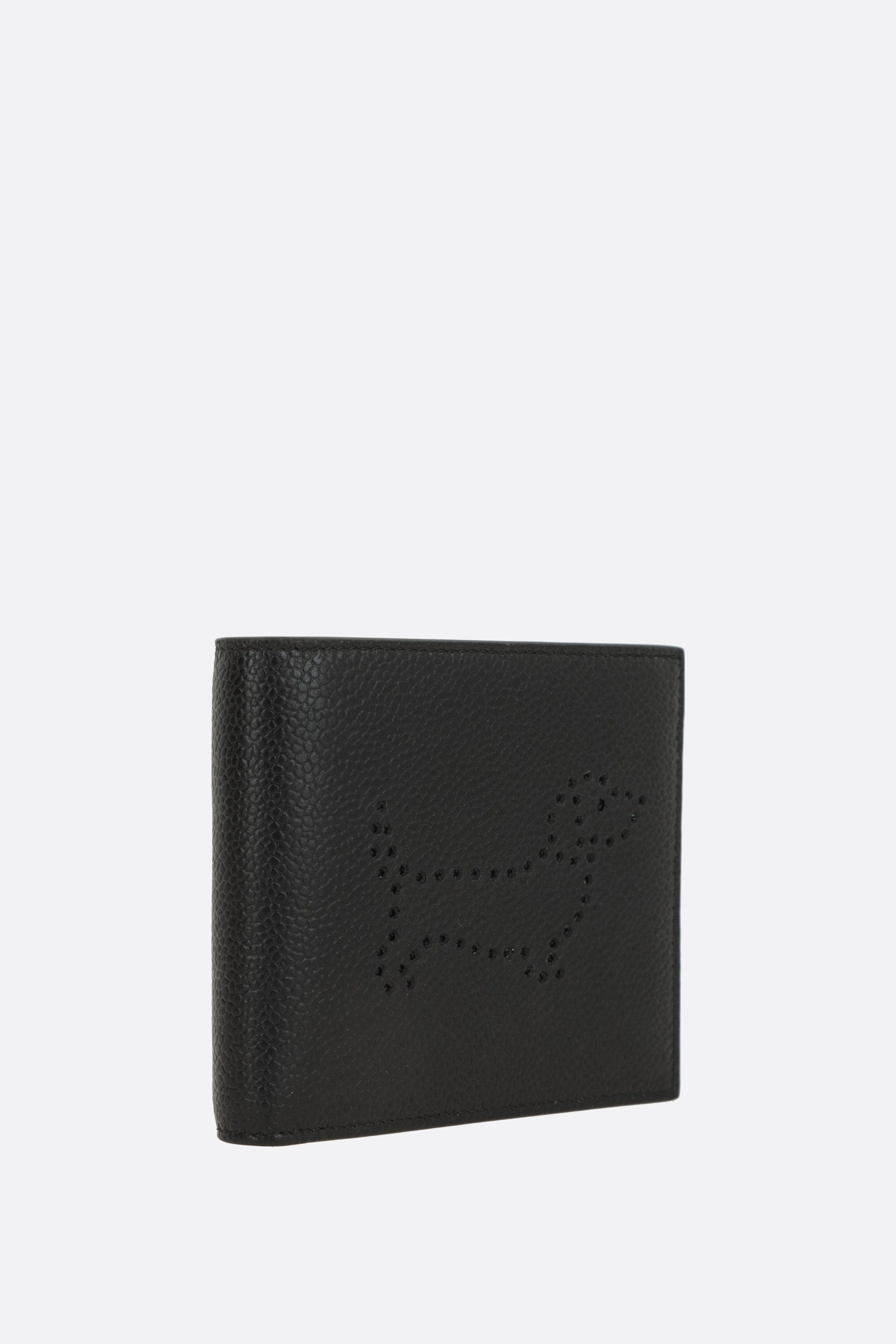 Thom Browne wallet crafted from Pebble Grain leather with perforated Hector detail on the front. Features two bill compartments and eight card slots. Interior lined in tricolor fabric.