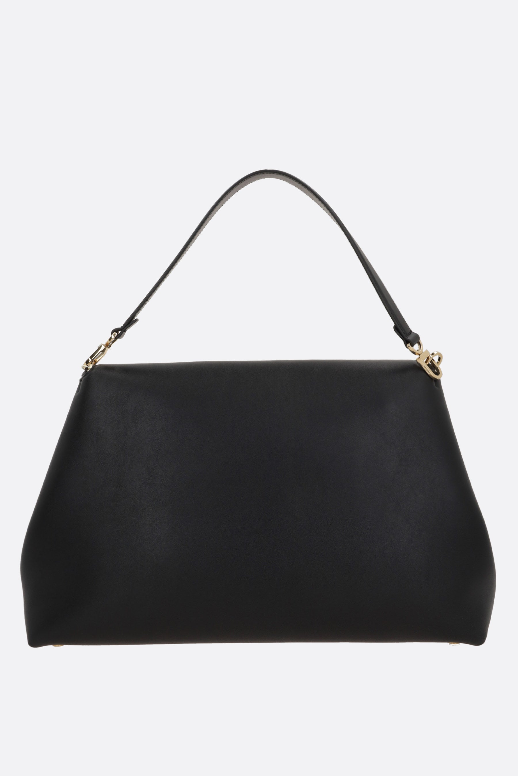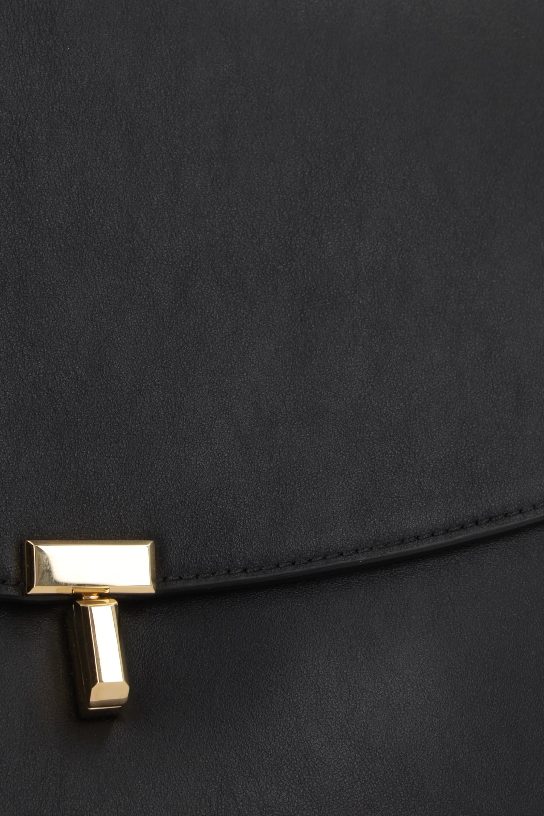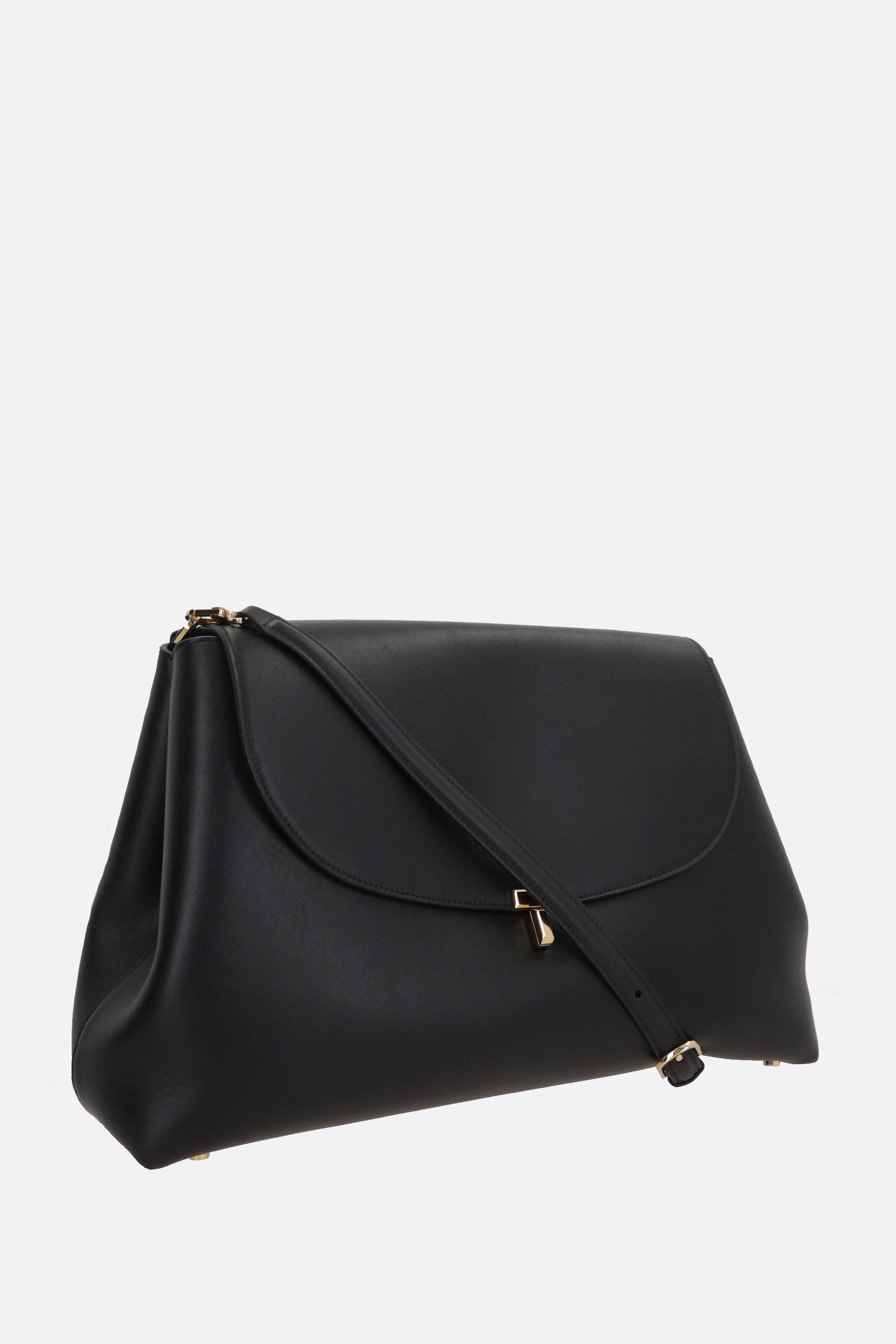 Toteme shoulder bag made of smooth black leather. Featuring gold-tone hardware, twist-lock closure on the flap, removable top handle, adjustable/removable shoulder strap, and metal protective feet. The beige microsuede-lined interior includes two flat pockets.