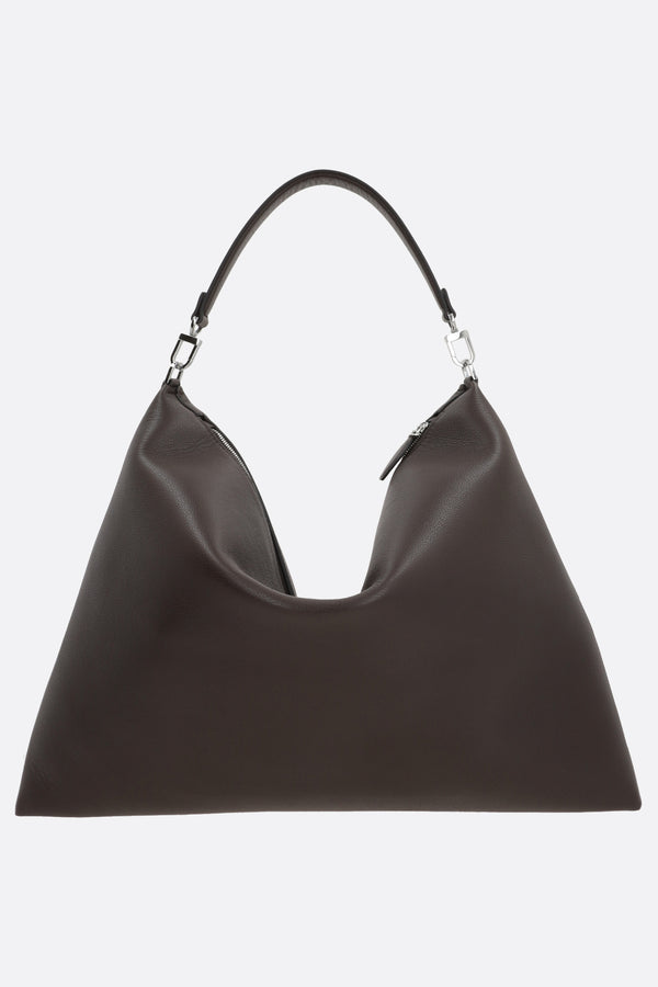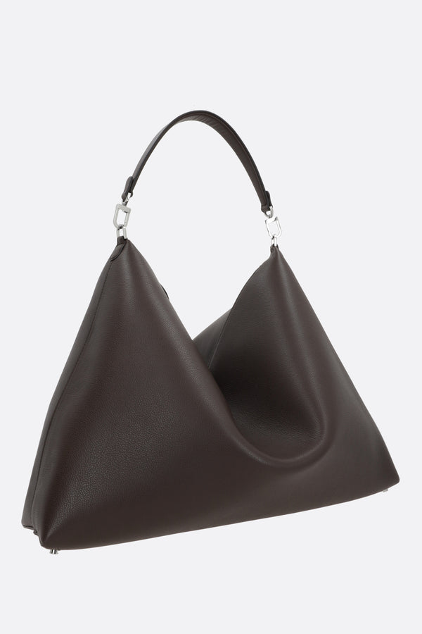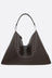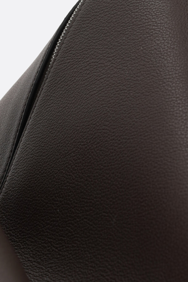 Toteme hobo bag crafted from dark brown pebbled leather with front printed logo lettering. Featuring silver-tone hardware, a zip closure, a detachable handle, and metal protective feet. The beige suede-lined interior is fitted with a flat pocket.