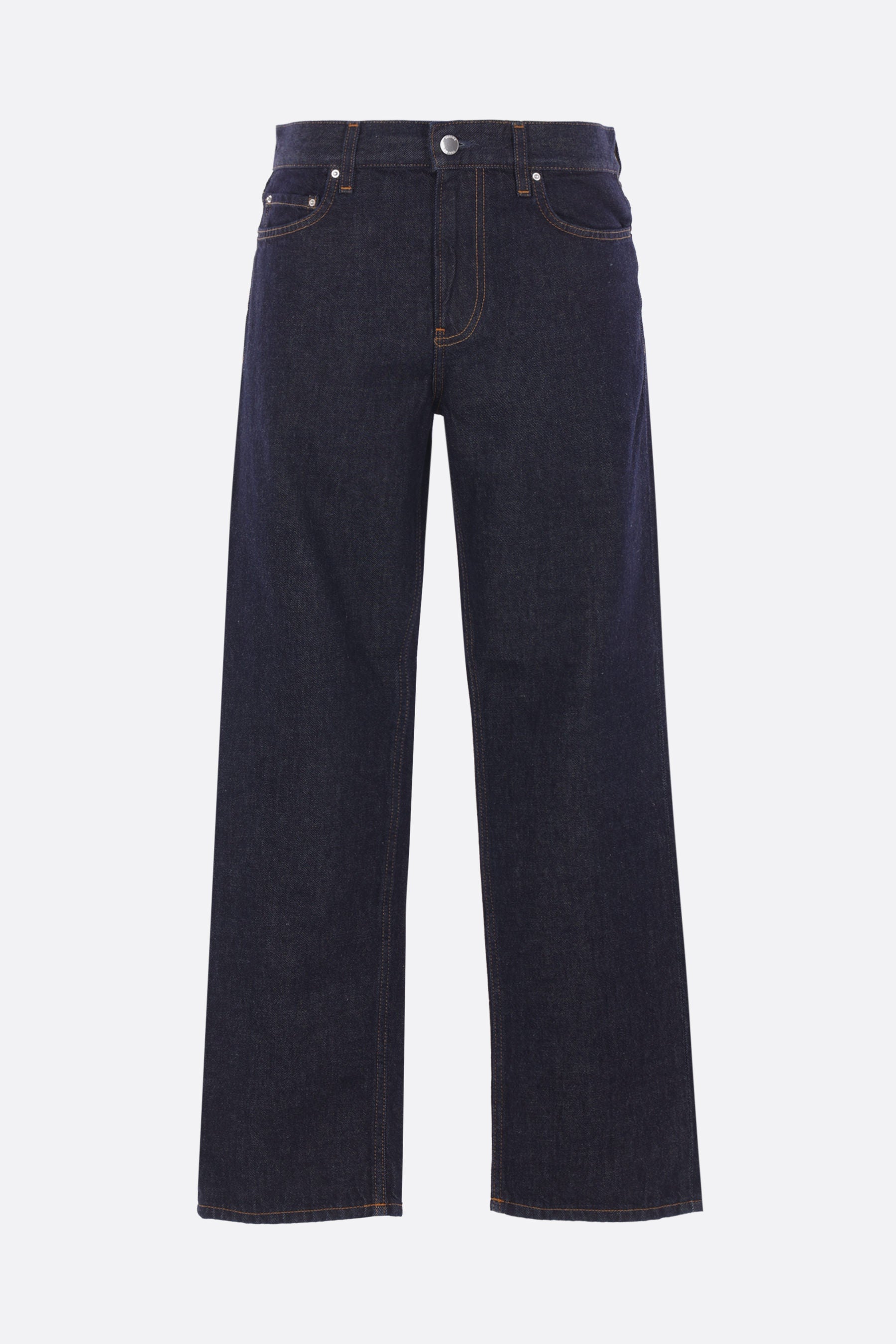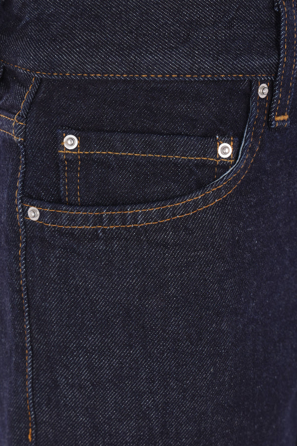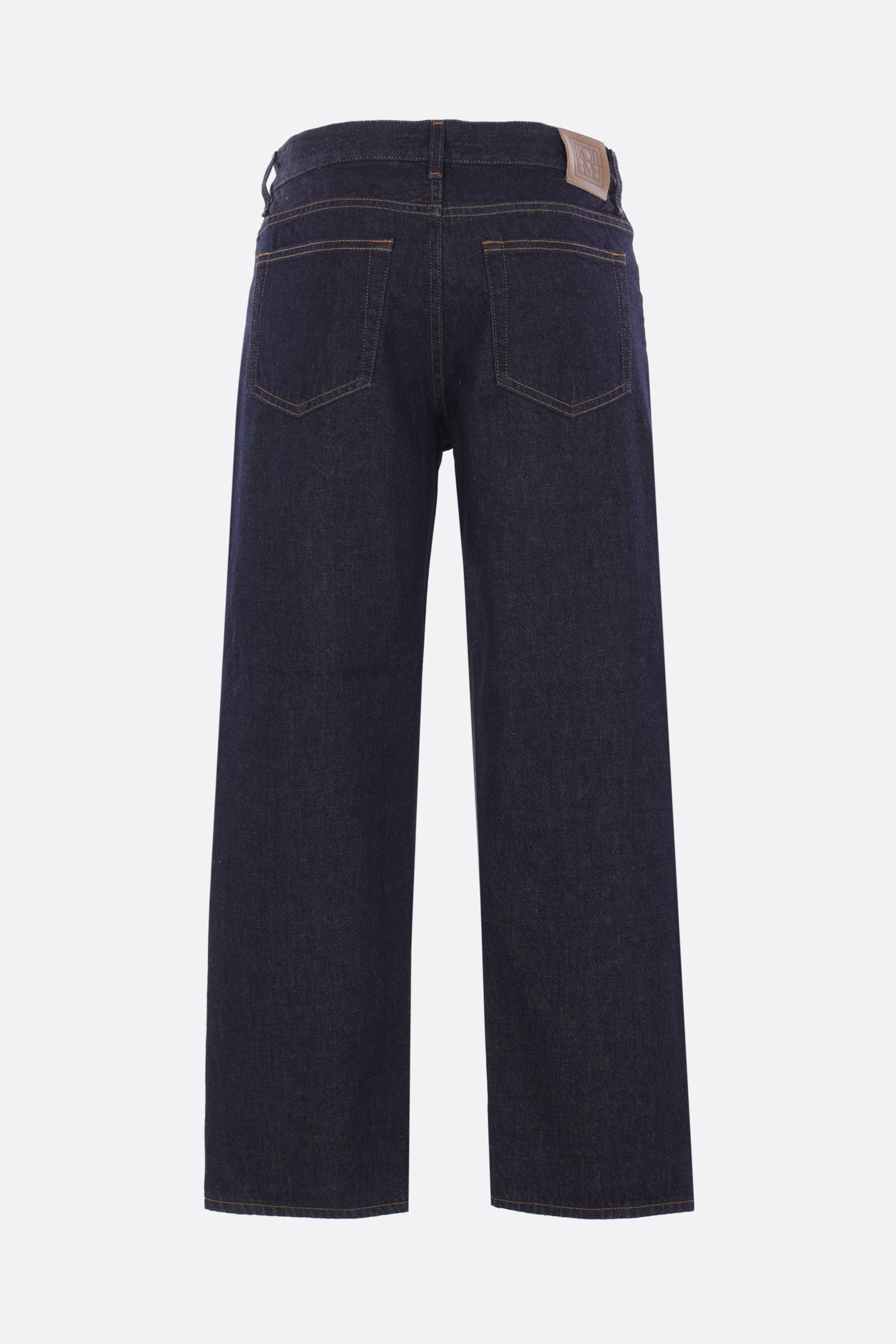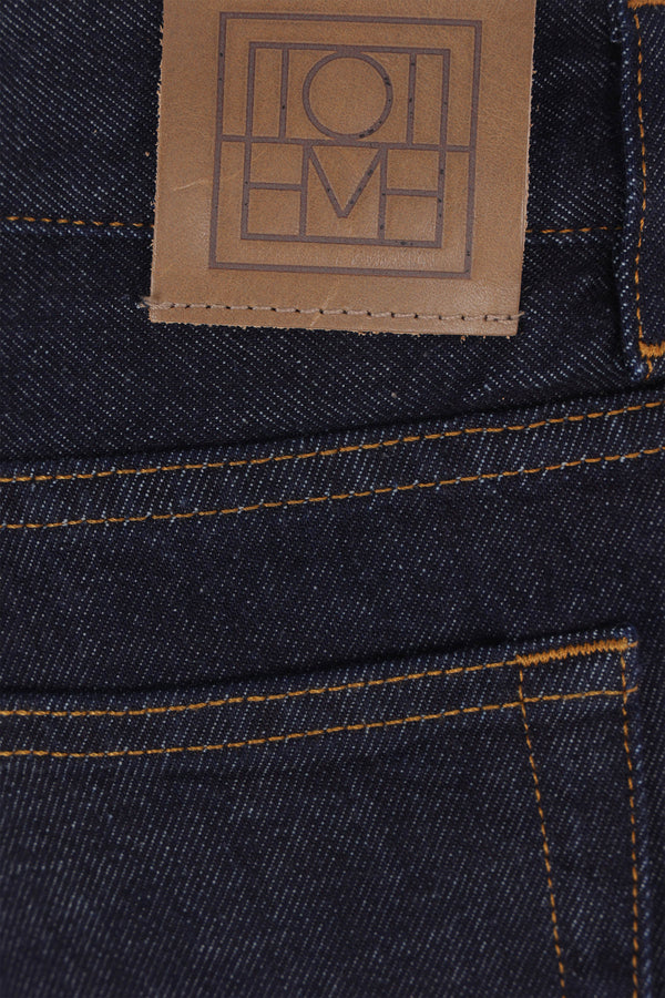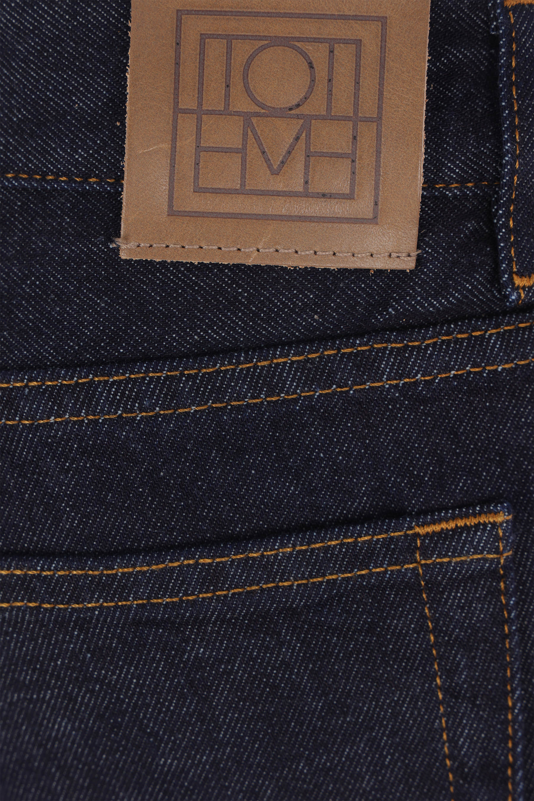 Toteme jeans crafted from dark blue organic cotton denim. Featuring a front closure with metal button and zip, belt loops, five classic pockets, and a logo patch on the back.