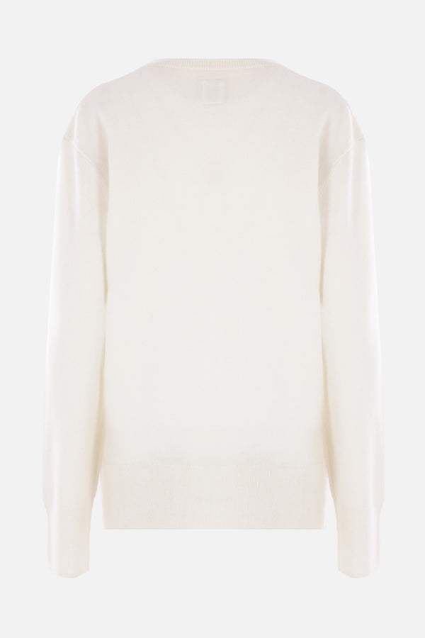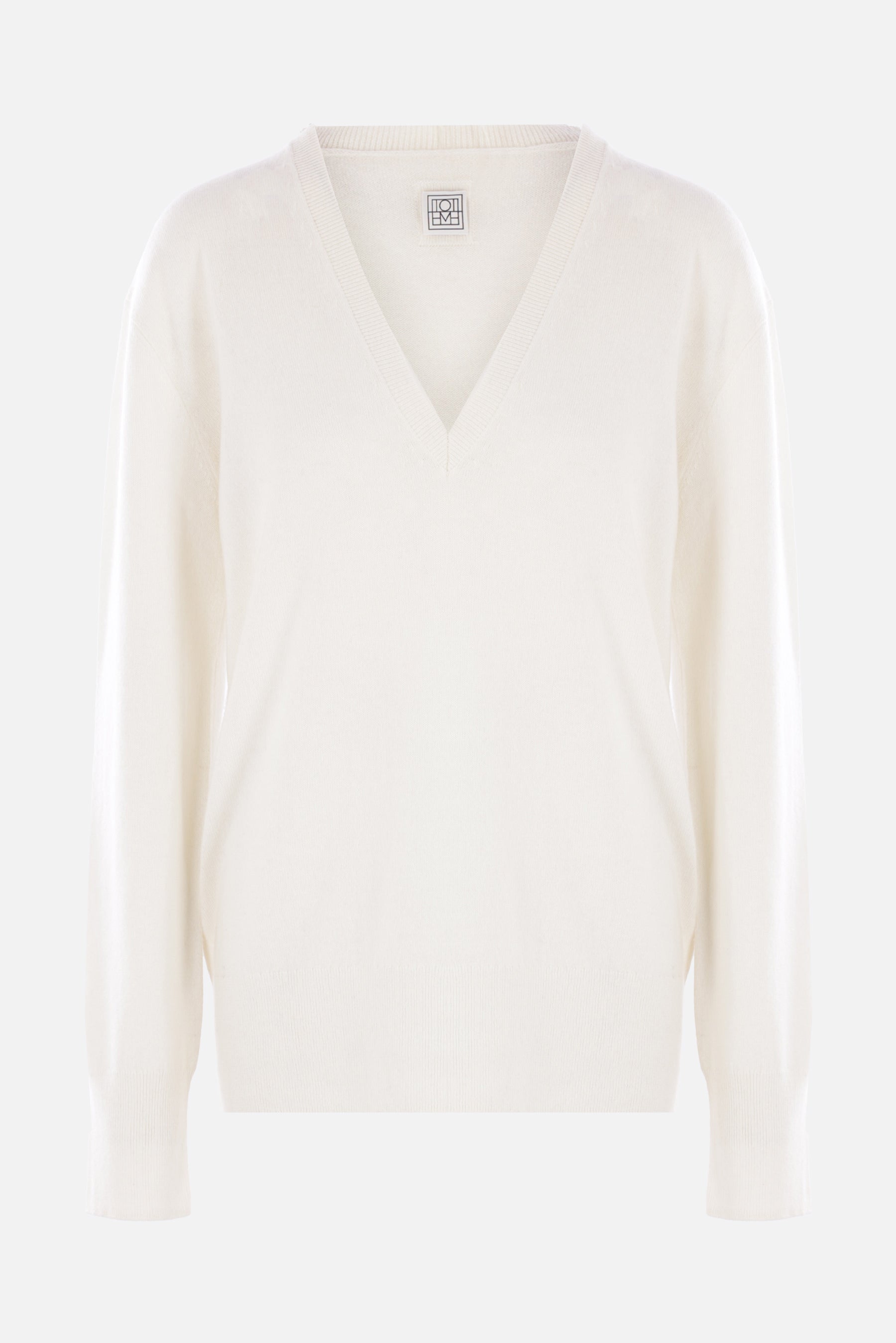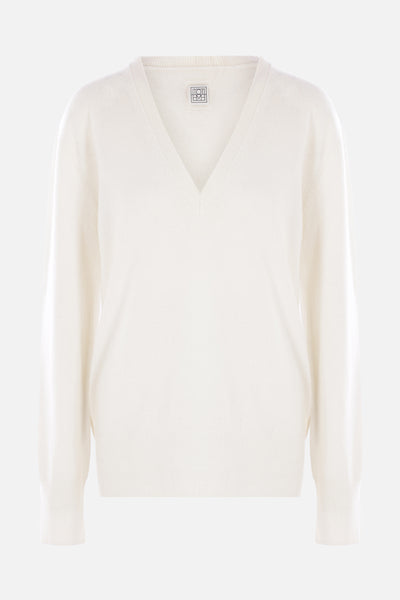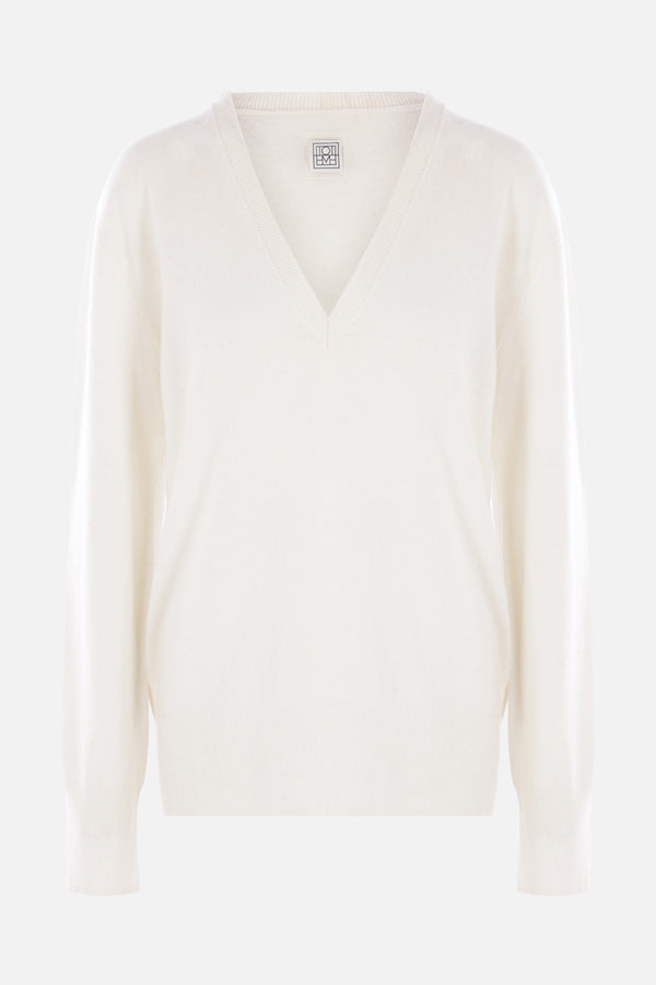 Toteme sweater made of ecru-colored cashmere knit. Featuring a V-neckline, long sleeves, ribbed trims, and a straight hem.