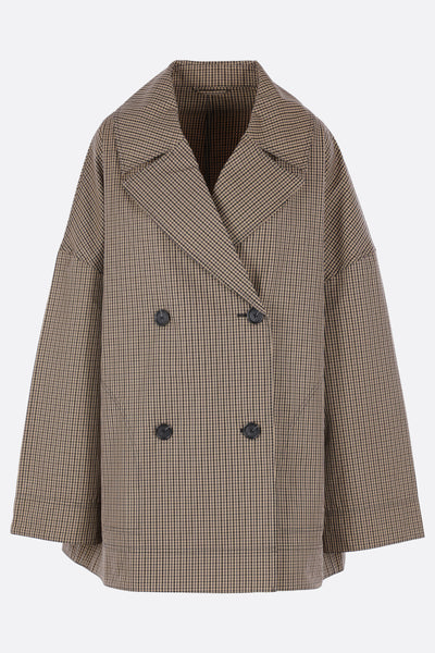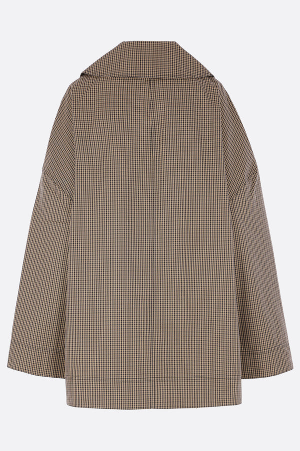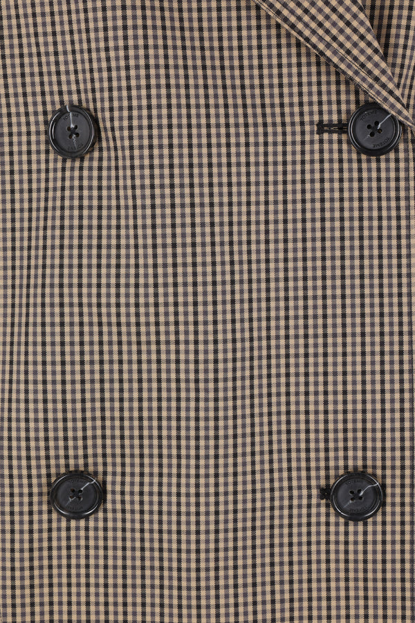Toteme oversized trench crafted in check cotton in beige and black tones. Featuring wide lapels, double-breasted button closure, welt pockets, long sleeves, straight hem, and unlined interior.