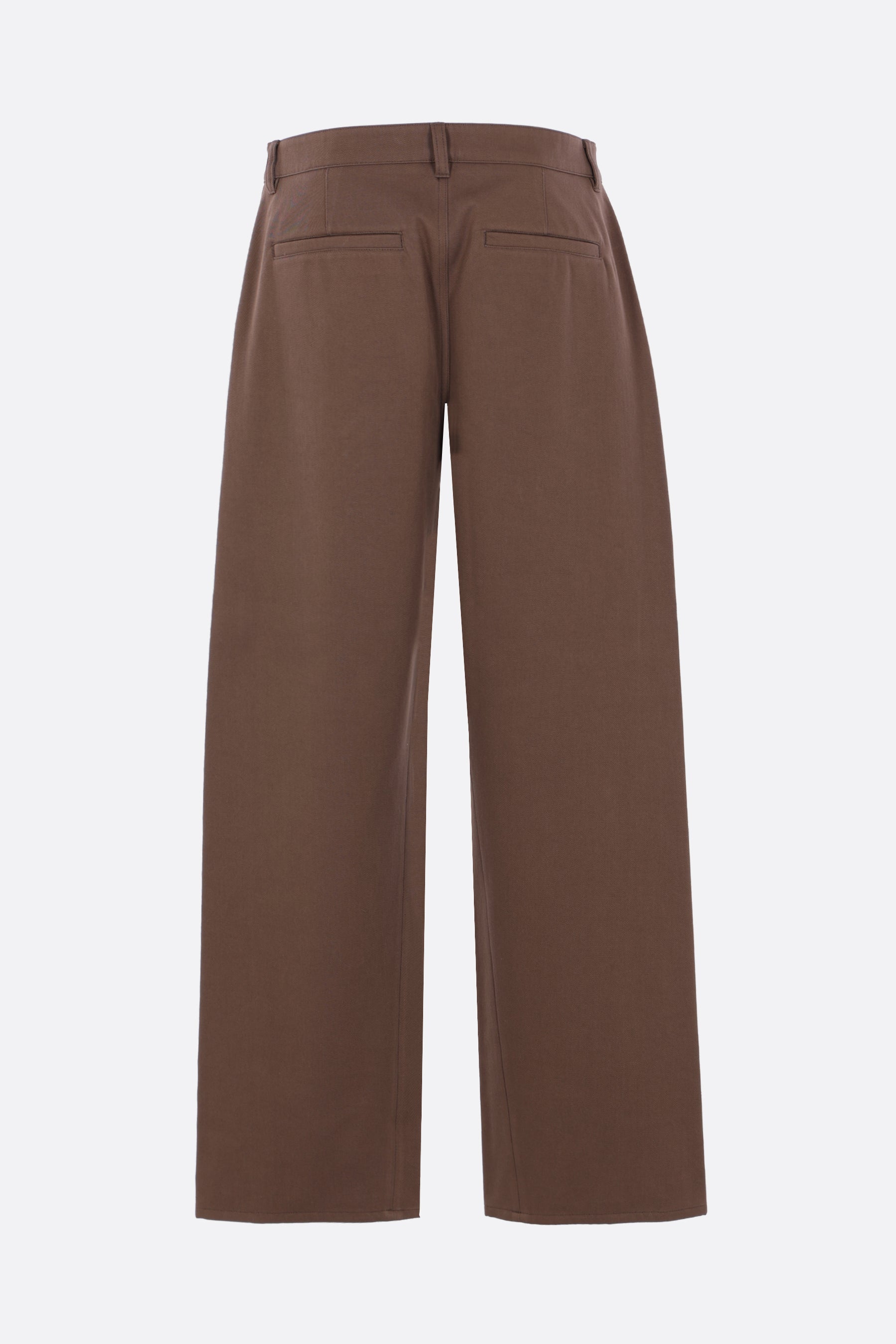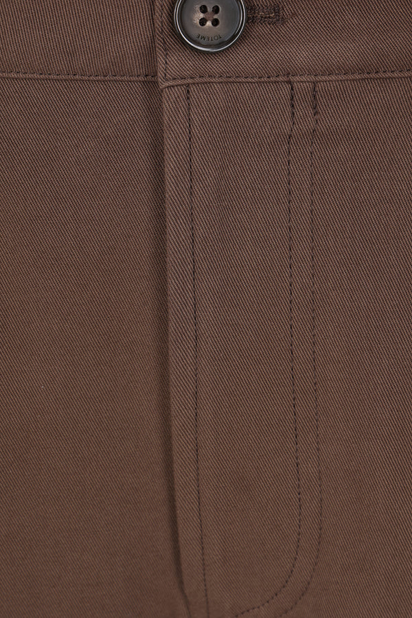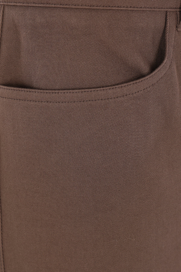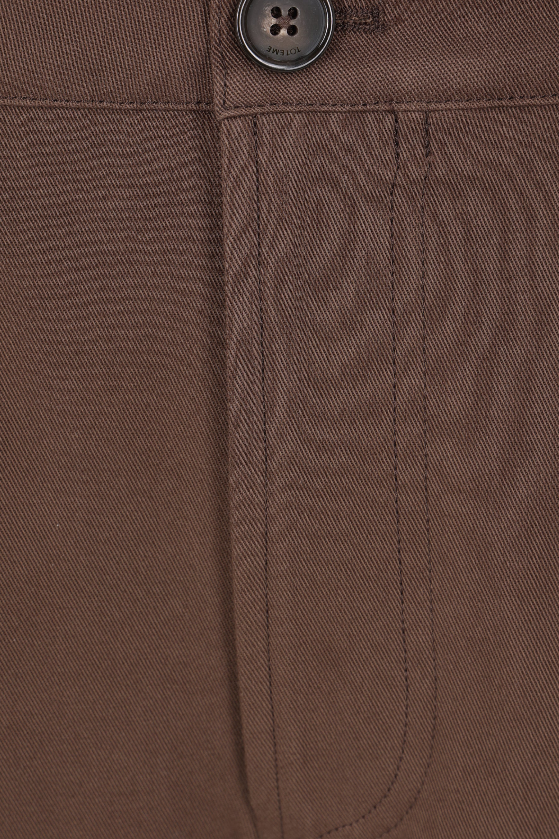 Toteme trousers crafted in brown khaki cotton gabardine. Featuring front button-and-zip closure, belt loops, multiple pockets, and twisted seams.