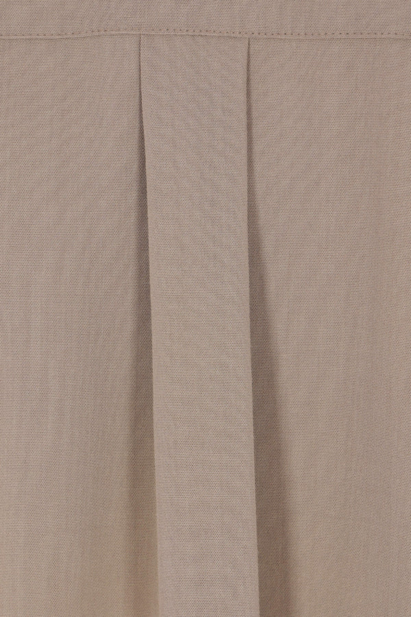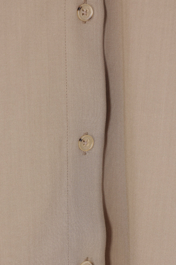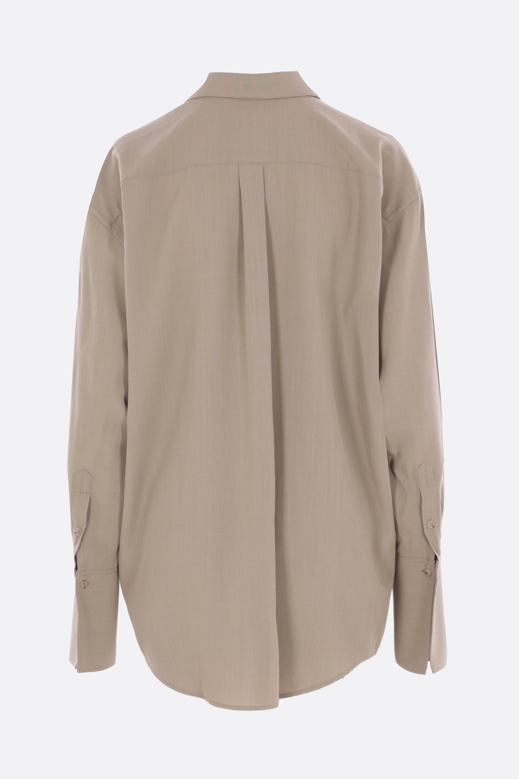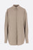 Toteme oversized shirt crafted from taupe-colored viscose and wool. Featuring a classic collar, front button closure, long sleeves with buttoned cuffs, and a rounded hem.