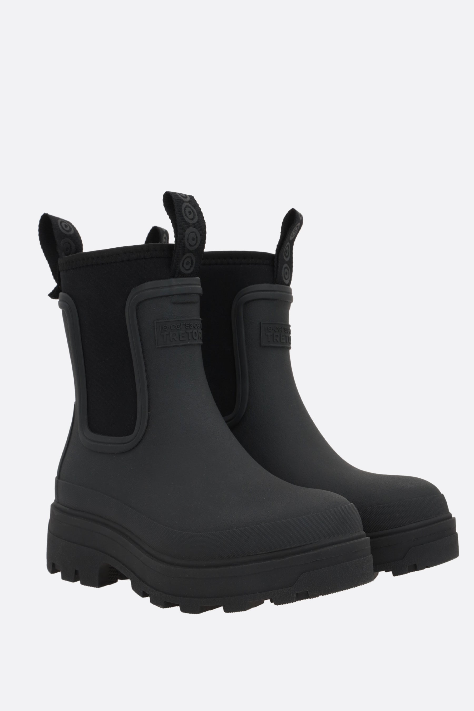 Tretorn x 10 Corso Como's rain boots crafted in black rubber with neoprene insert at the ankle. Featuring a round-toe silhouette, fabric lining and lug rubber sole. The design is completed by the iconic 10 Corso Como Tretorn patch on front and nylon loops with signature circles print.