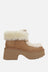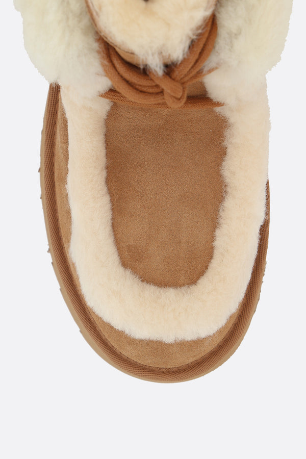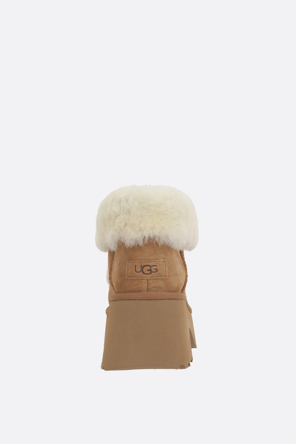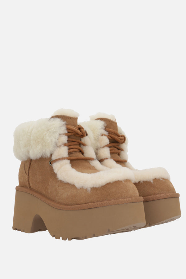 Ugg platform ankle boots crafted from light brown suede. Featuring lace-up fastening, a round toe, UGGplush™ regenerated wool and lyocell lining, and a sugarcane EVA sole. The design is completed with the iconic Ugg patch at the heel.