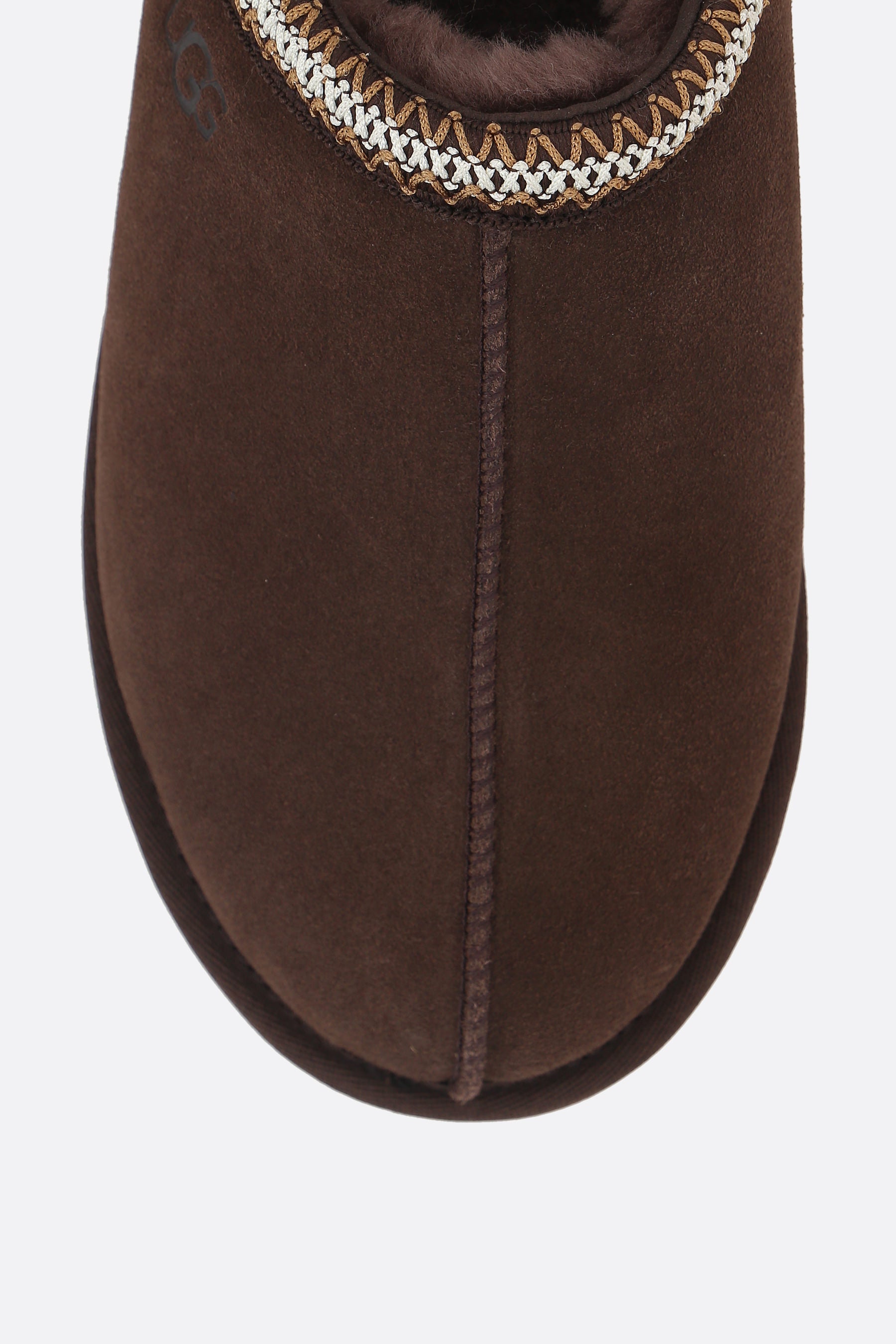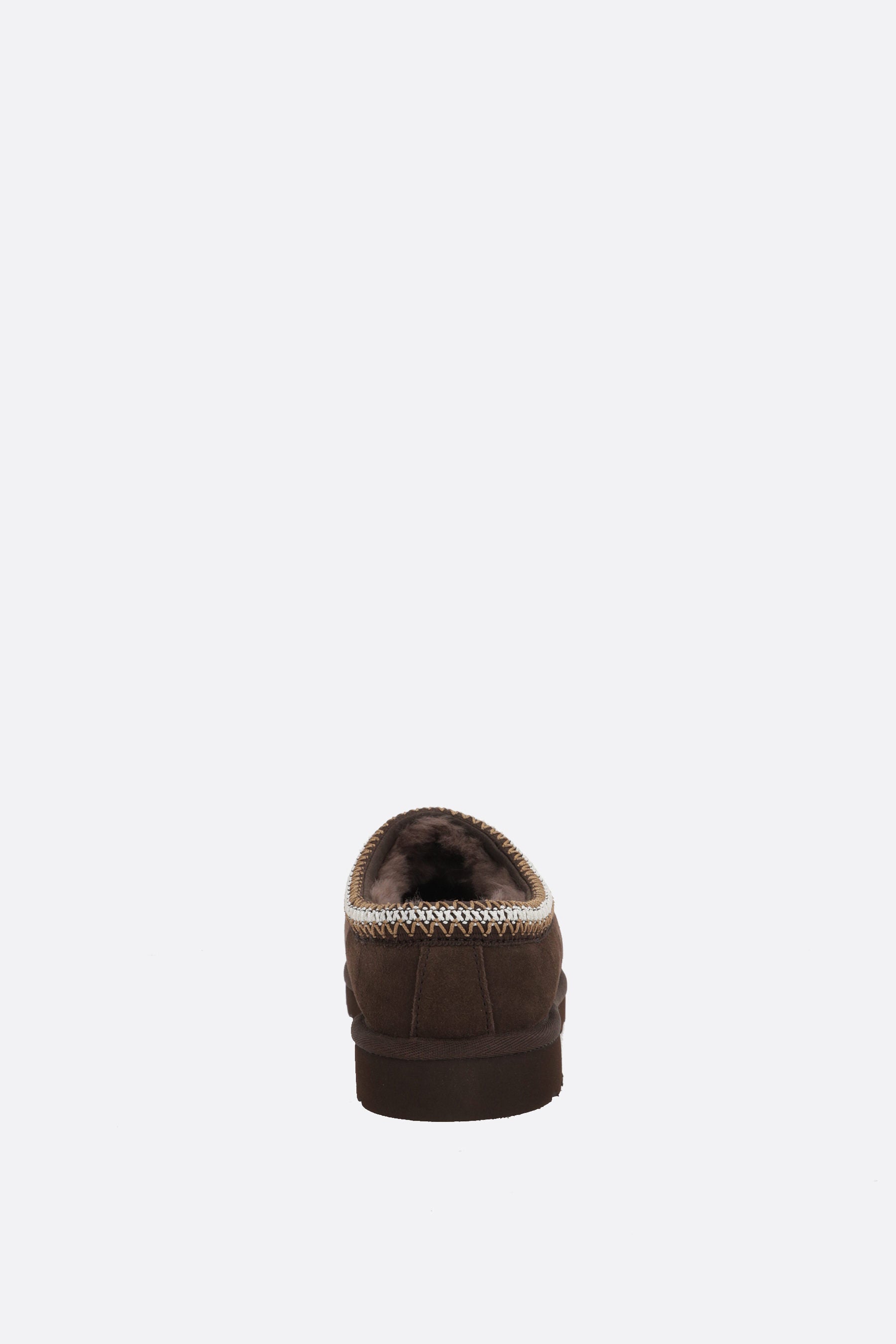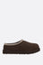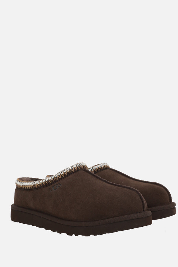 Ugg slippers crafted from dark brown suede with embroidered trim in recycled fabric. Featuring a round toe, shearling lining, and an EVA outsole made from sugarcane. The design is completed by the iconic embossed logo on the side.