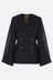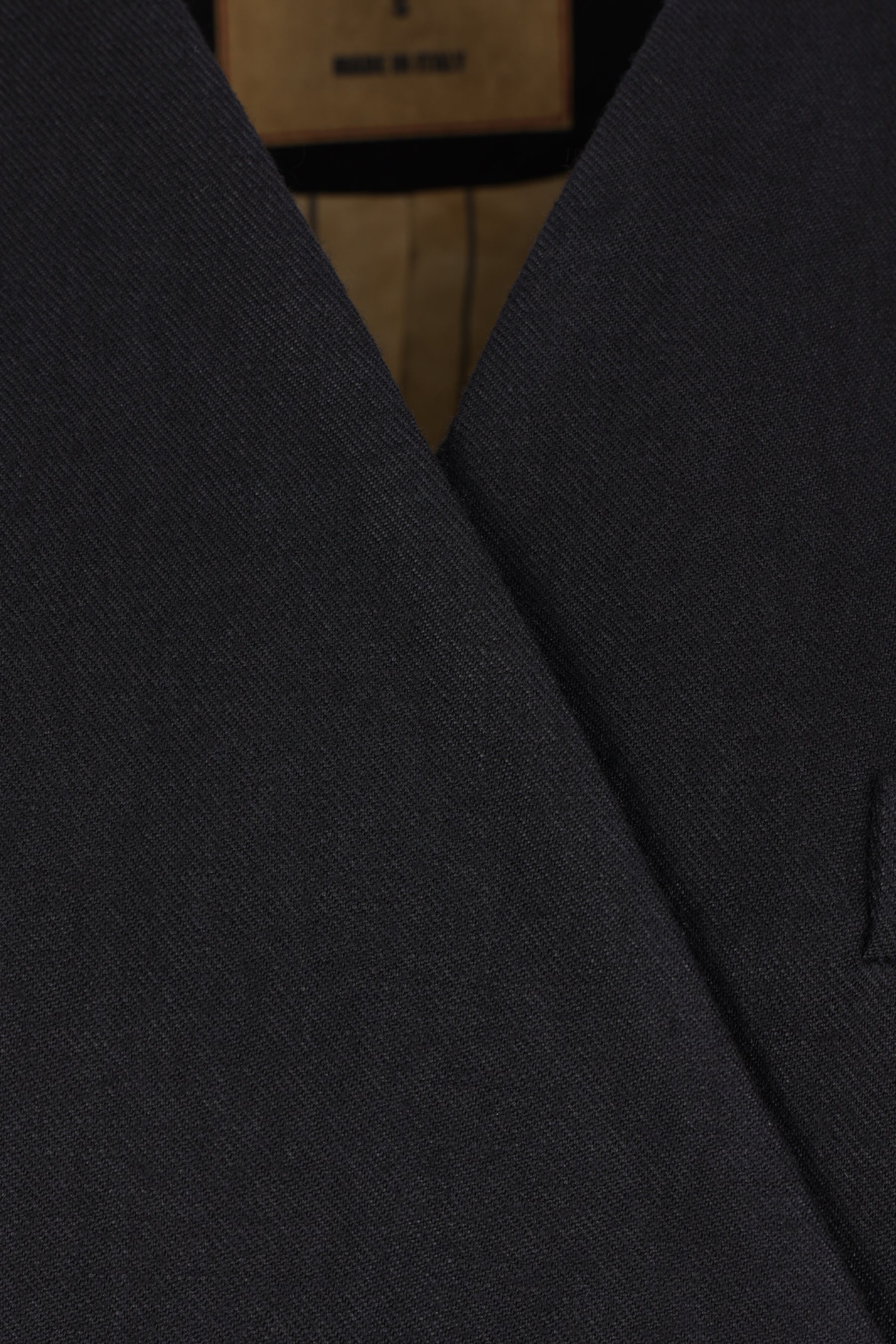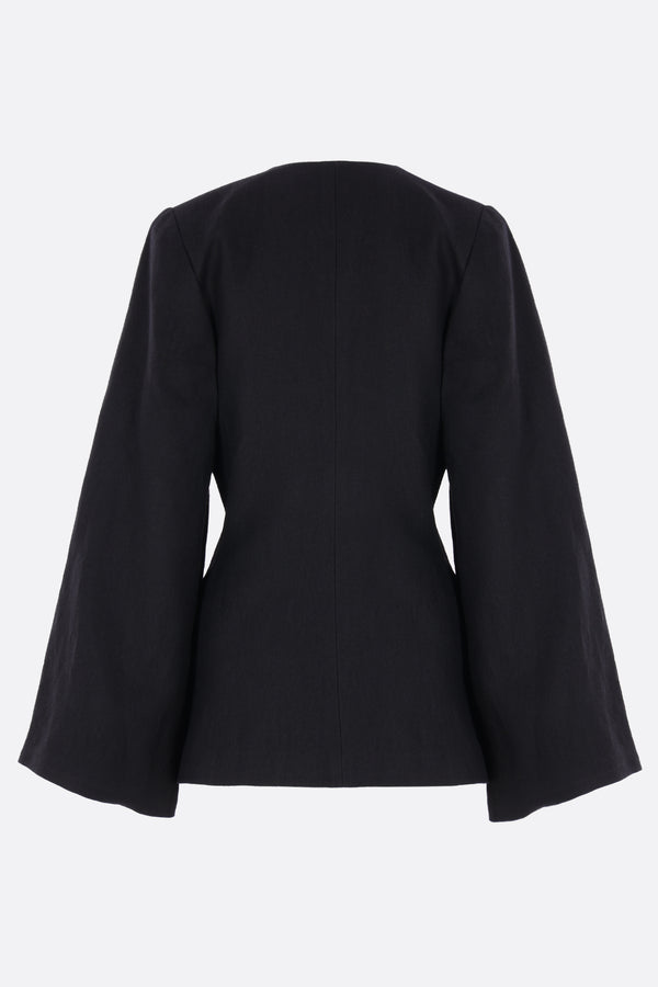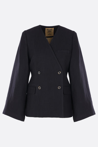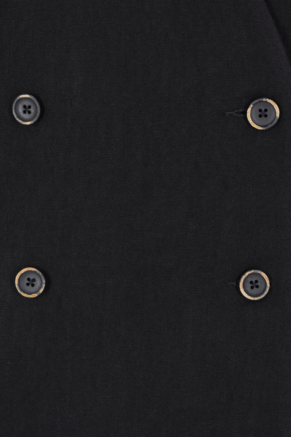 Uma Wang double-breasted jacket crafted from black linen and wool gabardine. Featuring V-neckline, front button closure, padded shoulders, wide sleeves, front pockets, straight hem, and lined interior.