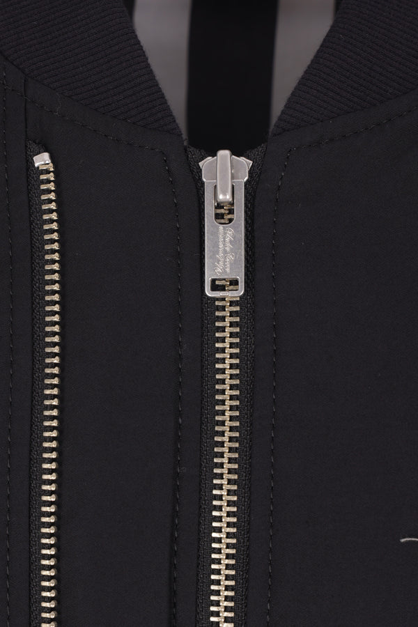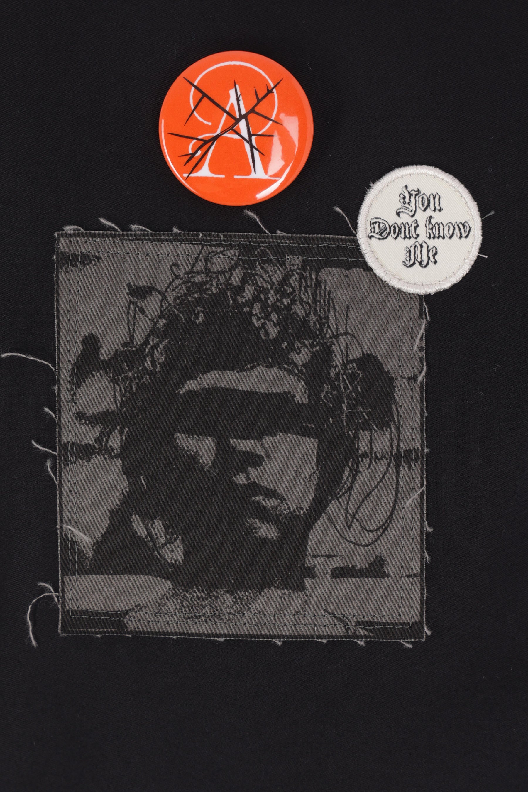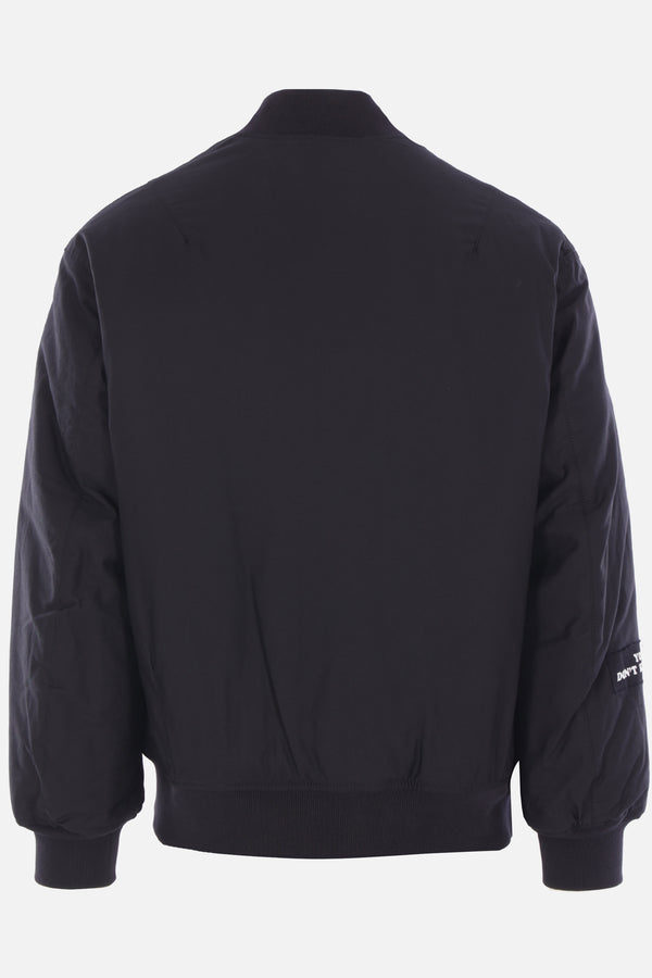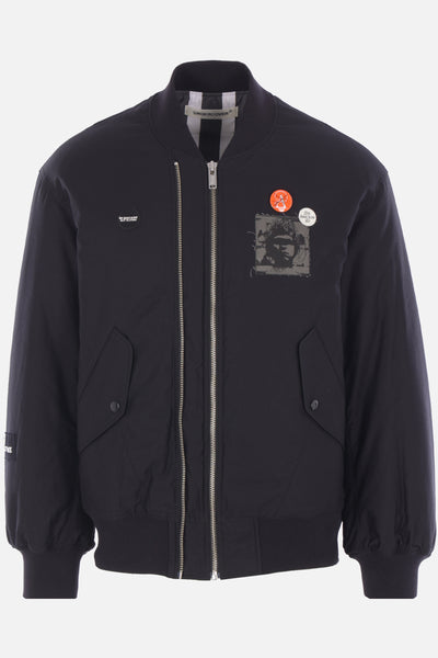 Undercover padded bomber jacket made of black cotton, featuring graphic patches and a pin applied on the chest. Designed with a bomber collar, front zip closure, flap pockets, long sleeves, and ribbed knit trims.