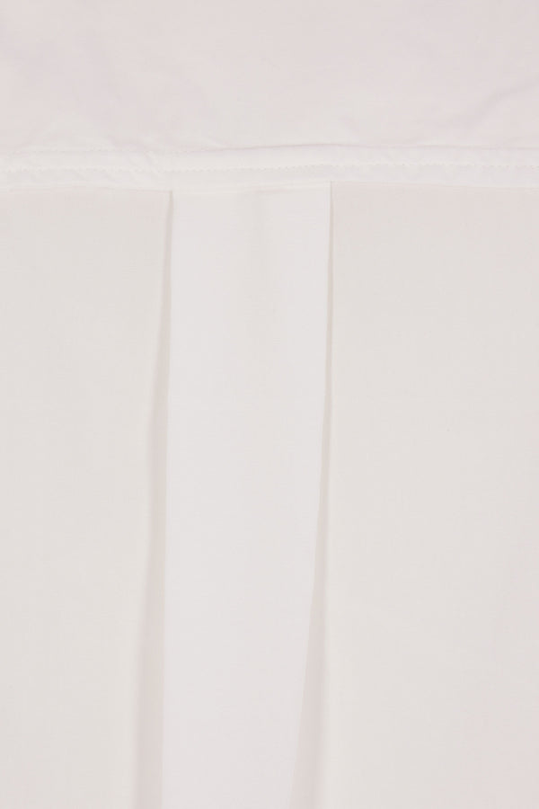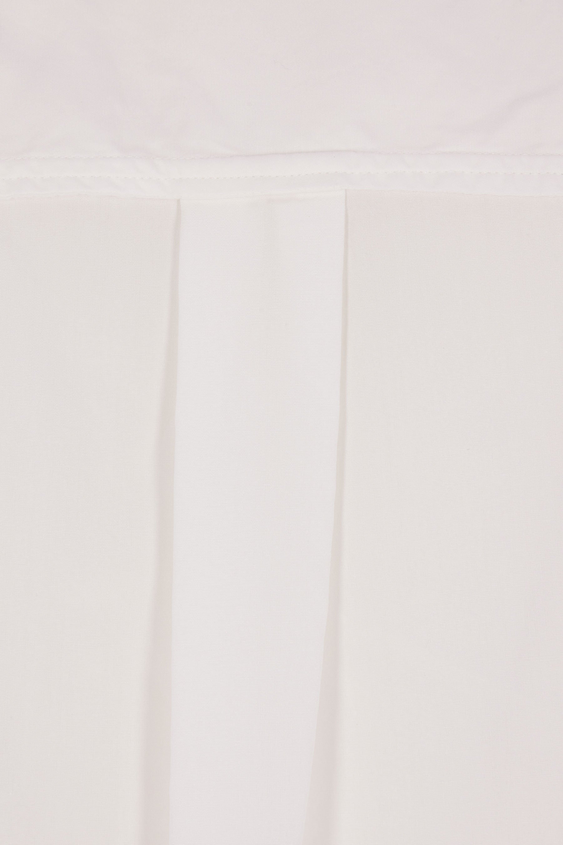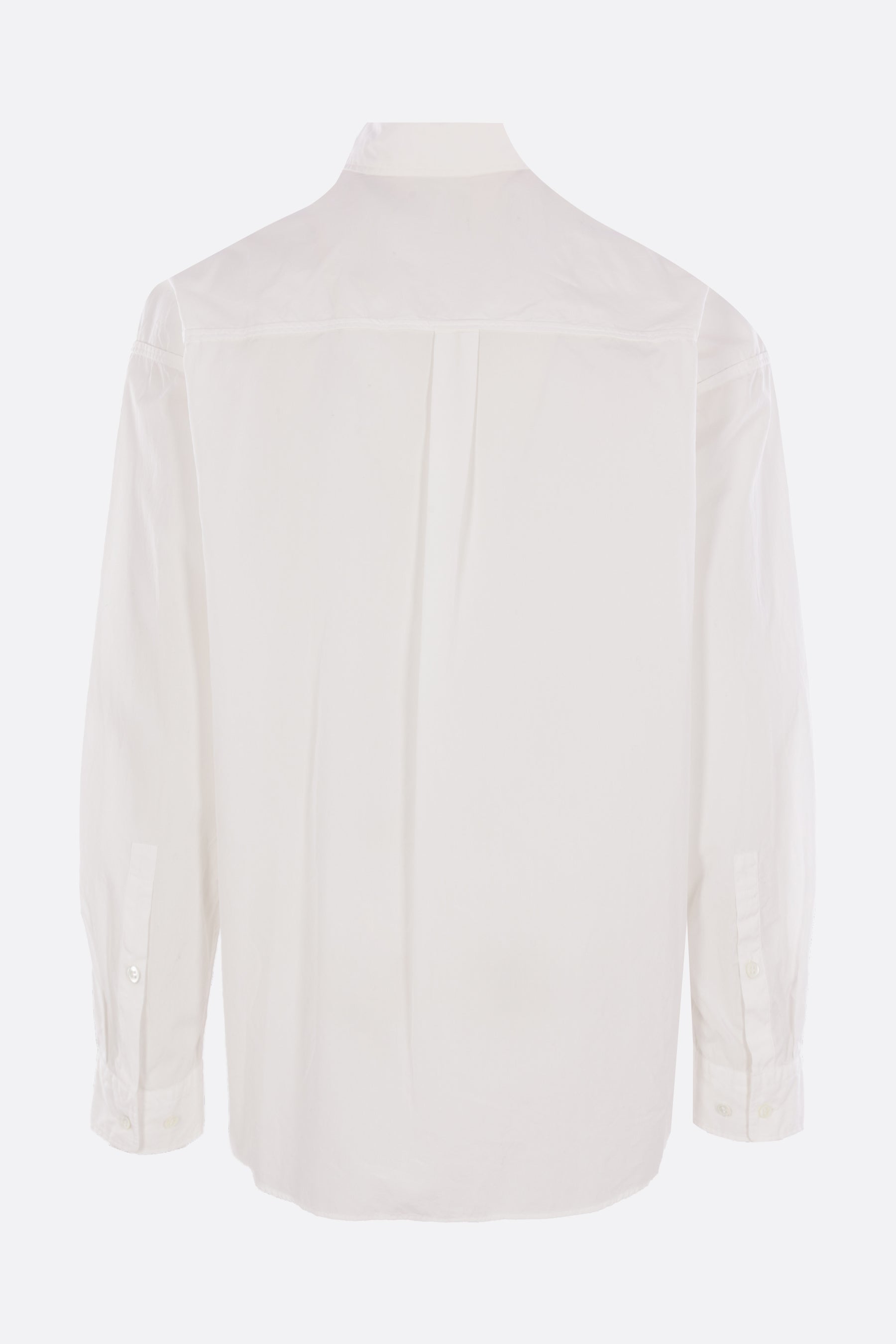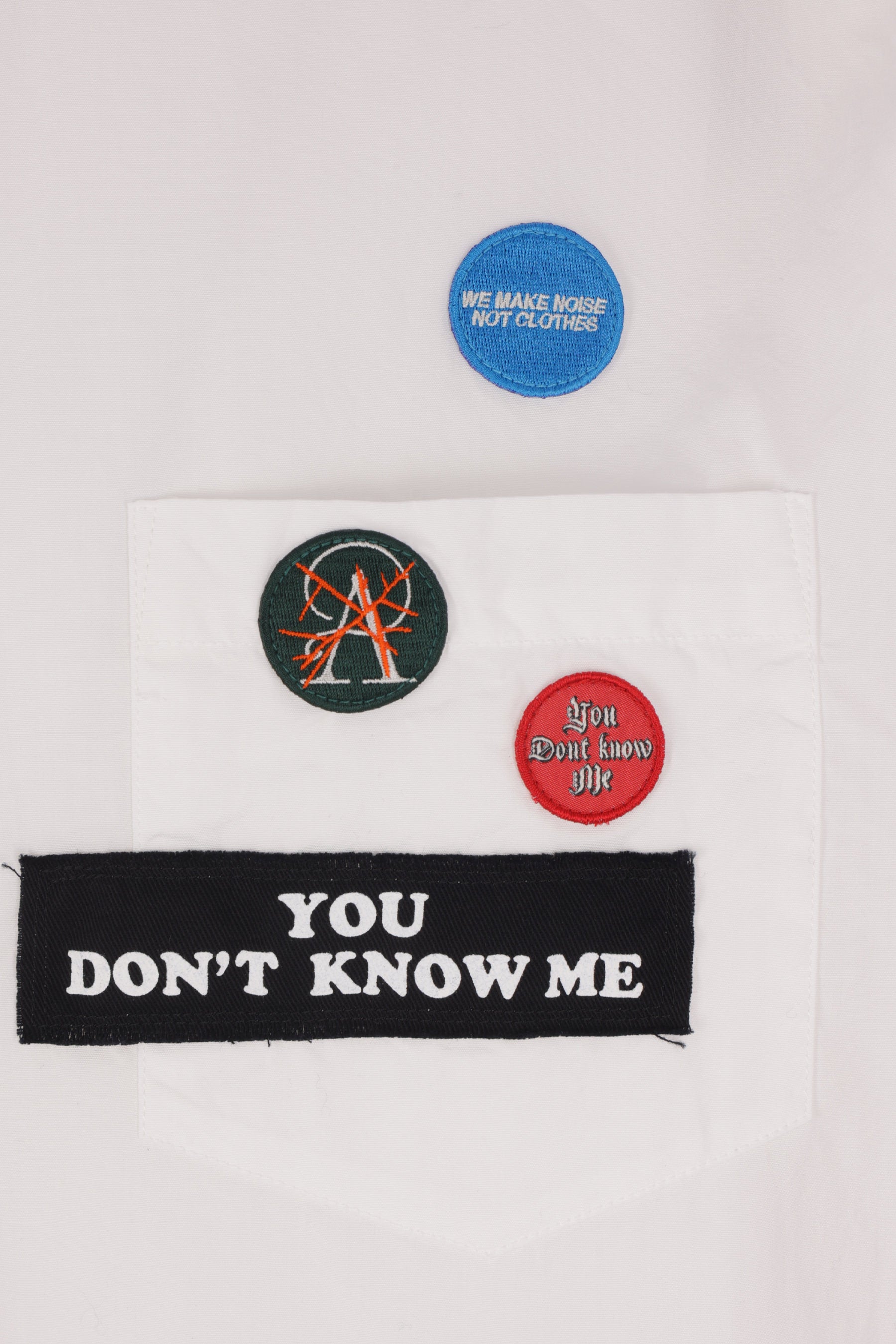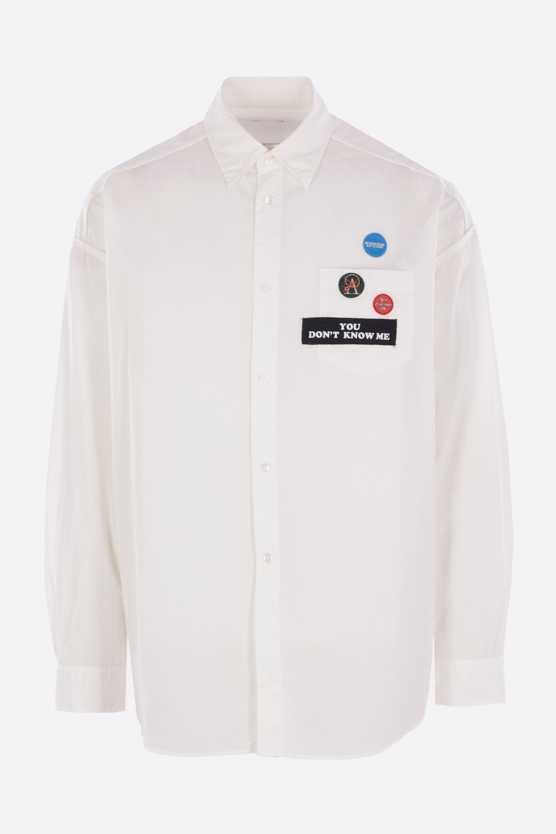 Undercover oversized shirt made of white cotton. Featuring a classic collar, front button closure, chest patch pocket with multicolored patches, buttoned side pockets, long sleeves with buttoned cuffs, and a rounded hem.