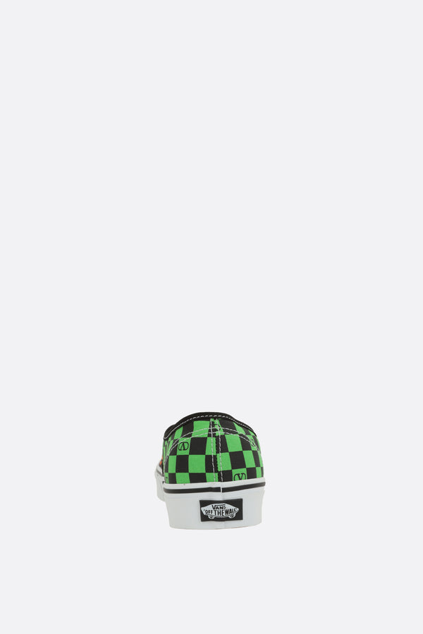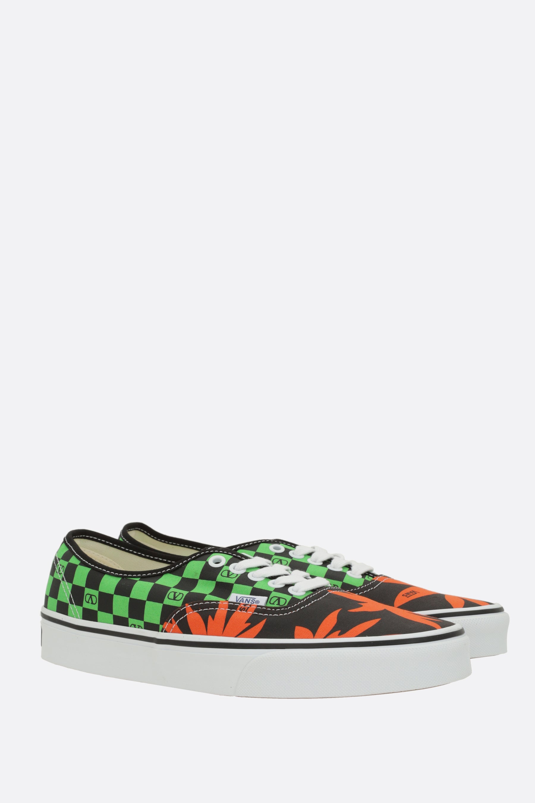 Valentino Garavani and Vans low-top sneakers crafted from canvas with VLogo Checkerboard and Tropical Leaves print. Featuring lace-up closure, rounded toe, fabric lining, and Vans Authentic Original rubber sole.