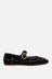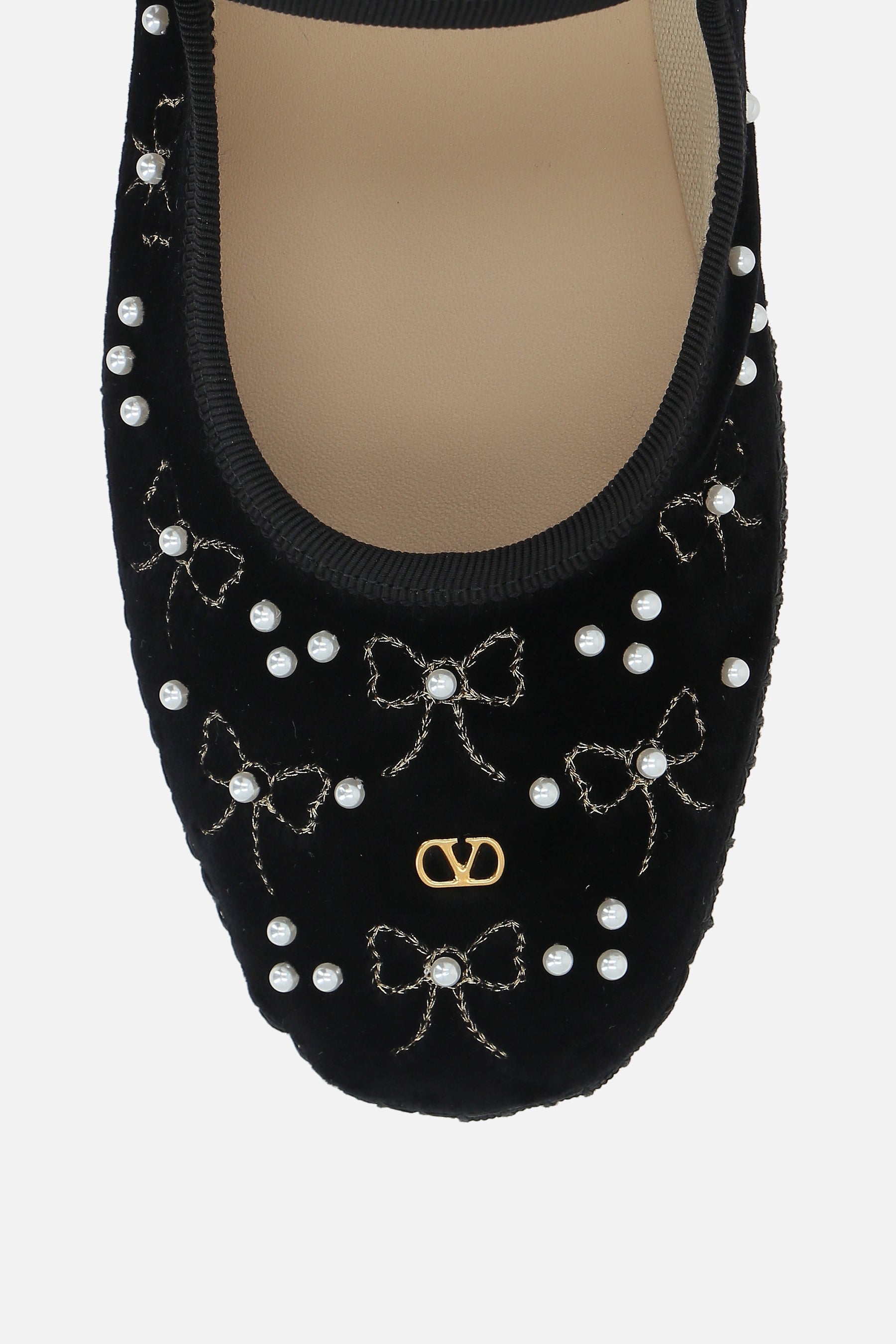 Valentino Garavani mary-jane ballerinas made of black velvet with metallic thread embroidery and synthetic pearls in a bow motif. Featuring an adjustable strap with metal buckle, round toe, leather/fabric lining, and rubber sole.