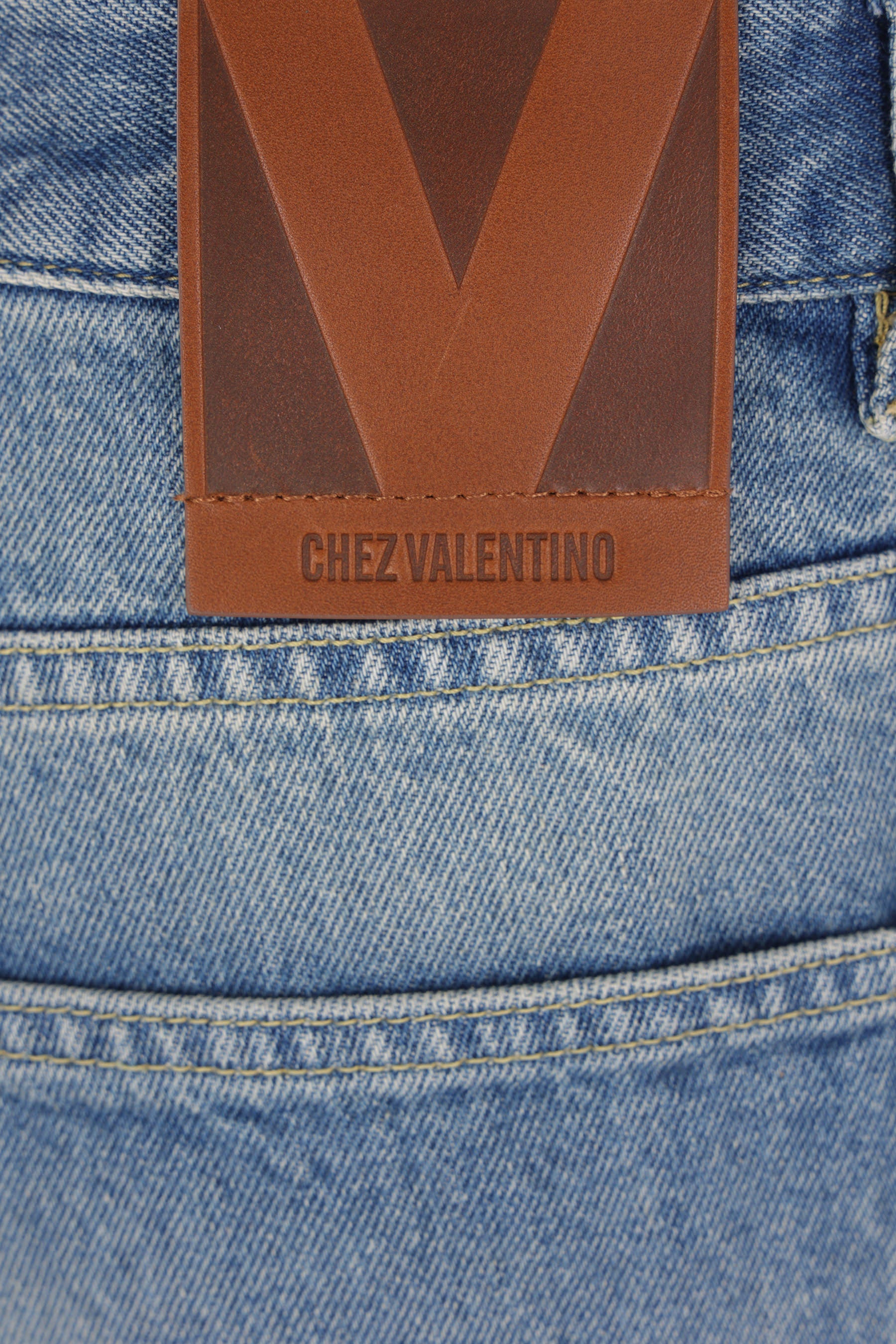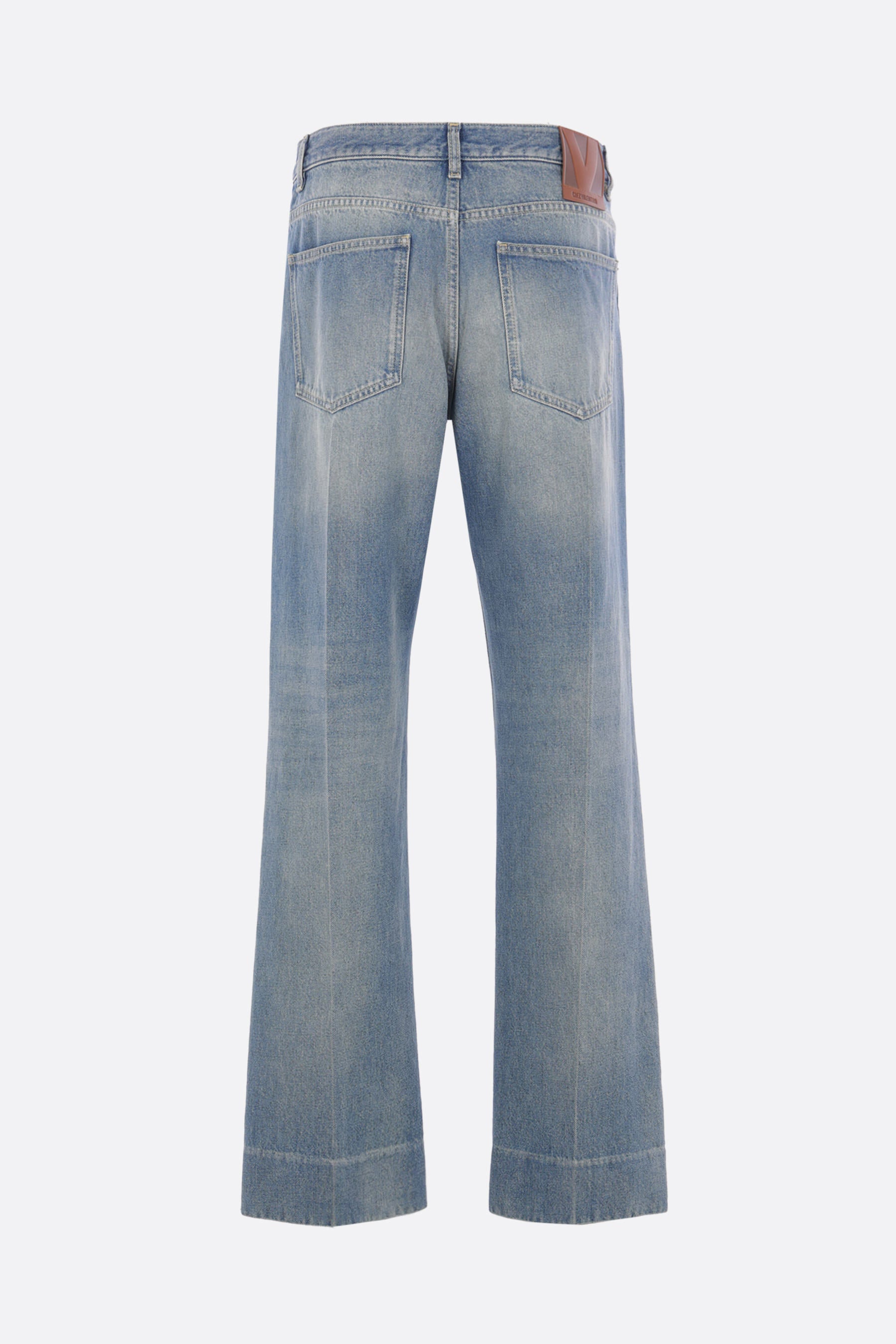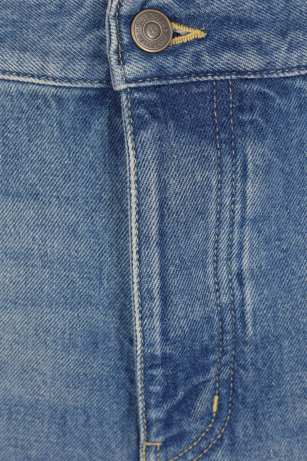 Valentino Garavani straight-leg jeans crafted from medium blue cotton denim. Featuring front metal button closure, belt loops, five classic pockets, and a central crease. The design is completed with the Chez Valentino leather logo patch on the back.