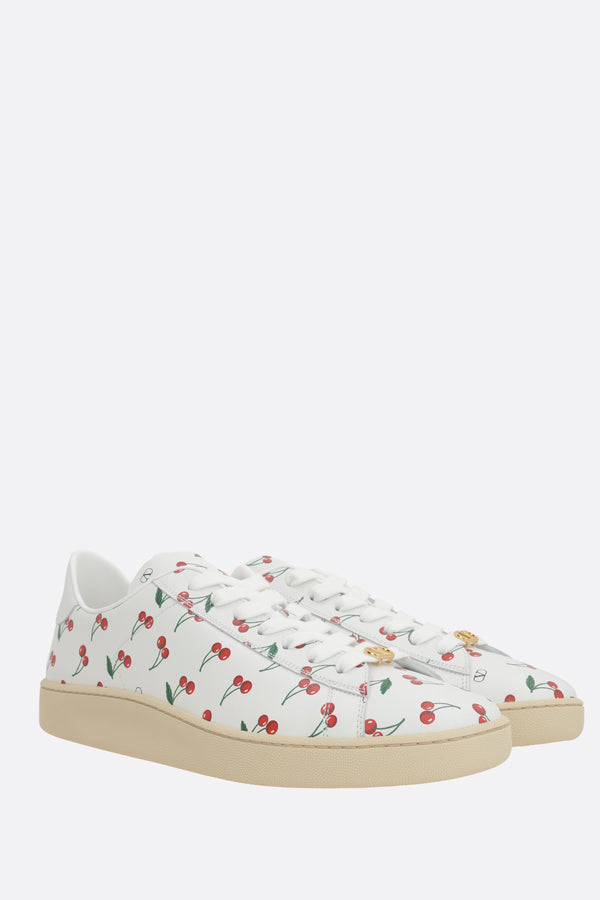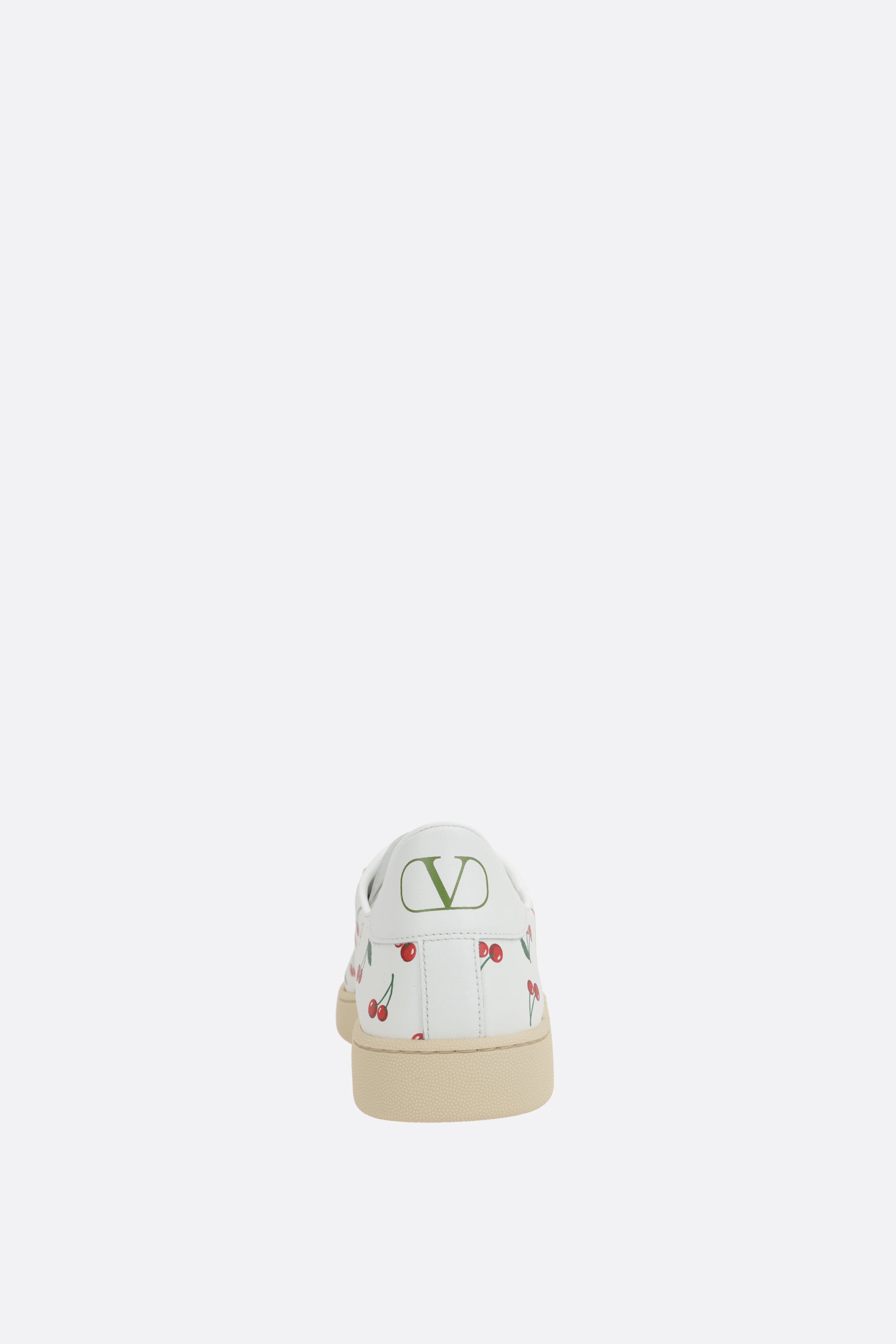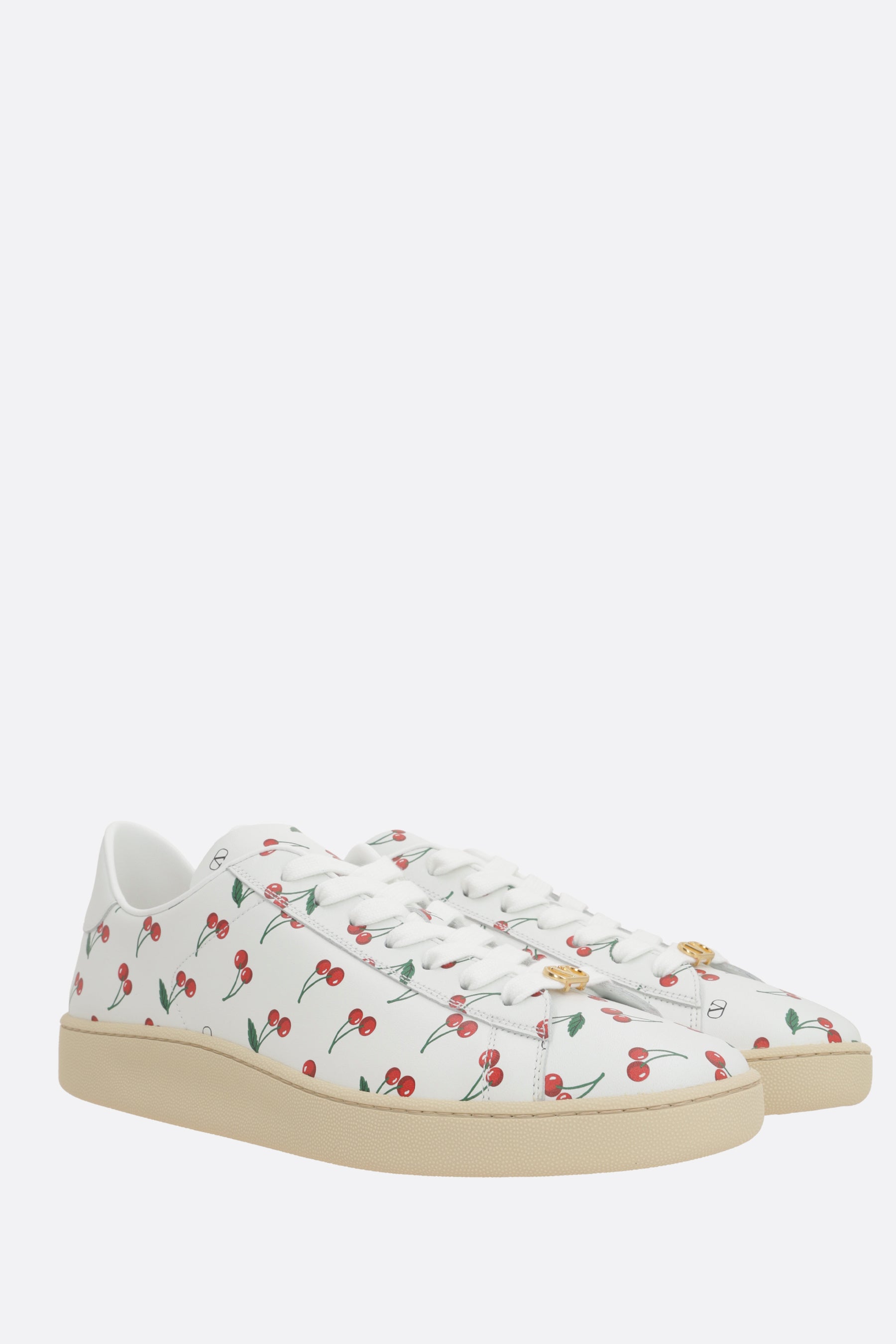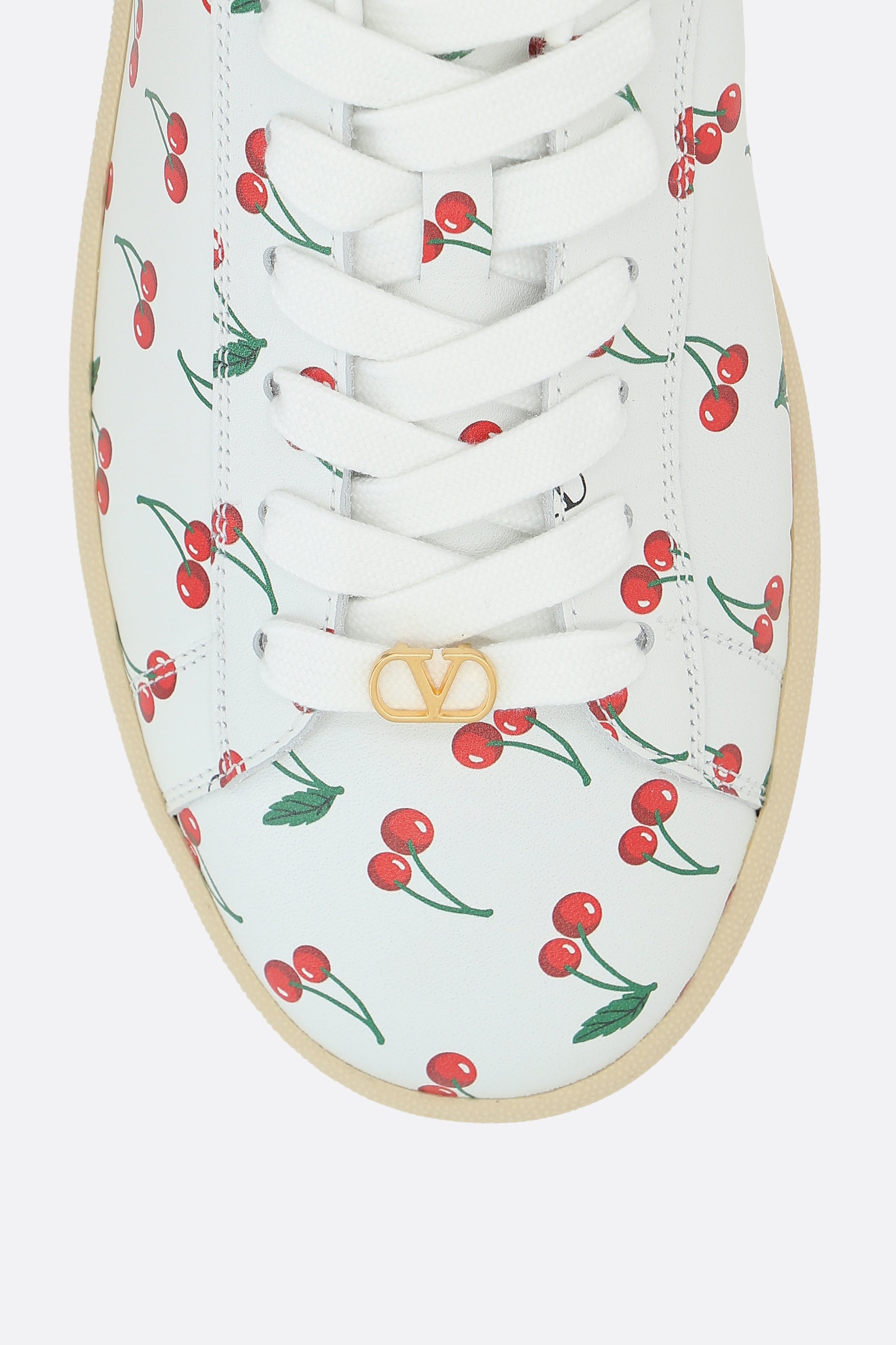 Valentino Garavani low-top sneaker crafted in smooth white leather with an all-over Cherryfic print. Characterized by a lace-up closure, round toe, leather lining, and rubber sole. The design is completed with the VLogo Signature metal detail, a printed logo on the heel, and includes spare laces.