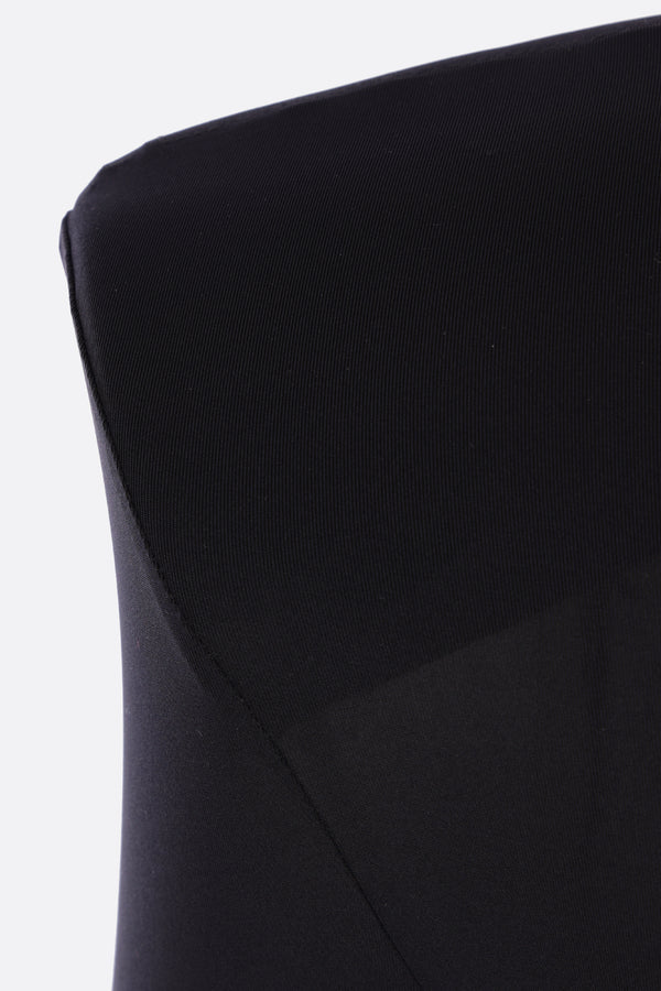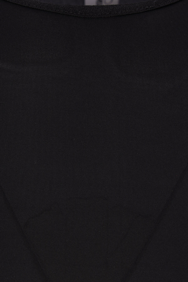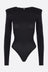 Vaquera bodysuit made of black technical jersey. Featuring a round neckline, padded shoulders, long sleeves, and snap button closure at the bottom.