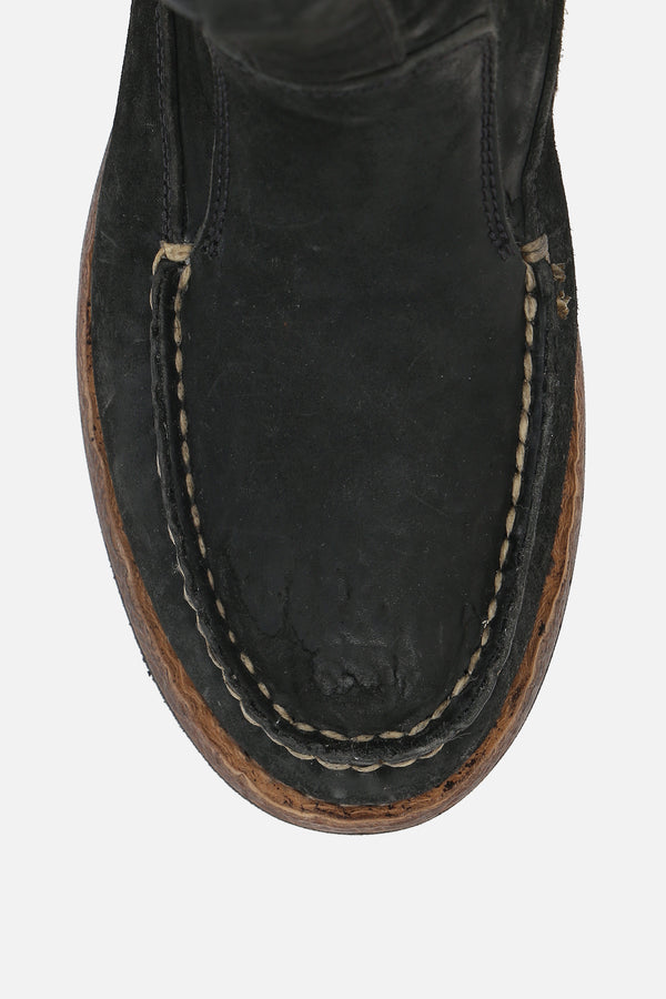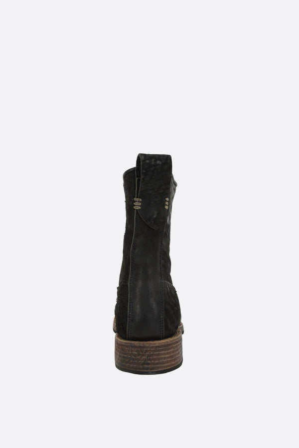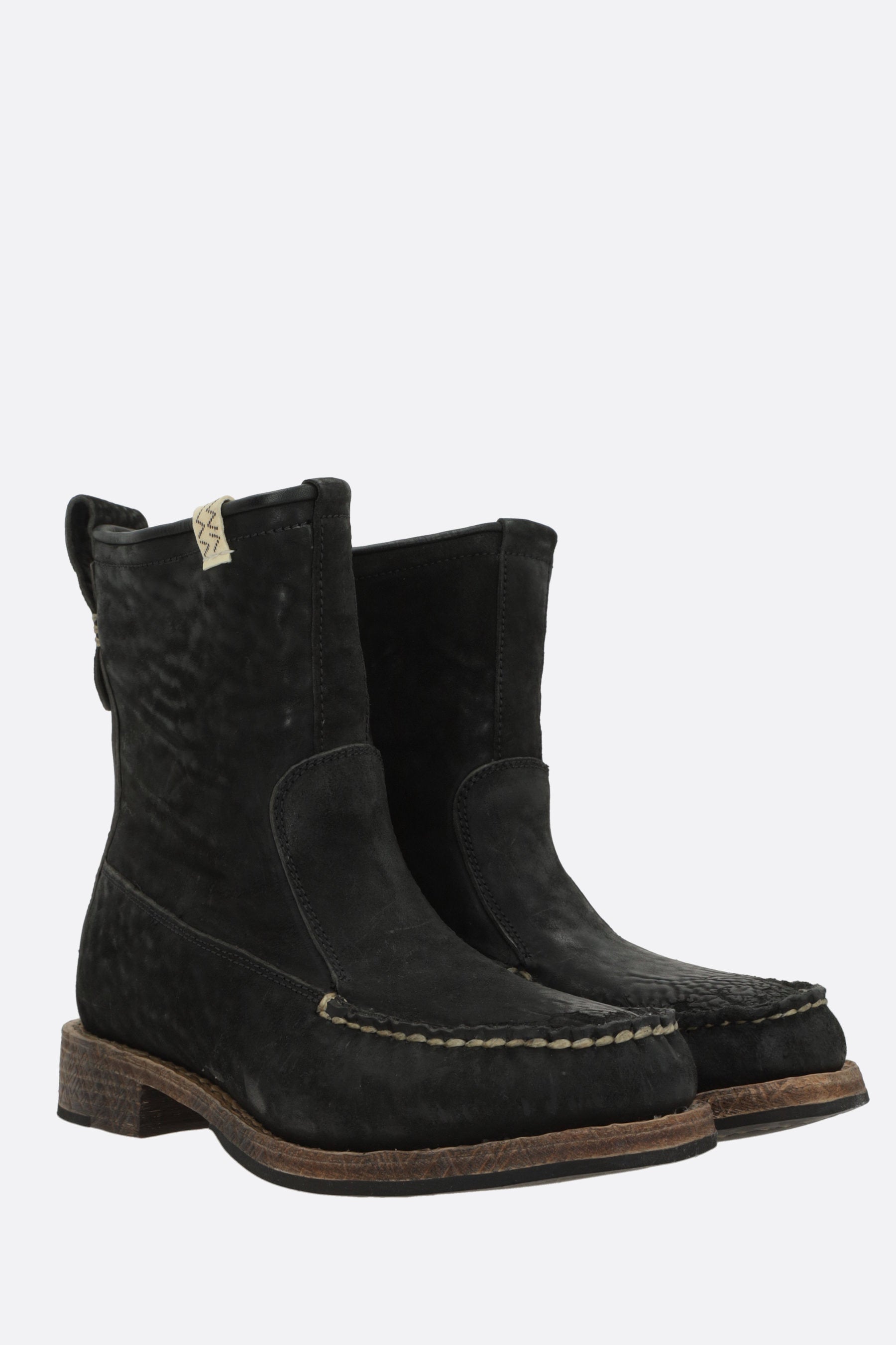 Visvim folk-inspired ankle boots crafted from black nubuck. Featuring a round toe, leather lining, and leather/rubber sole. The design is completed with the iconic contrasting logo label. The natural leather used on this garment has been specially treated to create a unique color and texture to its appearance where each piece is unique and no one piece is alike.