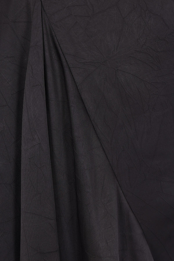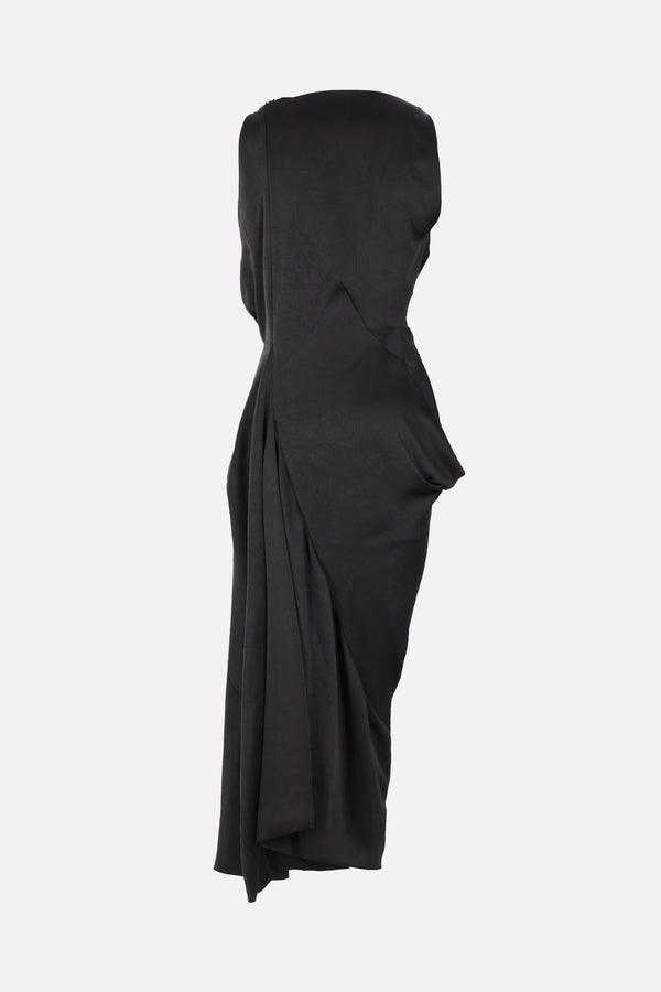 Vivienne Westwood sleeveless long dress crafted from black fluid satin. Featuring a draped neckline, side invisible zip closure, asymmetric draping, an asymmetric hem, and an unlined interior.