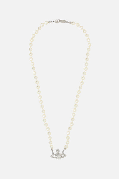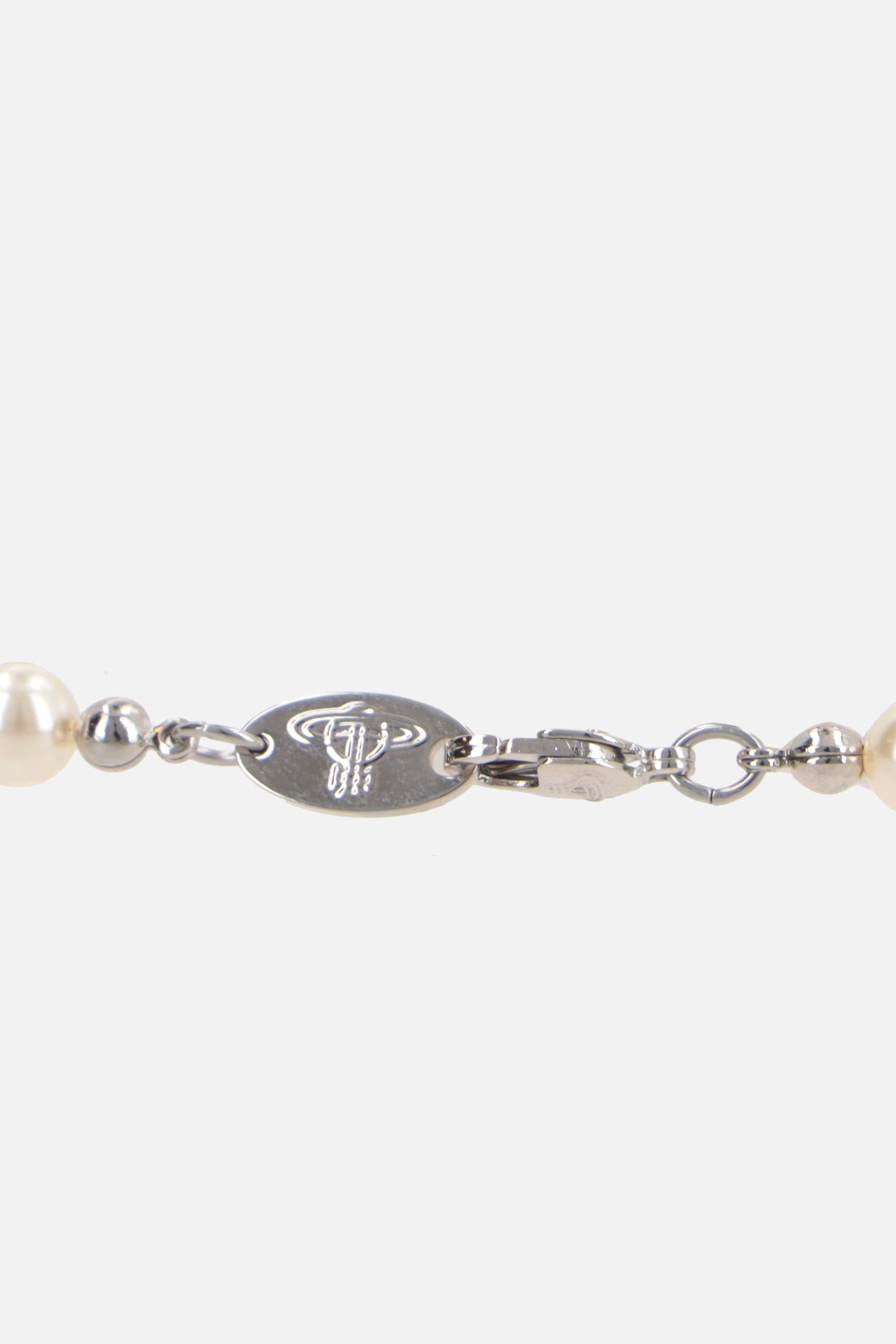 Vivienne Westwood necklace with glass-based Swarovski pearls and platinum-tone brass Orb logo pendant embellished by clear crystals. It features lobster clasp closure.