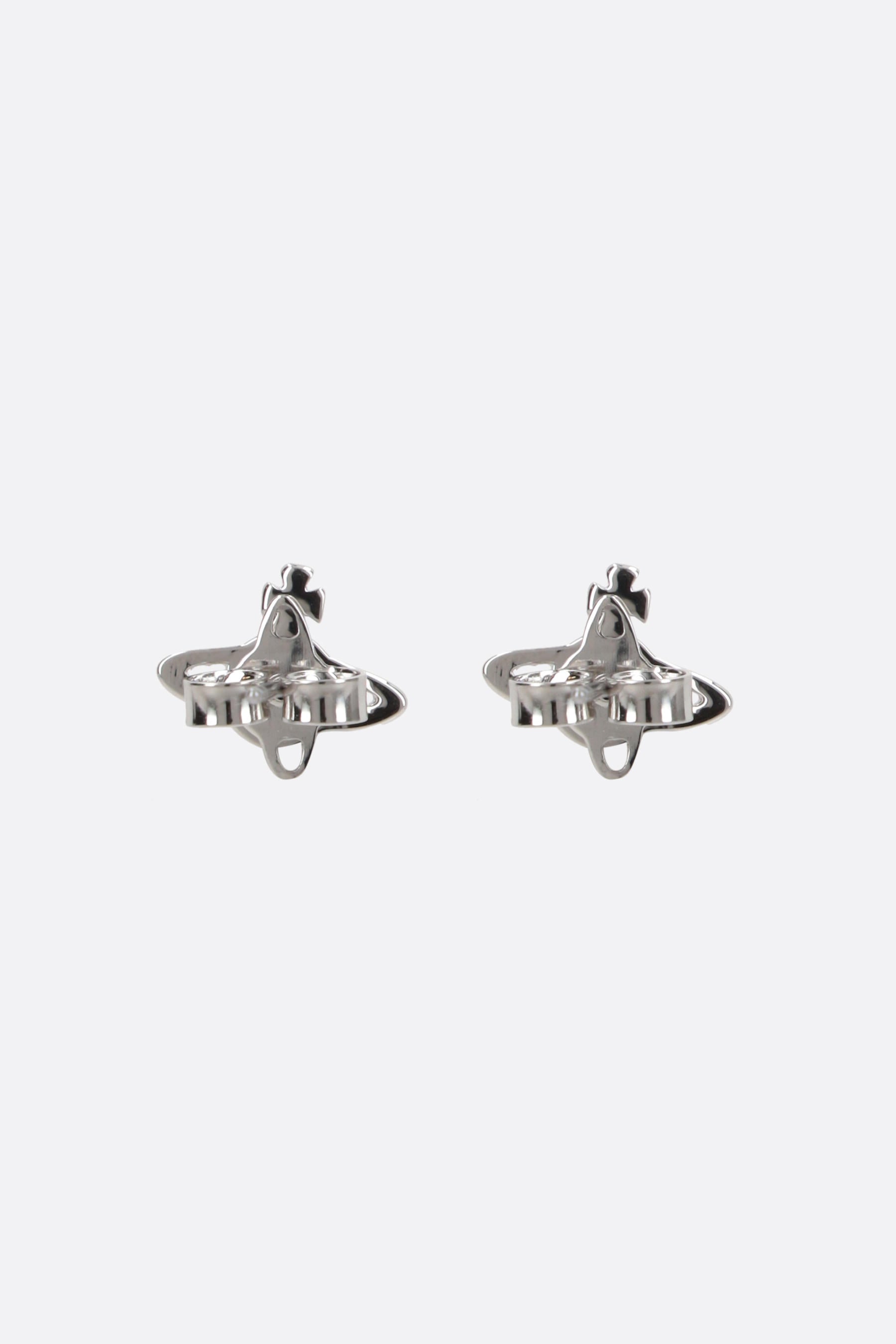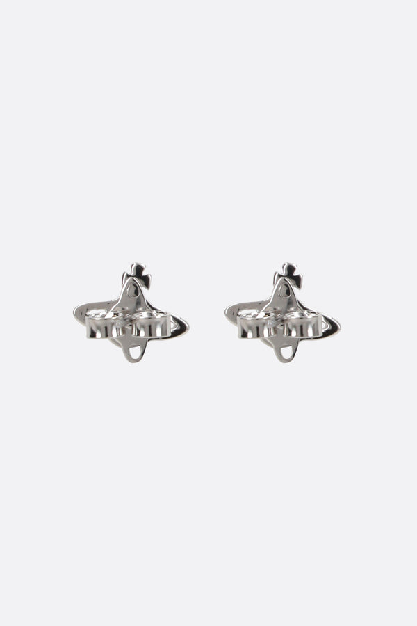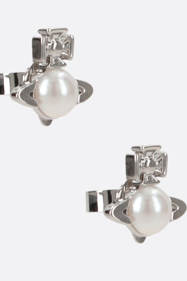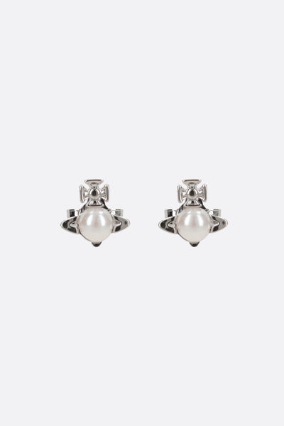 Vivienne Westwood earrings in platinum-tone brass with resin pearl featuring butterfly closure.