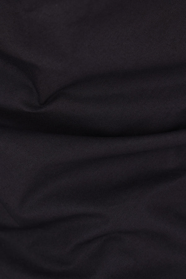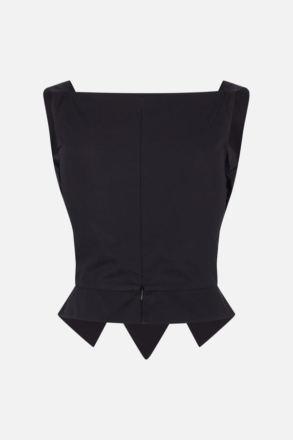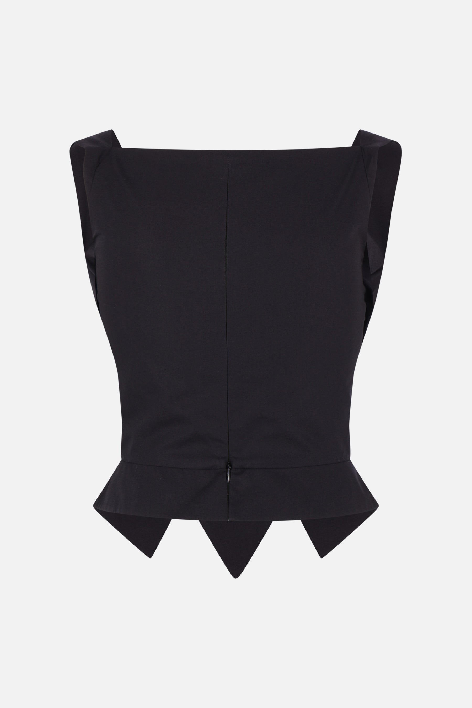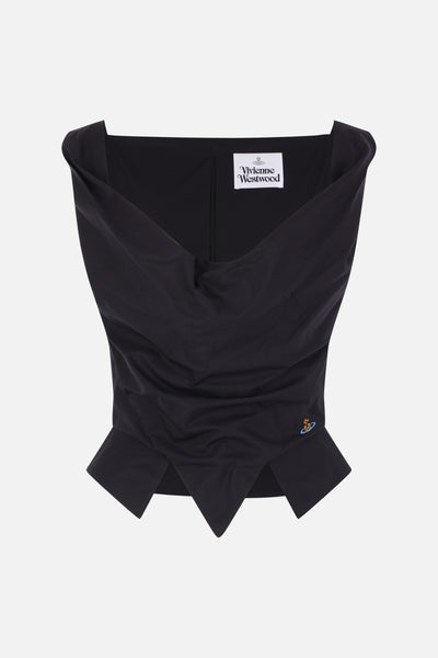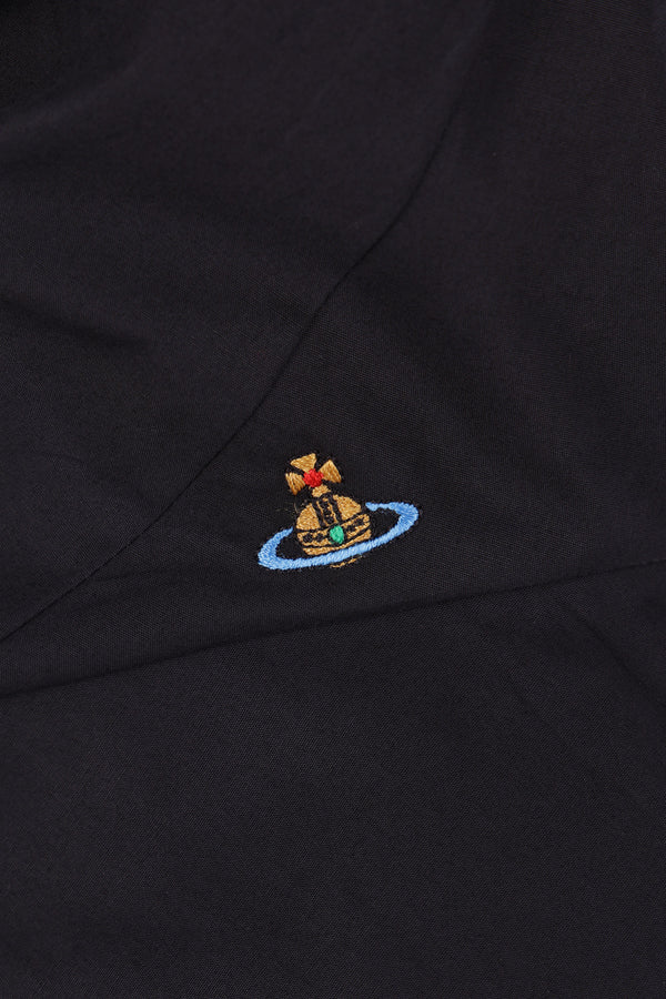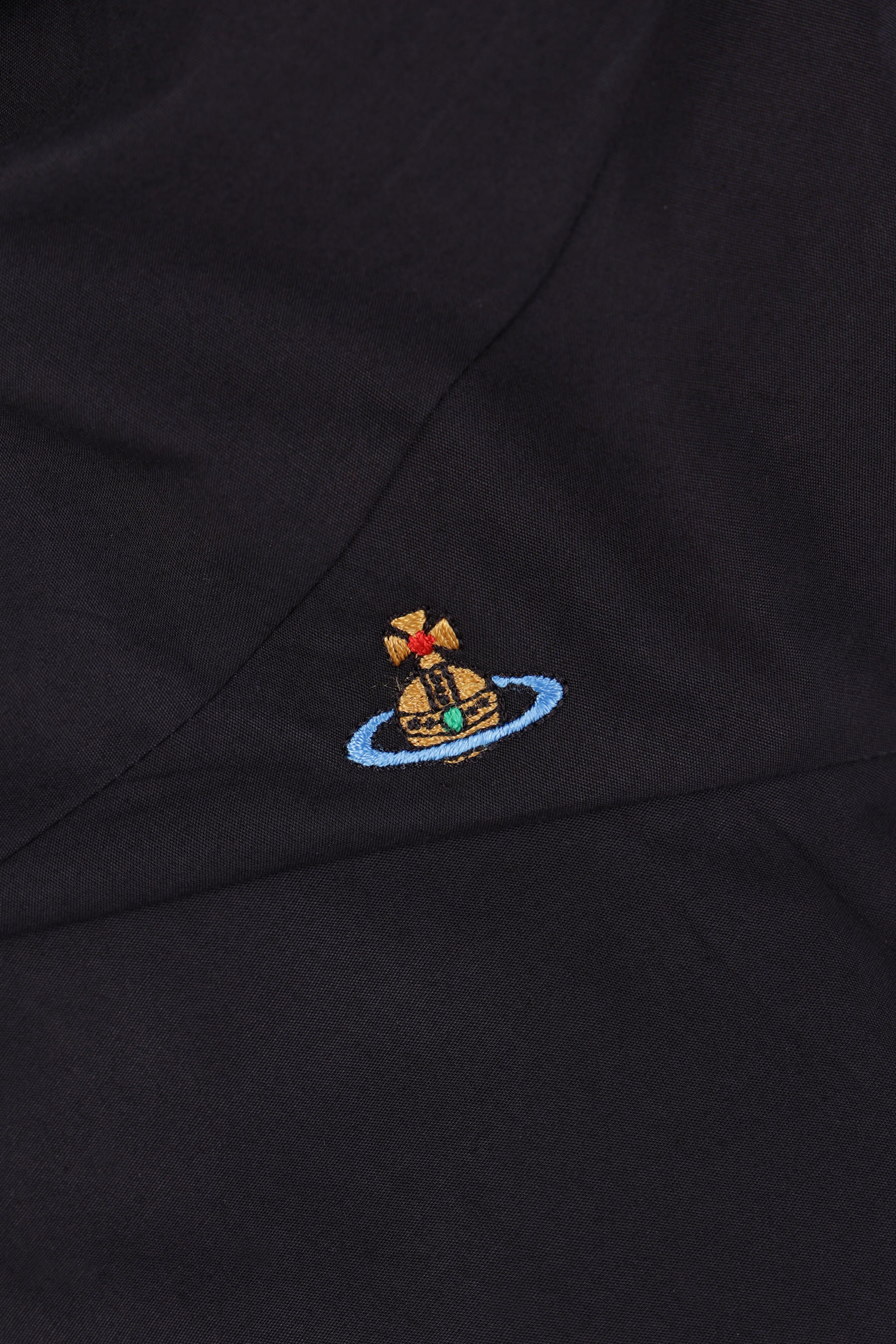 Vivienne Westwood top crafted from black cotton poplin with multicolor Orb logo embroidery at the hem. It features a wide neckline, dropped strap bands, an invisible back zip closure, front draping, and a geometric hem.