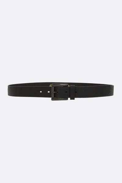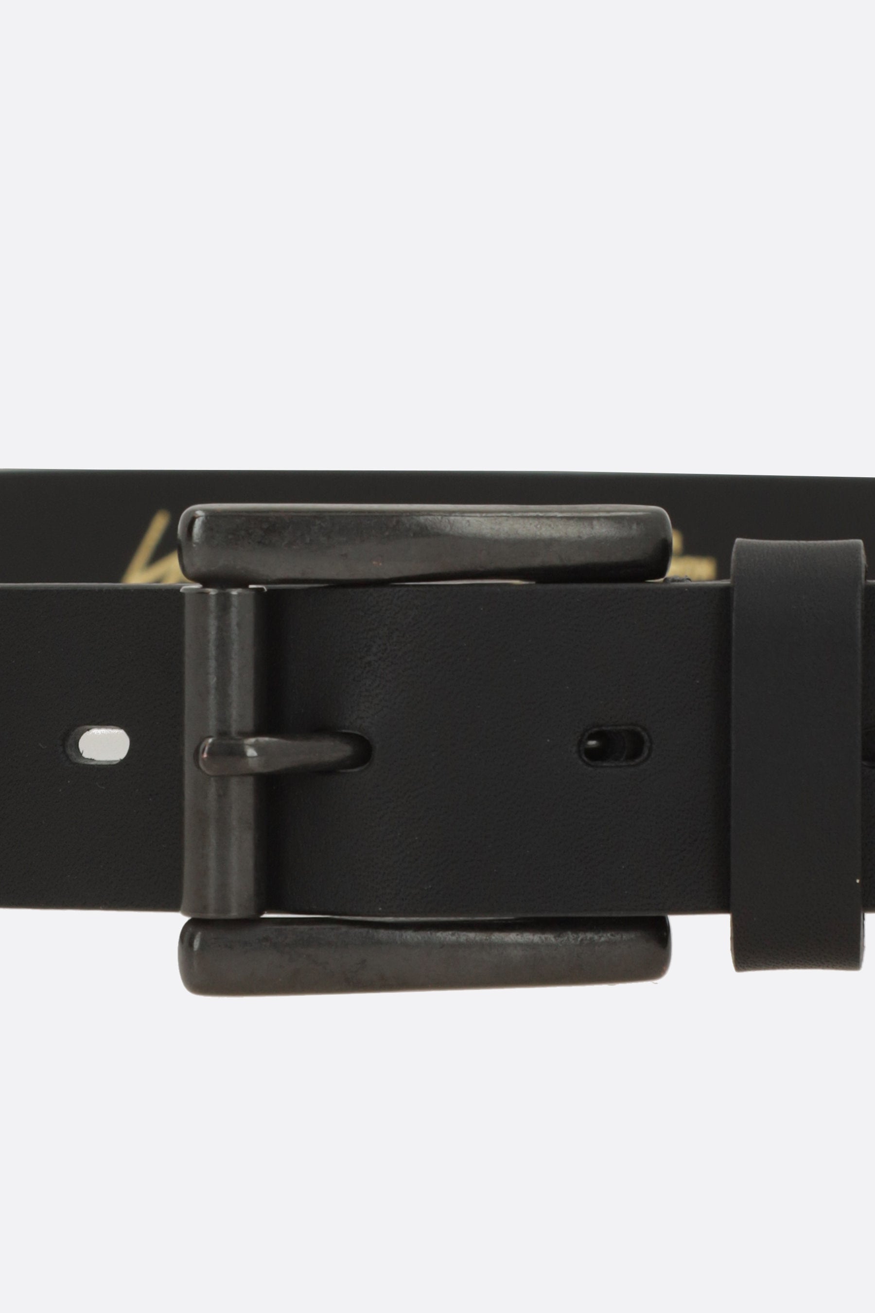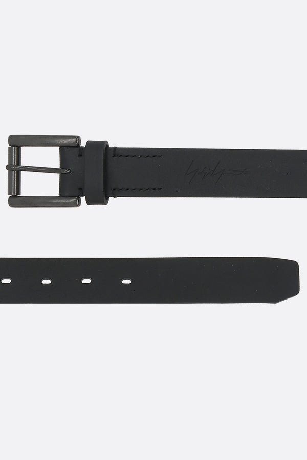 Yohji Yamamoto belt made of smooth black leather with embossed signature. Features an adjustable closure with antiqued silver-tone metal buckle.