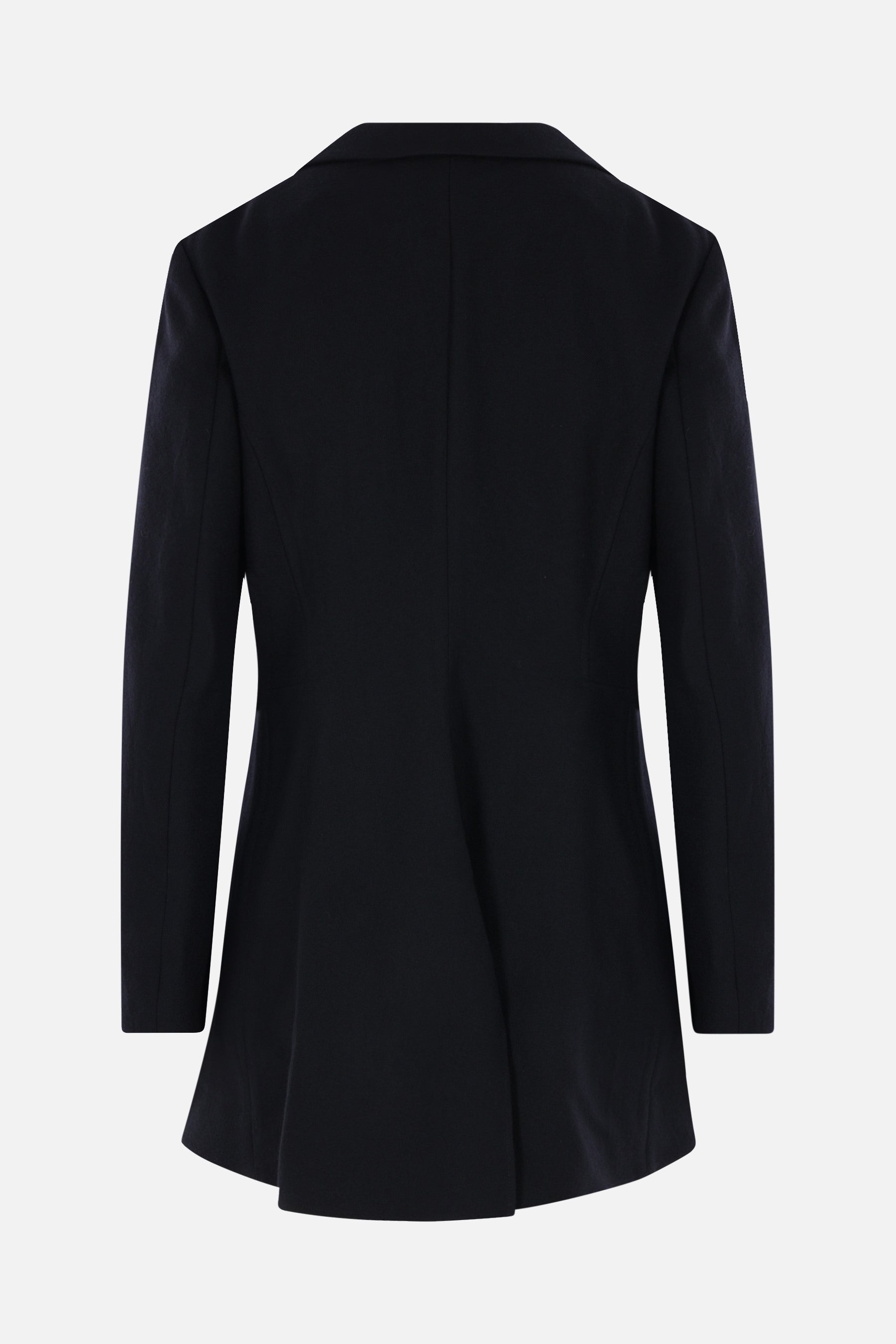 Yohji Yamamoto deconstructed jacket crafted from black wool. Features asymmetric lapels, snap-button closure, long sleeves, and a rounded hem longer at the back with a central vent. Semi-lined interior.
