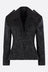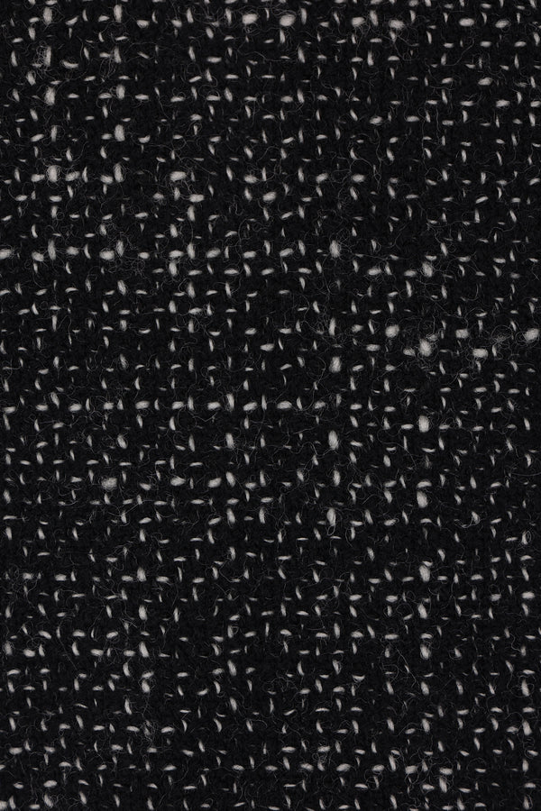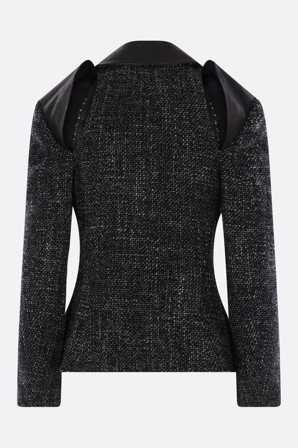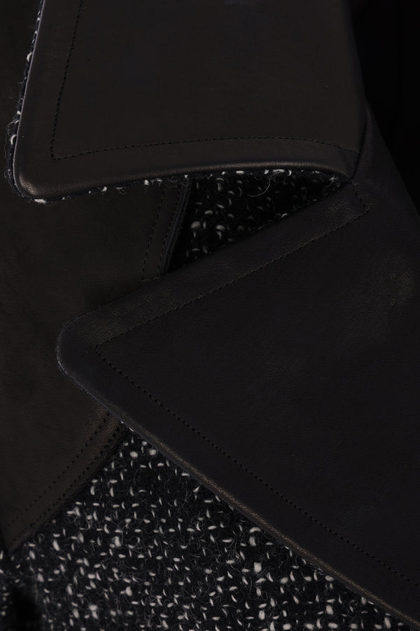 Yohji Yamamoto jacket crafted from black-and-white dotted wool with black leather details. Features wide lapels, double-slider zip closure, welt pockets, cut-out shoulder details, long sleeves, and a raw-cut straight hem. Lined interior.
