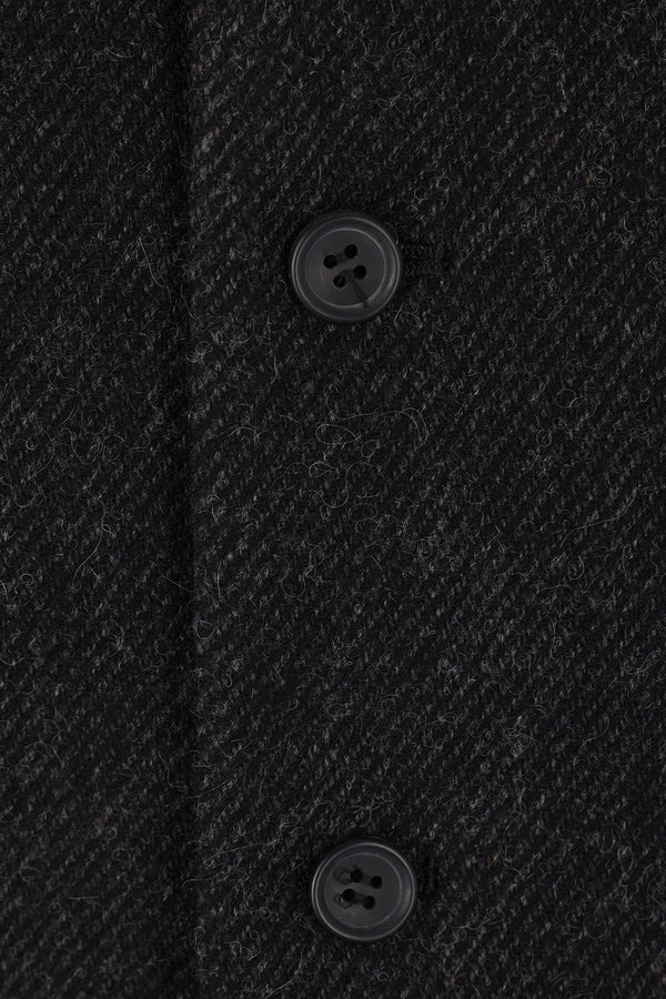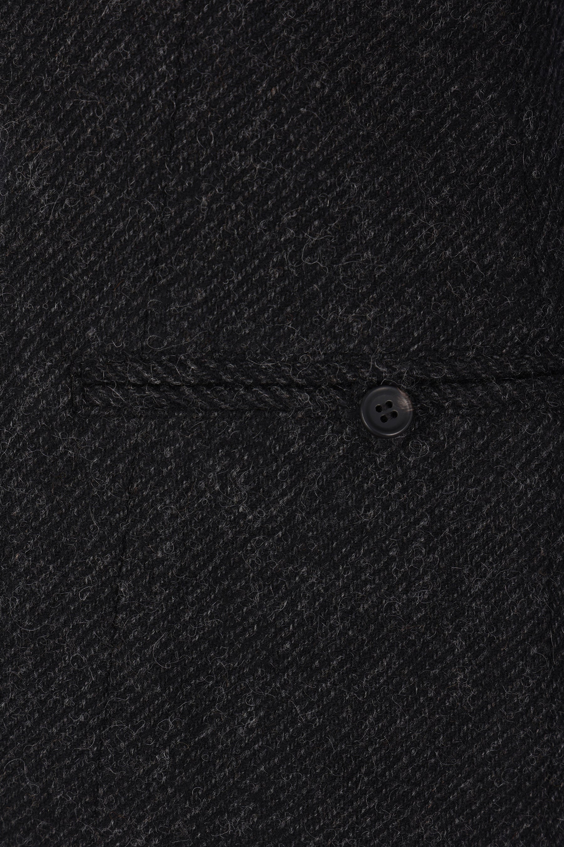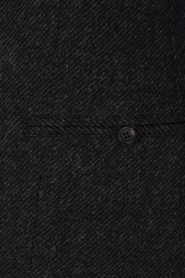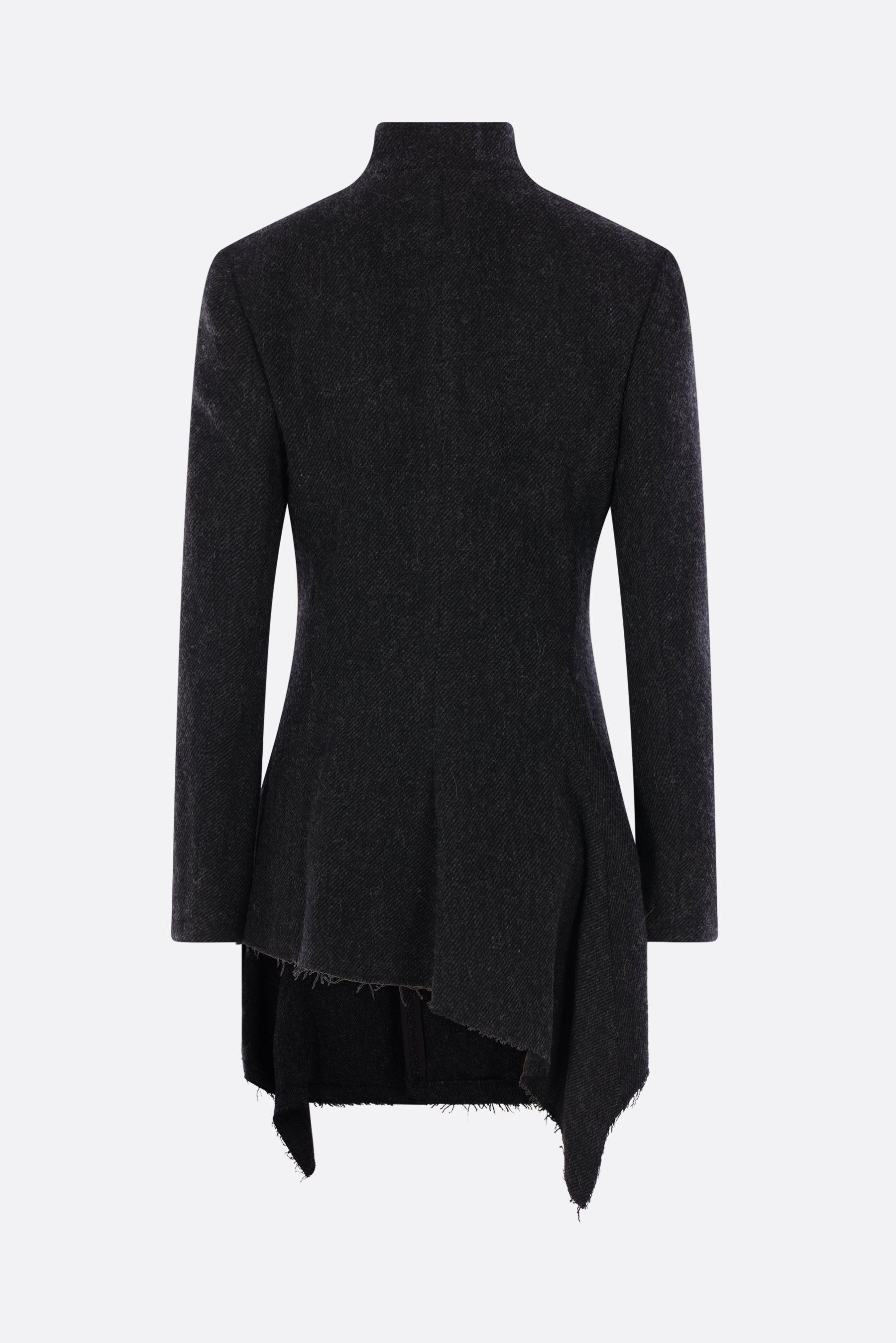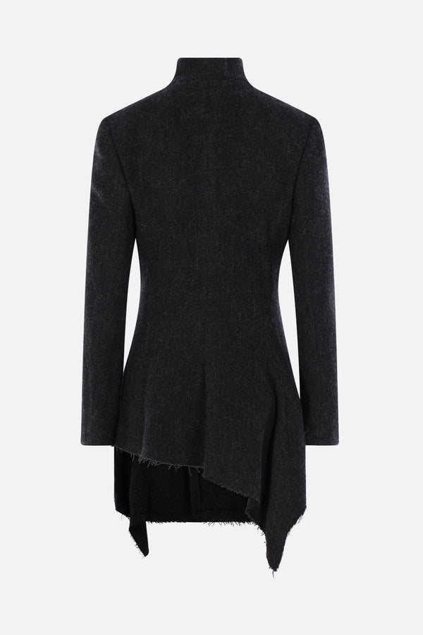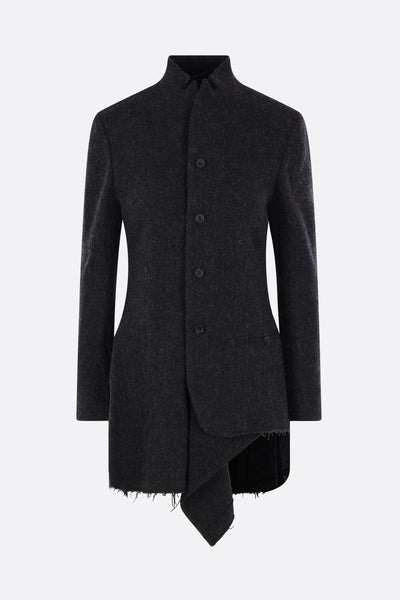Yohji Yamamoto single-breasted jacket made of dark gray wool blend. It features a stand-up collar, button closure, long sleeves, a double-welt pocket, raw-cut edges, an asymmetric hem, and a partially lined interior.