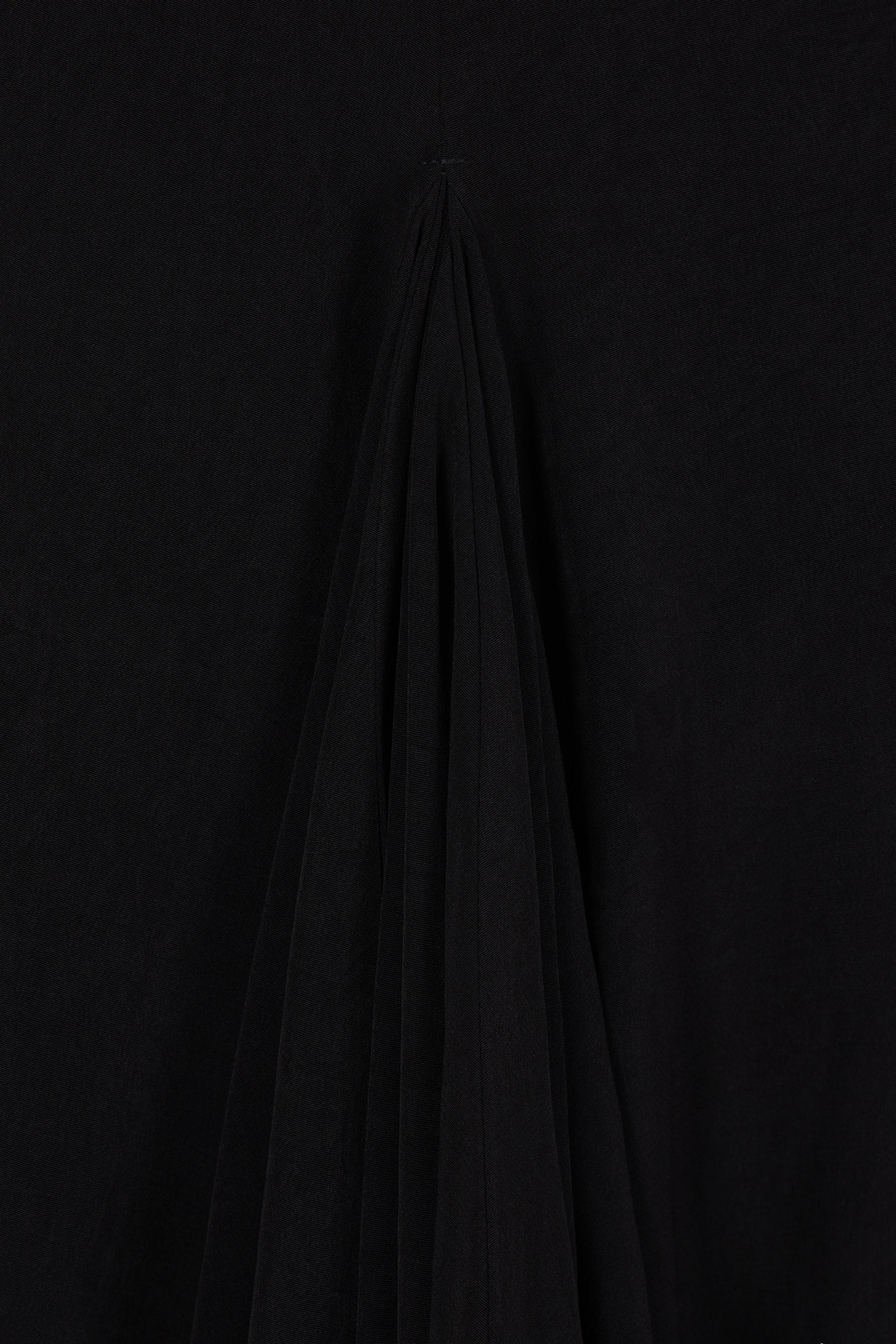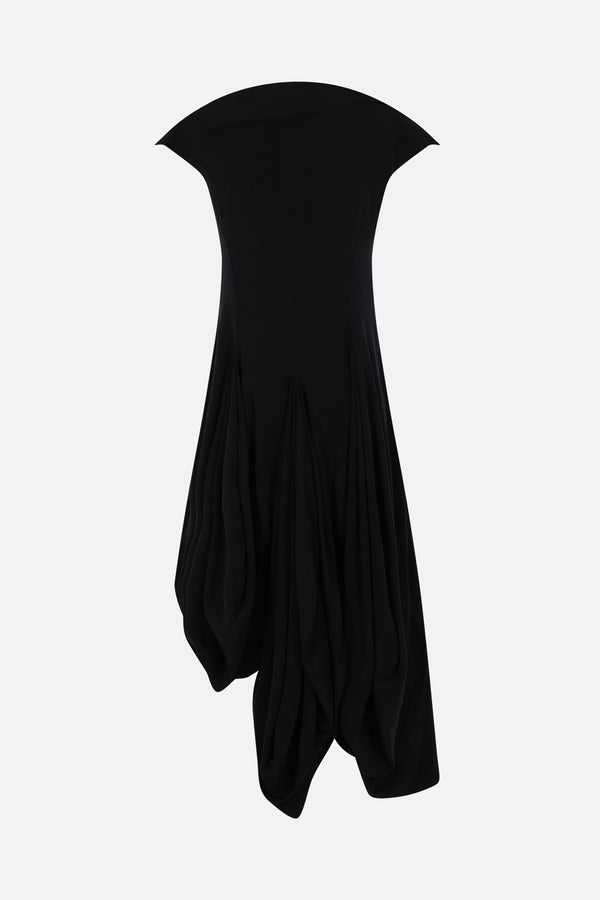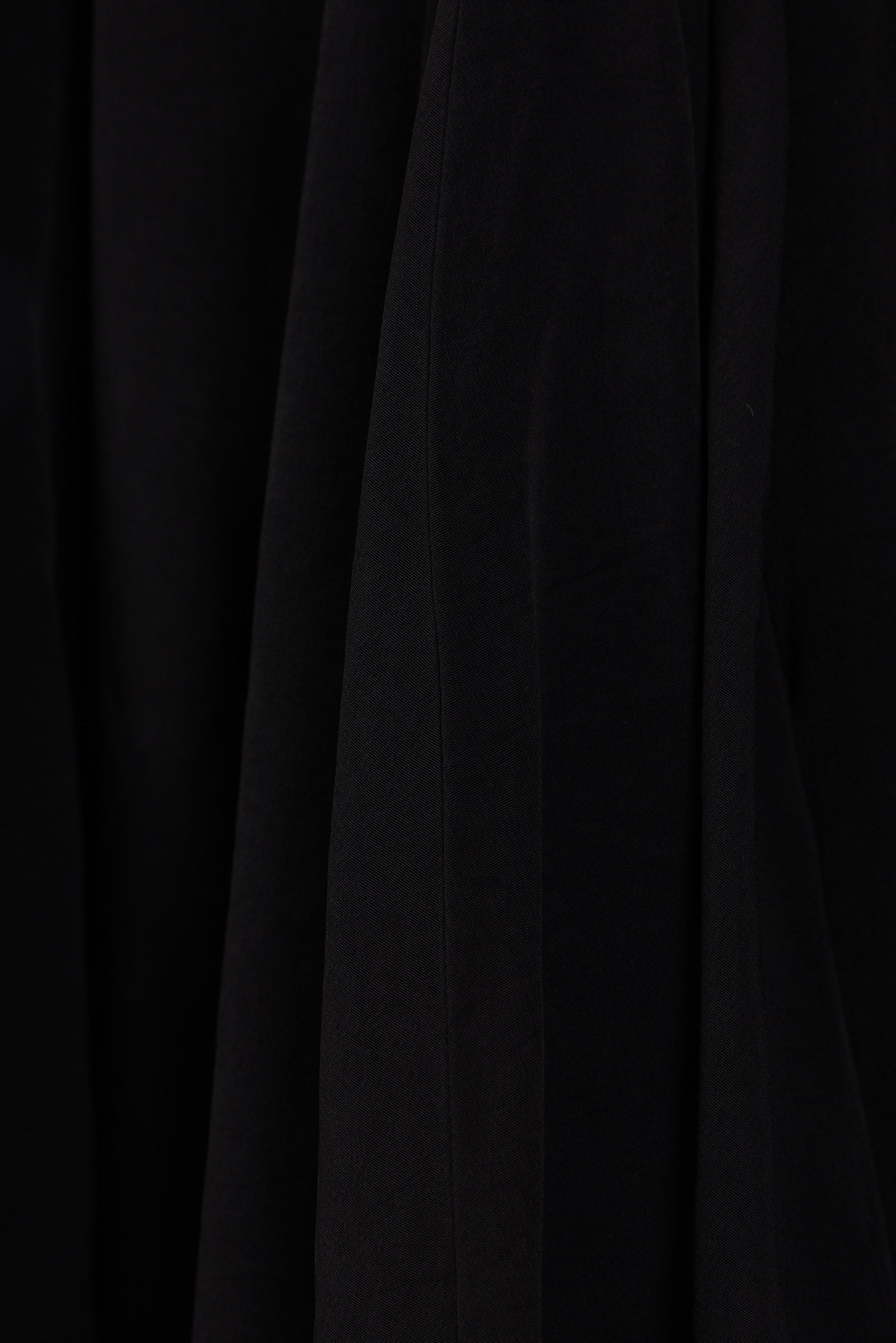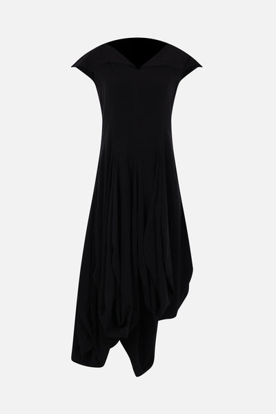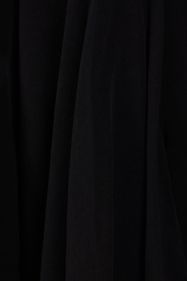 Yohji Yamamoto sleeveless dress crafted from black crepe. Features a bateau neckline, side invisible zip closure, side pocket, balloon skirt, and an unlined interior.