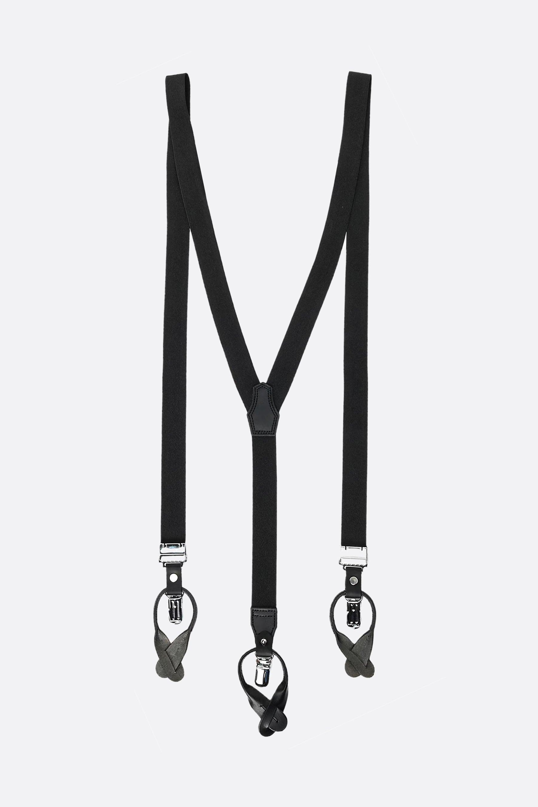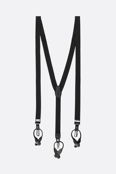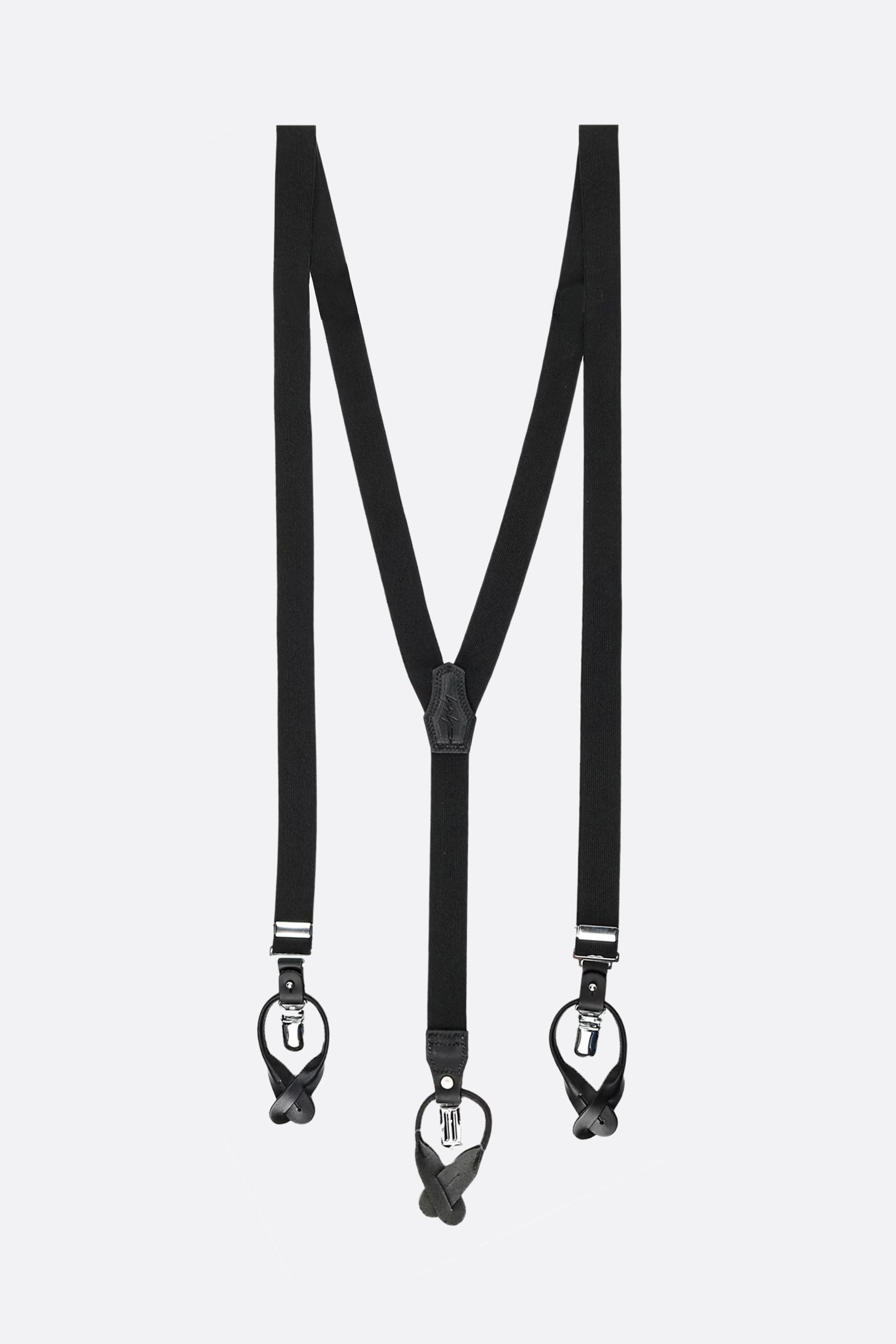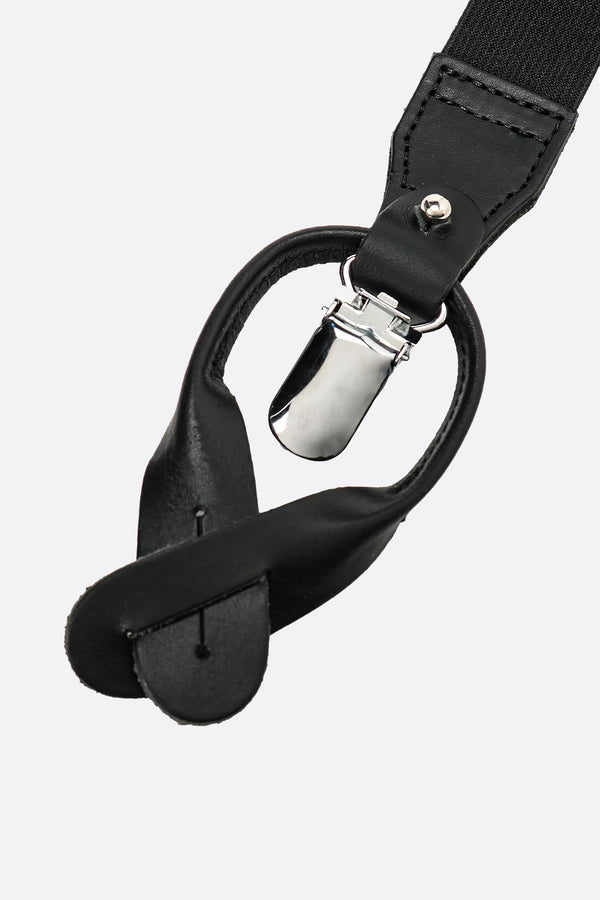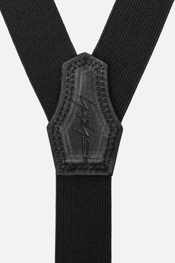 Adjustable suspenders by Yohji Yamamoto made of black stretch fabric with tone-on-tone leather details.