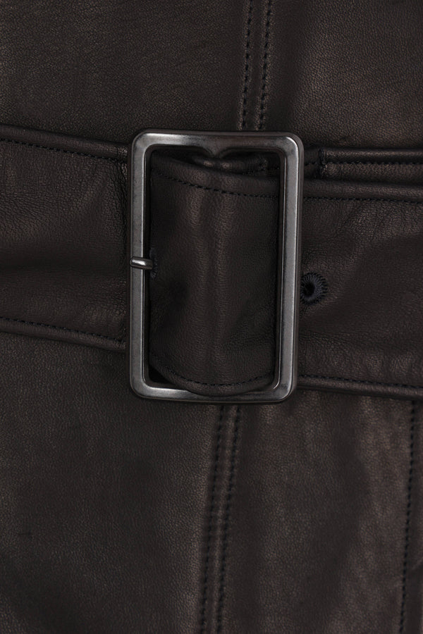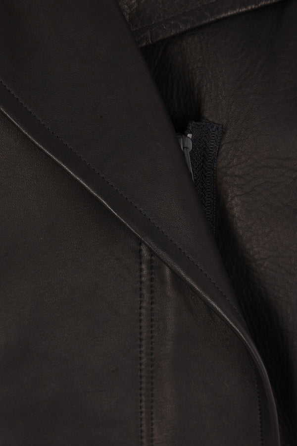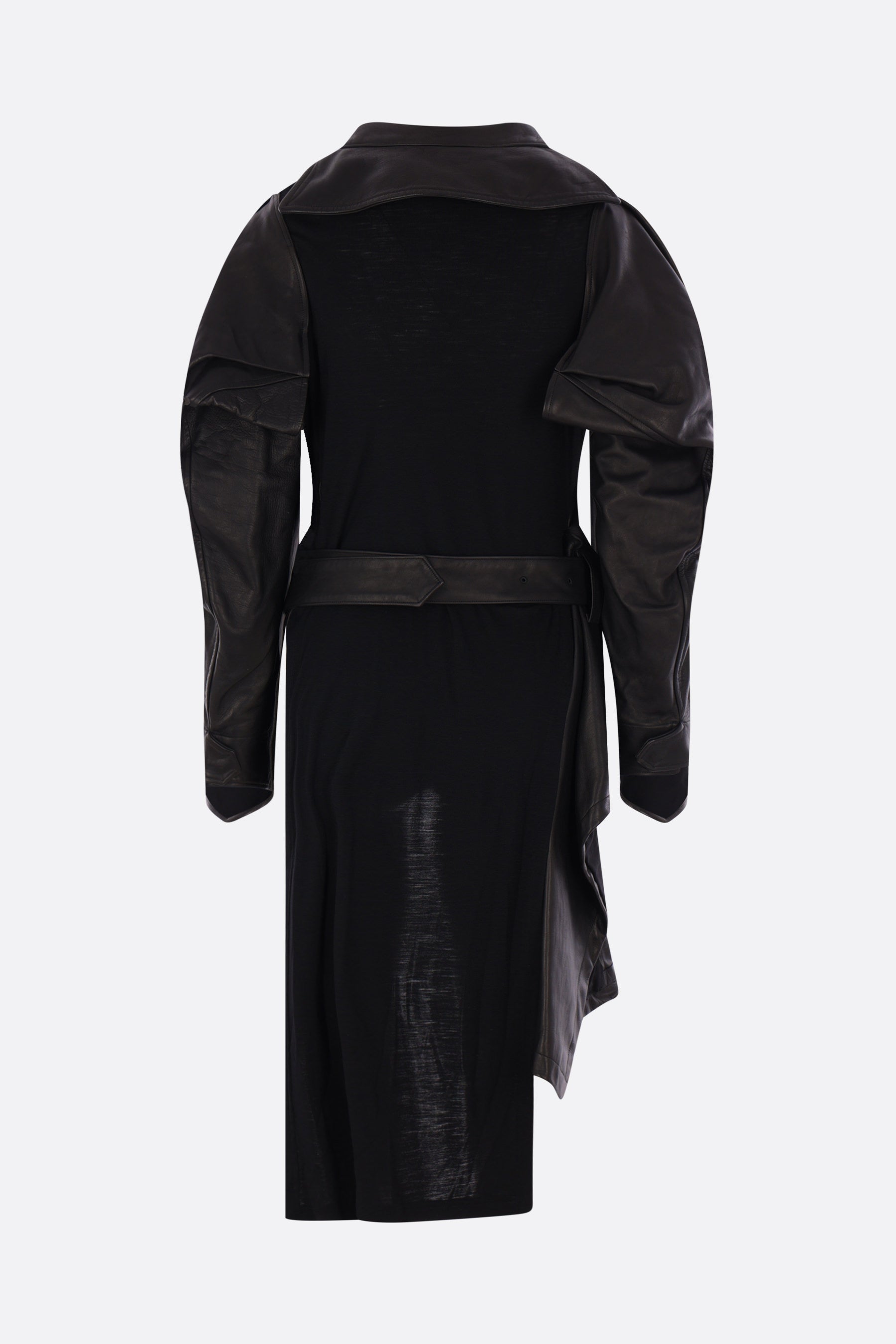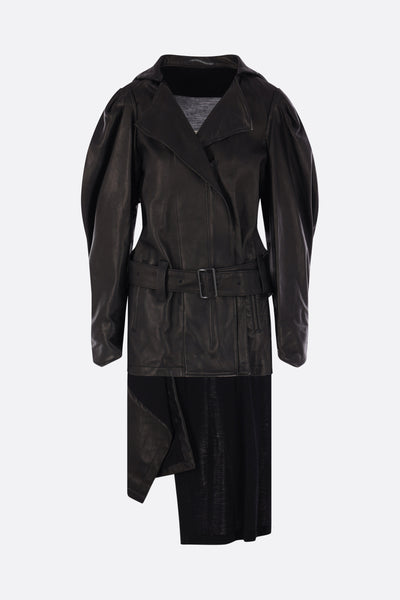 Yohji Yamamoto biker jacket made of black leather with a jersey wool back panel. It features wide lapels, an off-center double-zip closure, welt pockets, a matching belt, long puff sleeves with shoulder cut-outs, adjustable cuffs, and an asymmetric hem. Fully lined interior.