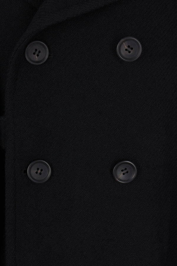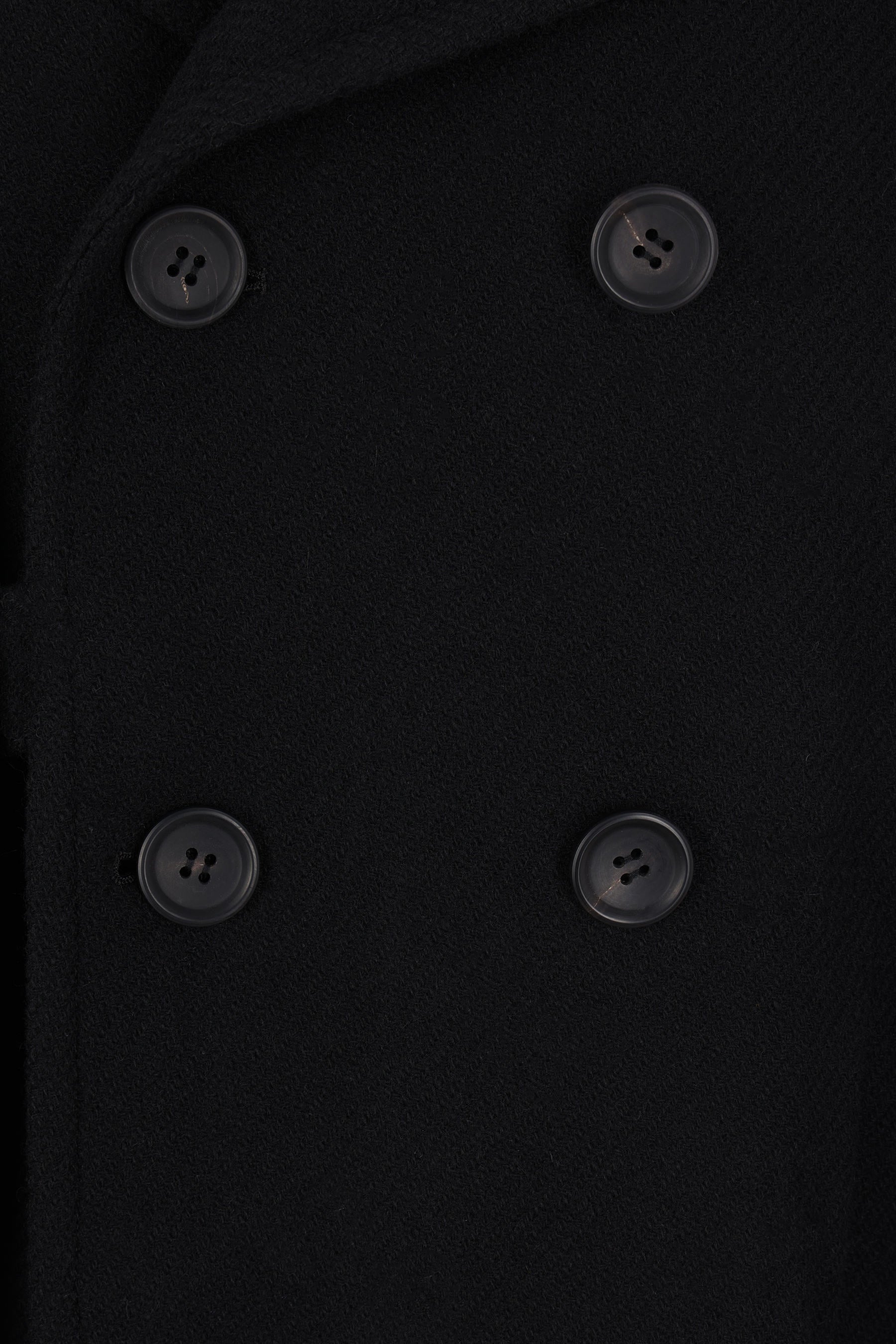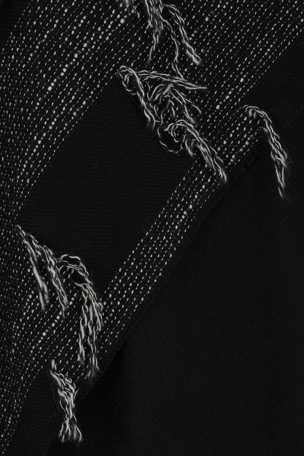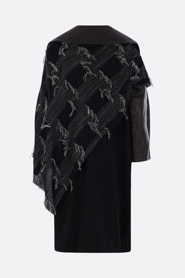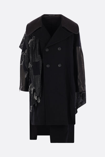 Yohji Yamamoto double-breasted coat made of black wool with an overlapping jacquard wool shawl. It features wide leather lapels, a button closure, long leather sleeves with armhole cut-outs and side zips, welt pockets, an asymmetric hem, and a lined interior.