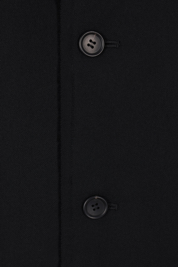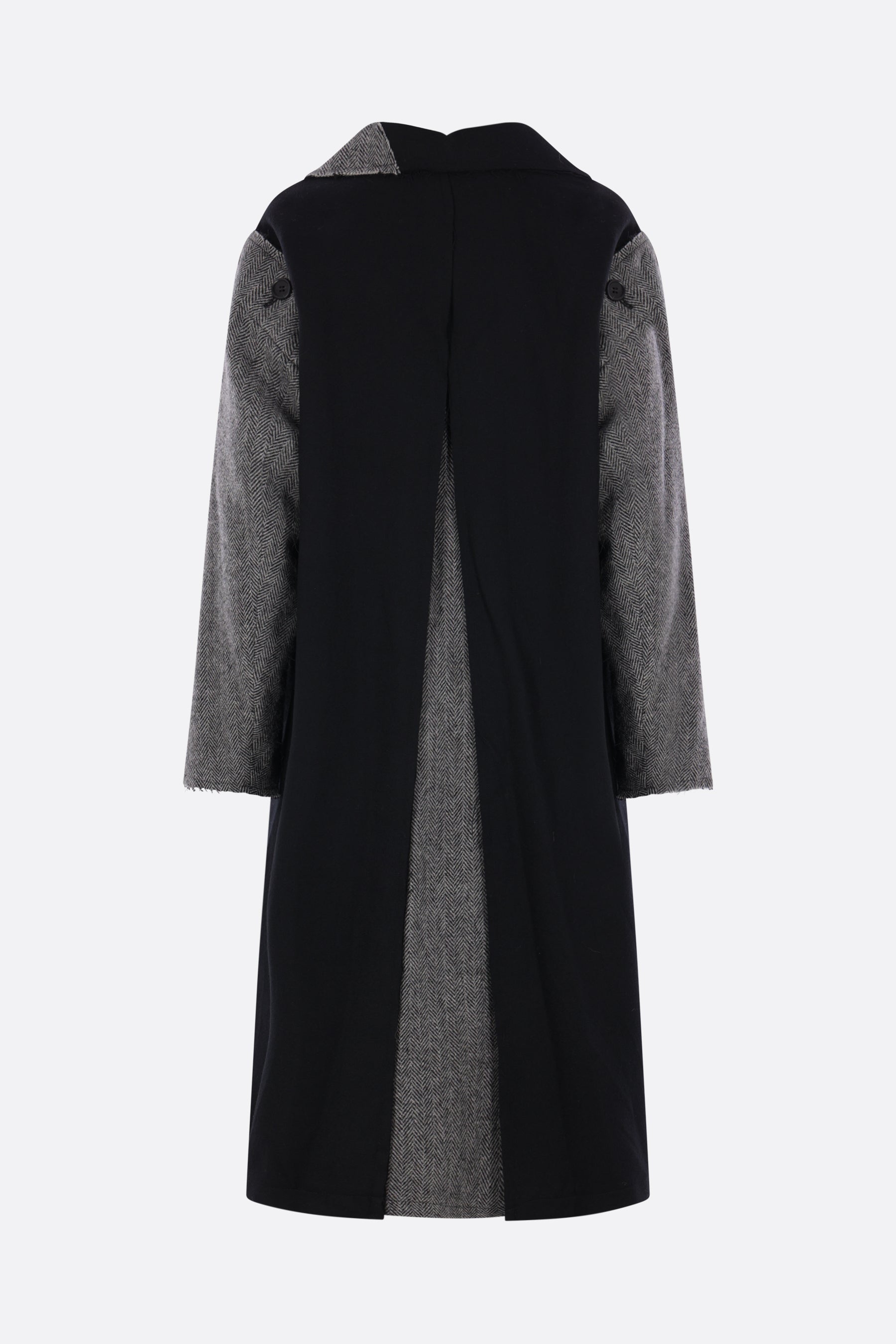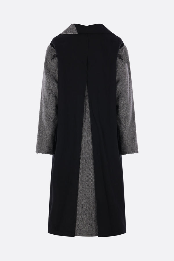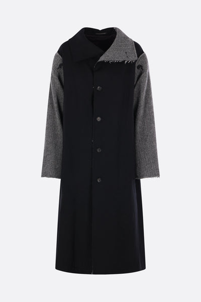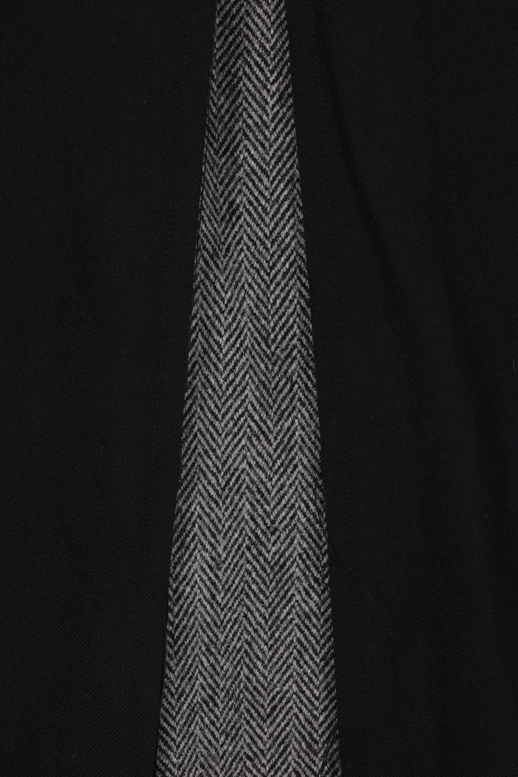 Yohji Yamamoto single-breasted coat made of black wool gabardine with herringbone wool-blend inserts in shades of gray. It features a stand-up collar, button closure, raw-cut edges, multiple pockets, long sleeves with shoulder buttons, a pleated back hem, and a lined interior.
