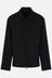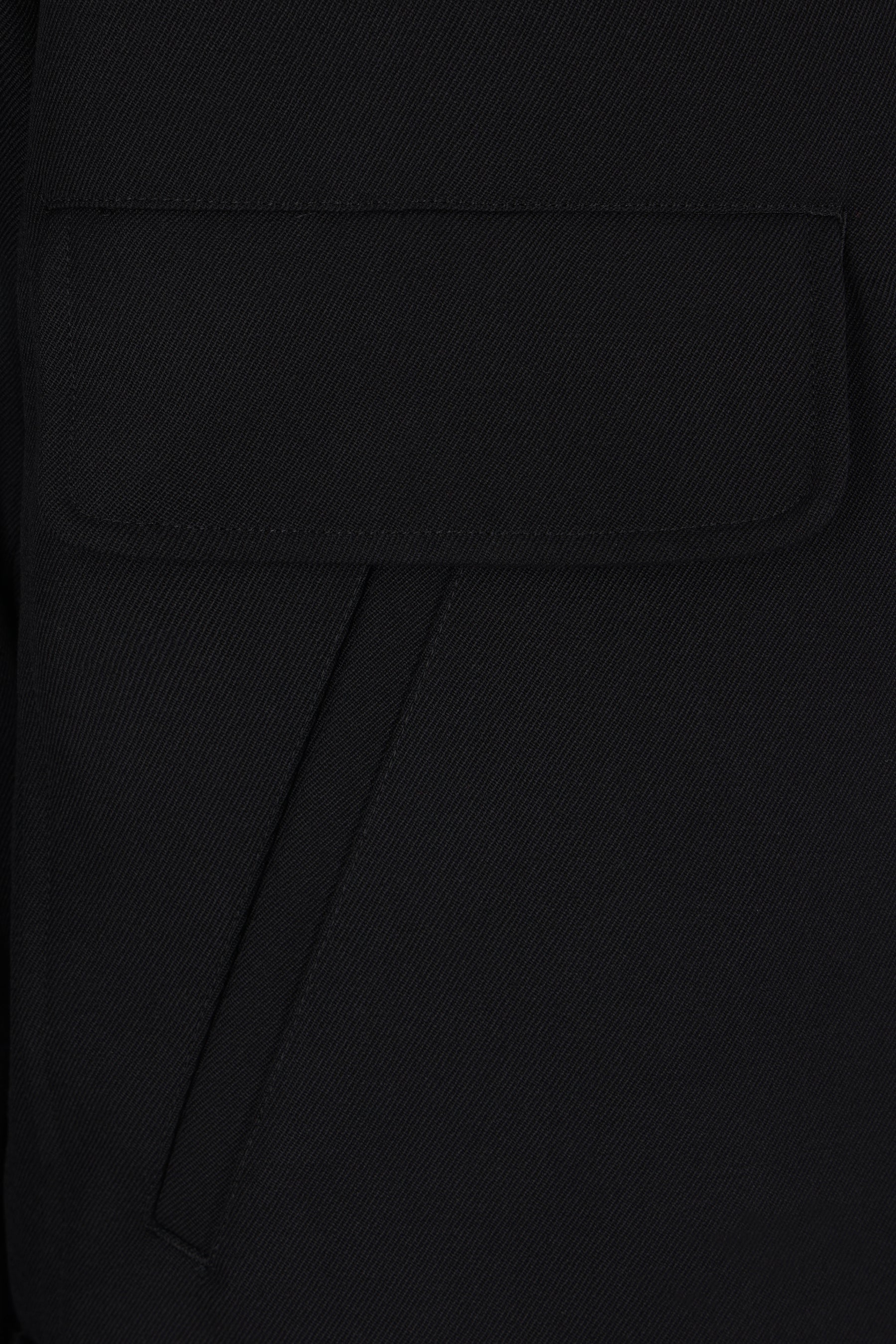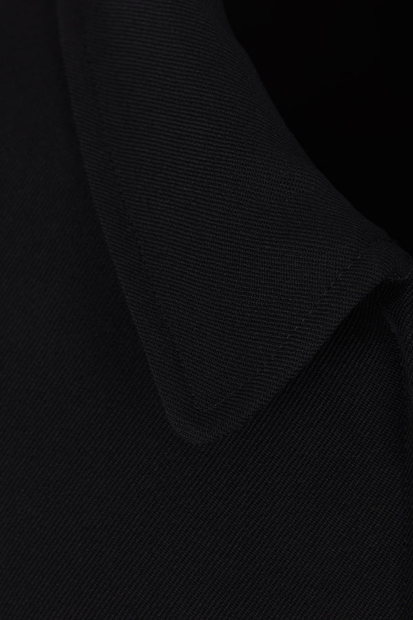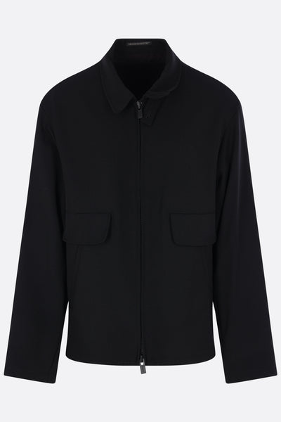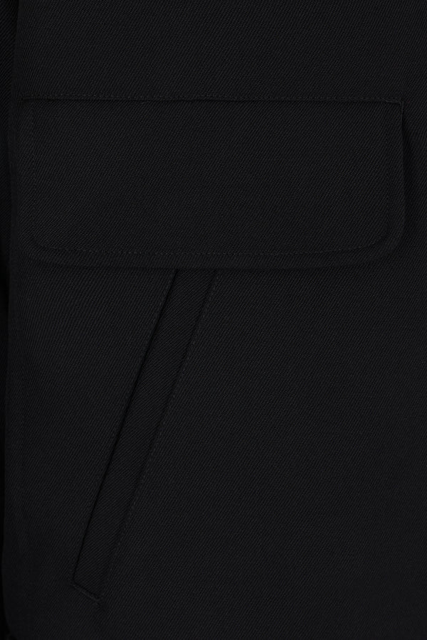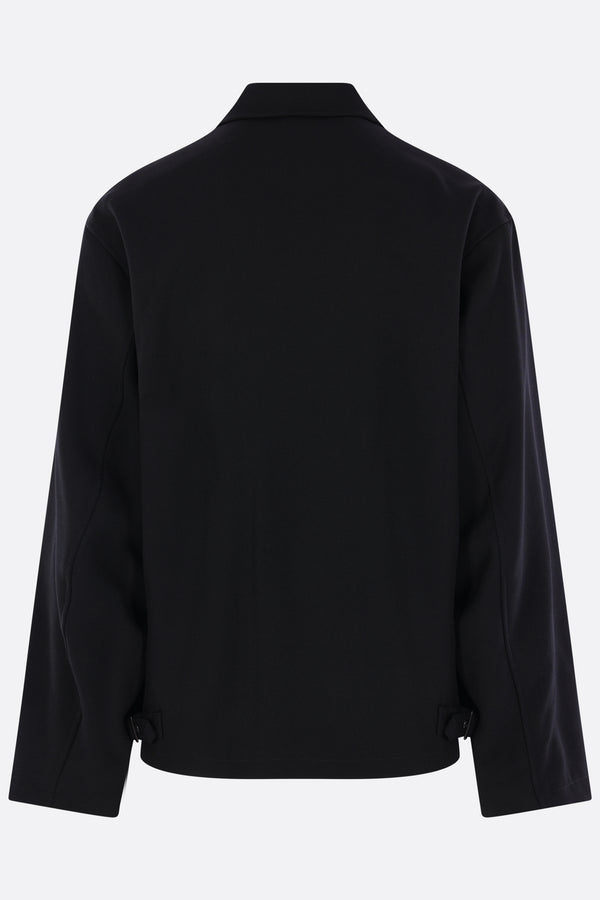 Yohji Yamamoto jacket made from black wool gabardine. Features a high collar with front tab, double-zip closure, flap pockets, long sleeves, and a straight hem with adjustable side straps. Lined interior.