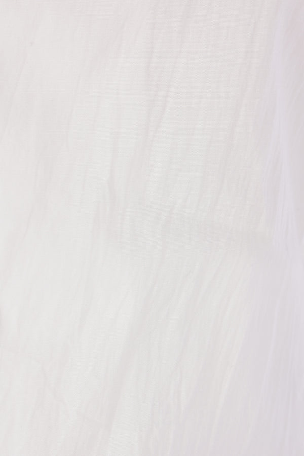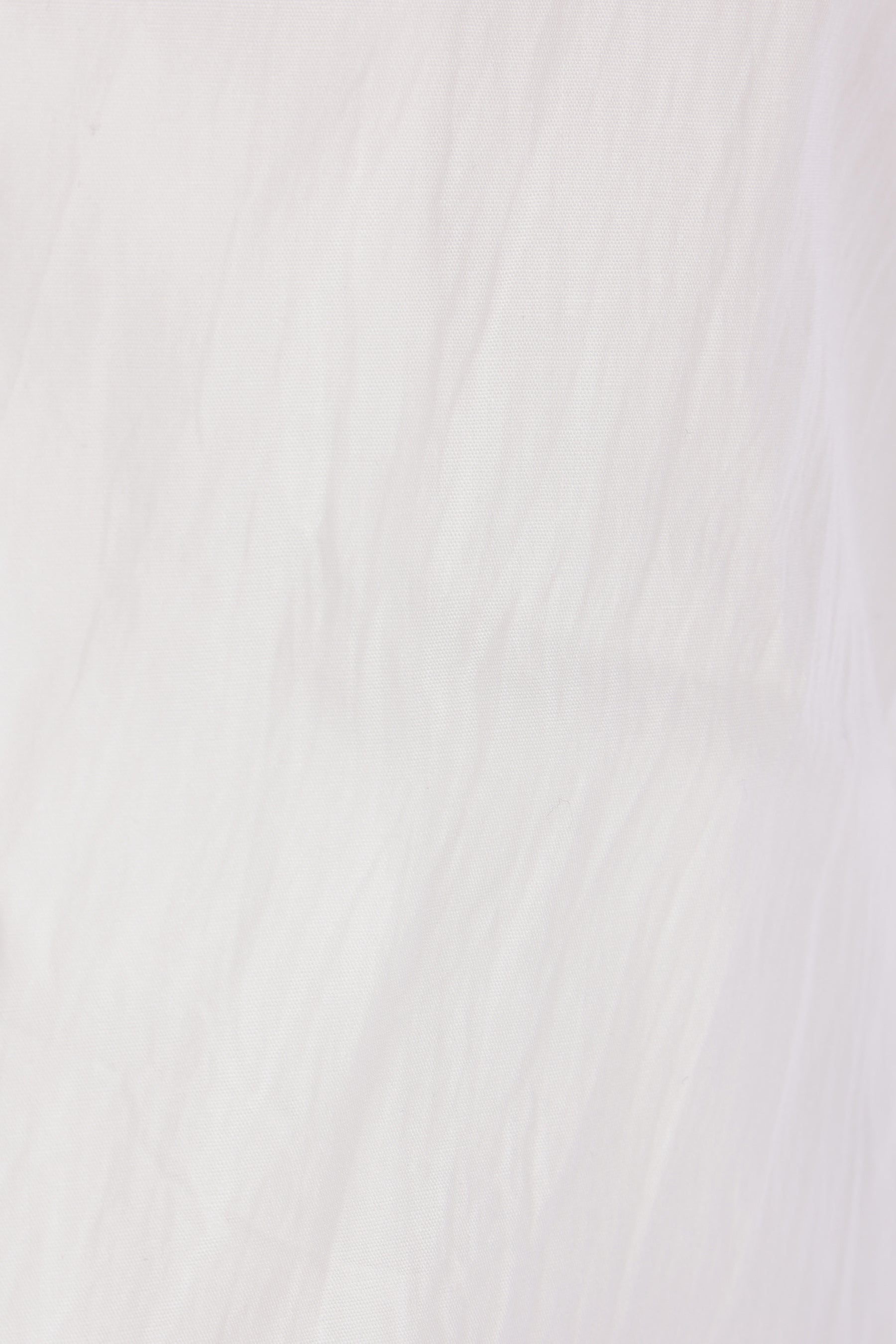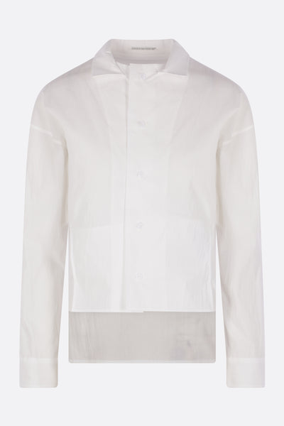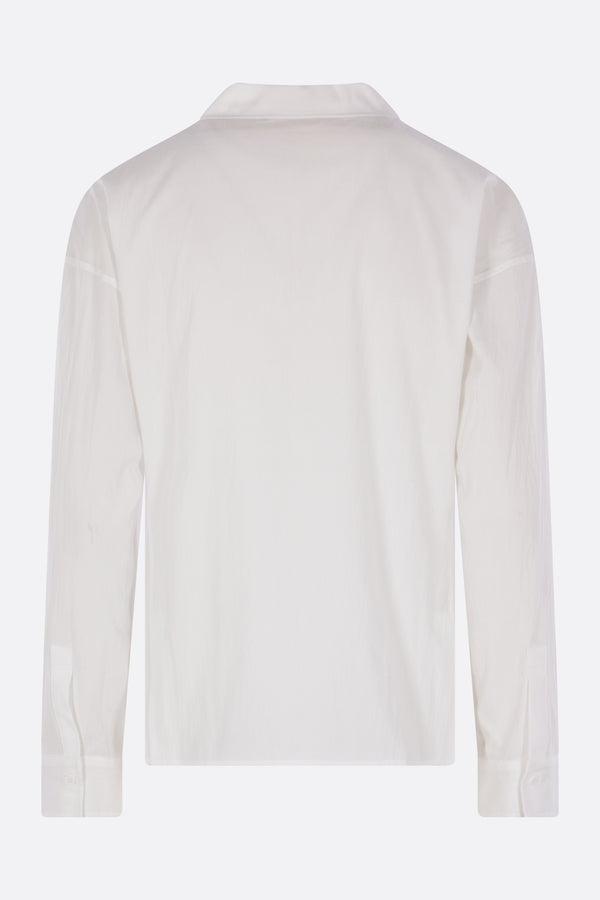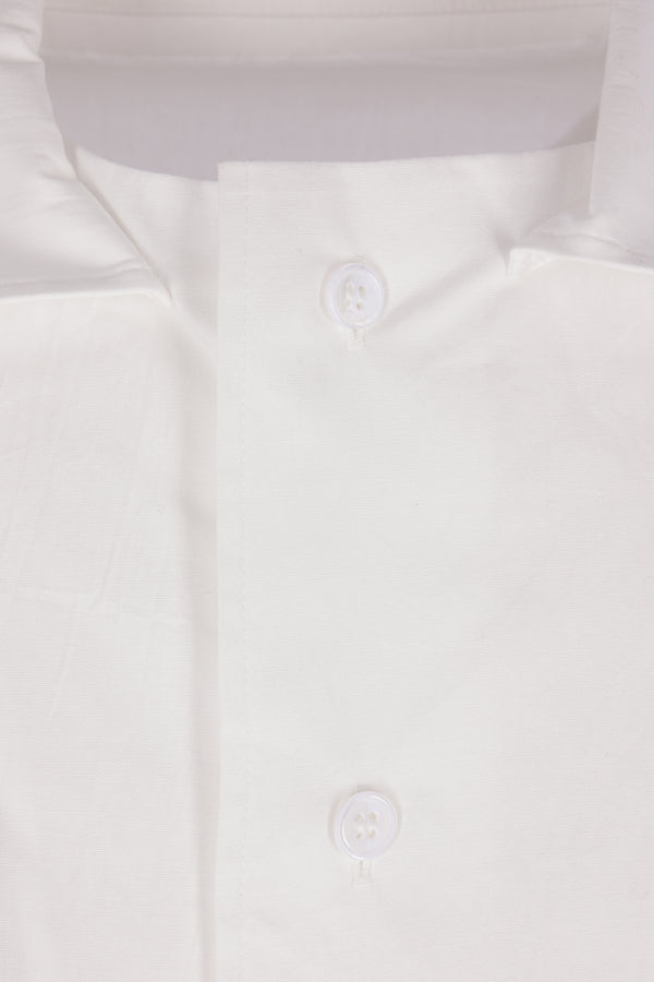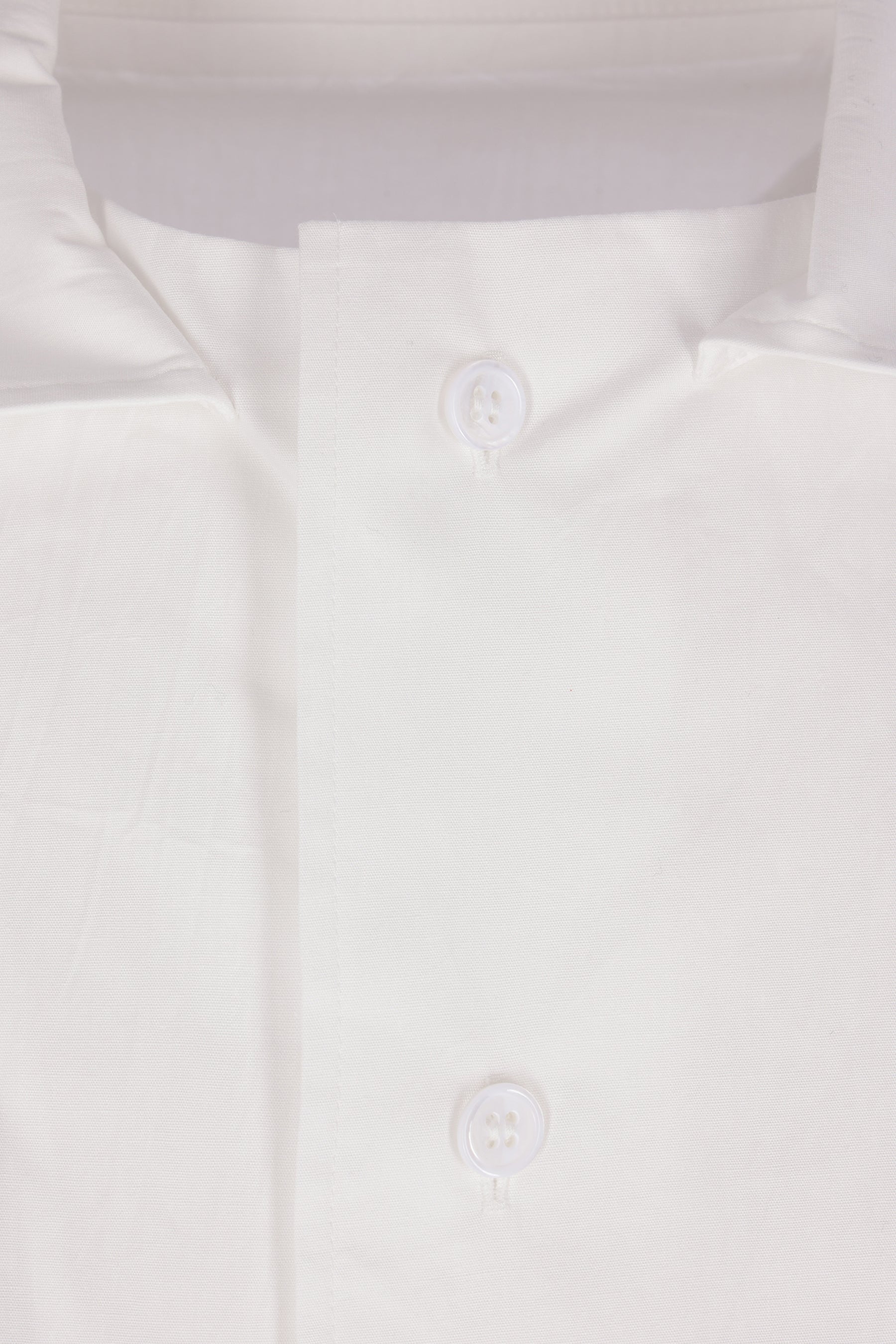 Yohji Yamamoto shirt crafted from white cotton poplin. Features a collared neckline with lapels, button closure, long sleeves with buttoned cuffs, invisible side pockets, and asymmetric side slits at the hem.