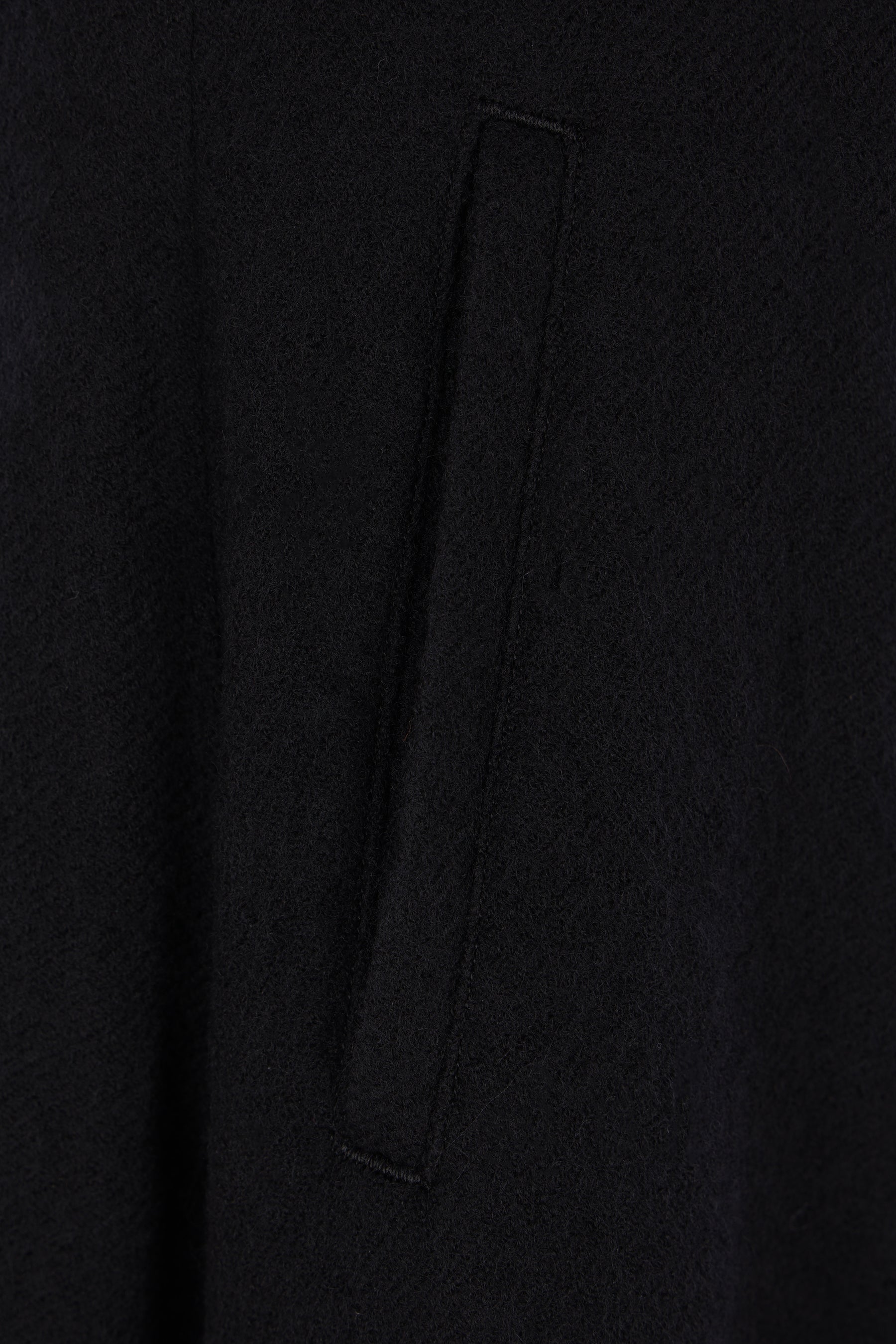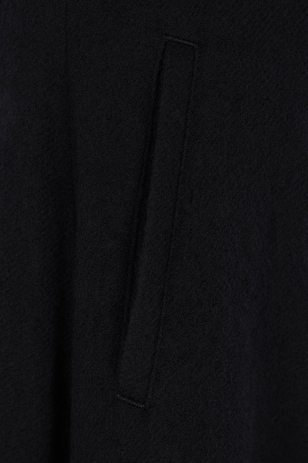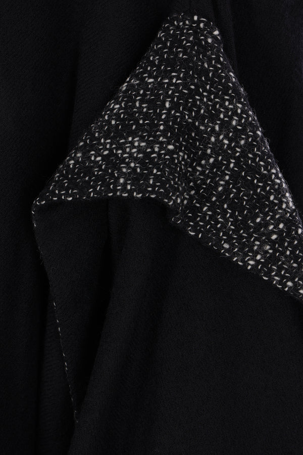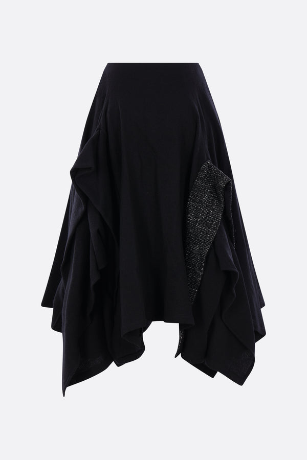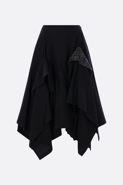 Yohji Yamamoto wide skirt crafted from black wool with a dotted insert. Features a side invisible zip closure, welt pockets, asymmetric side panels, and a lined interior.
