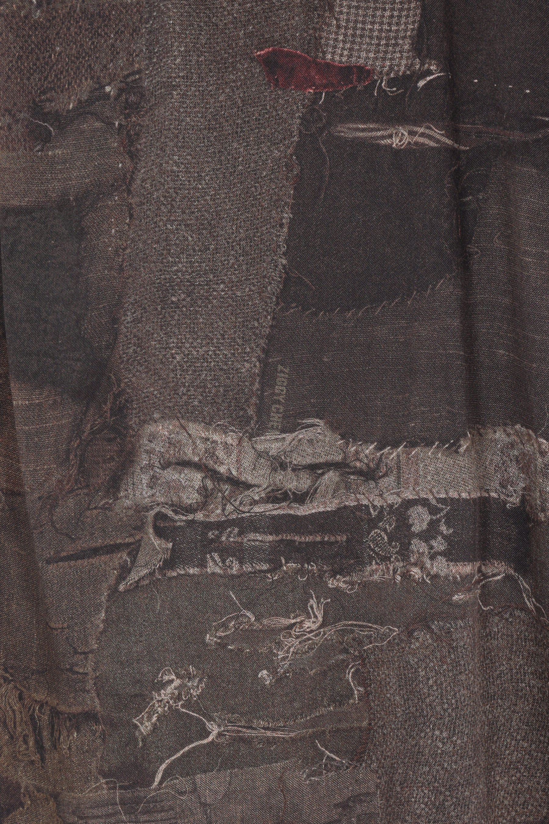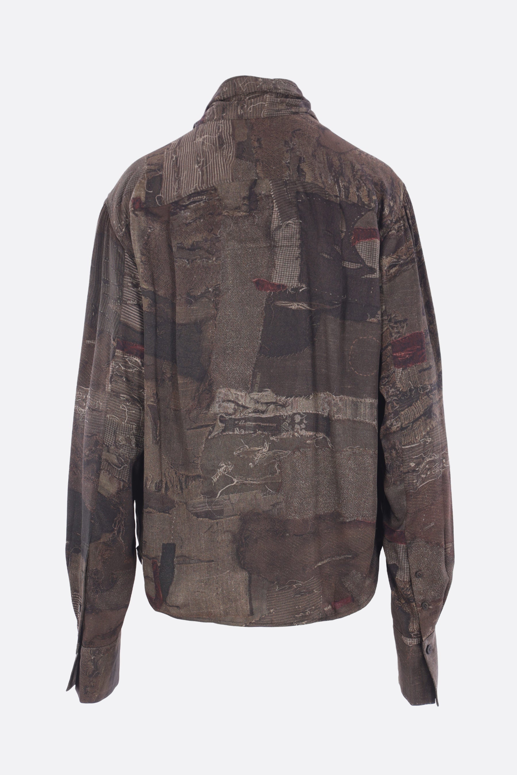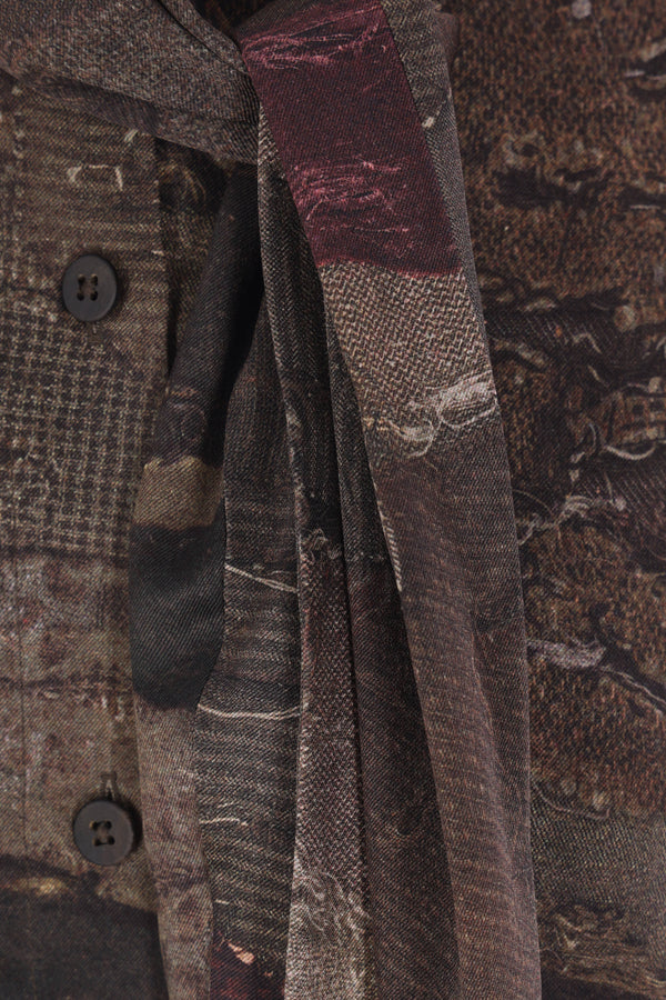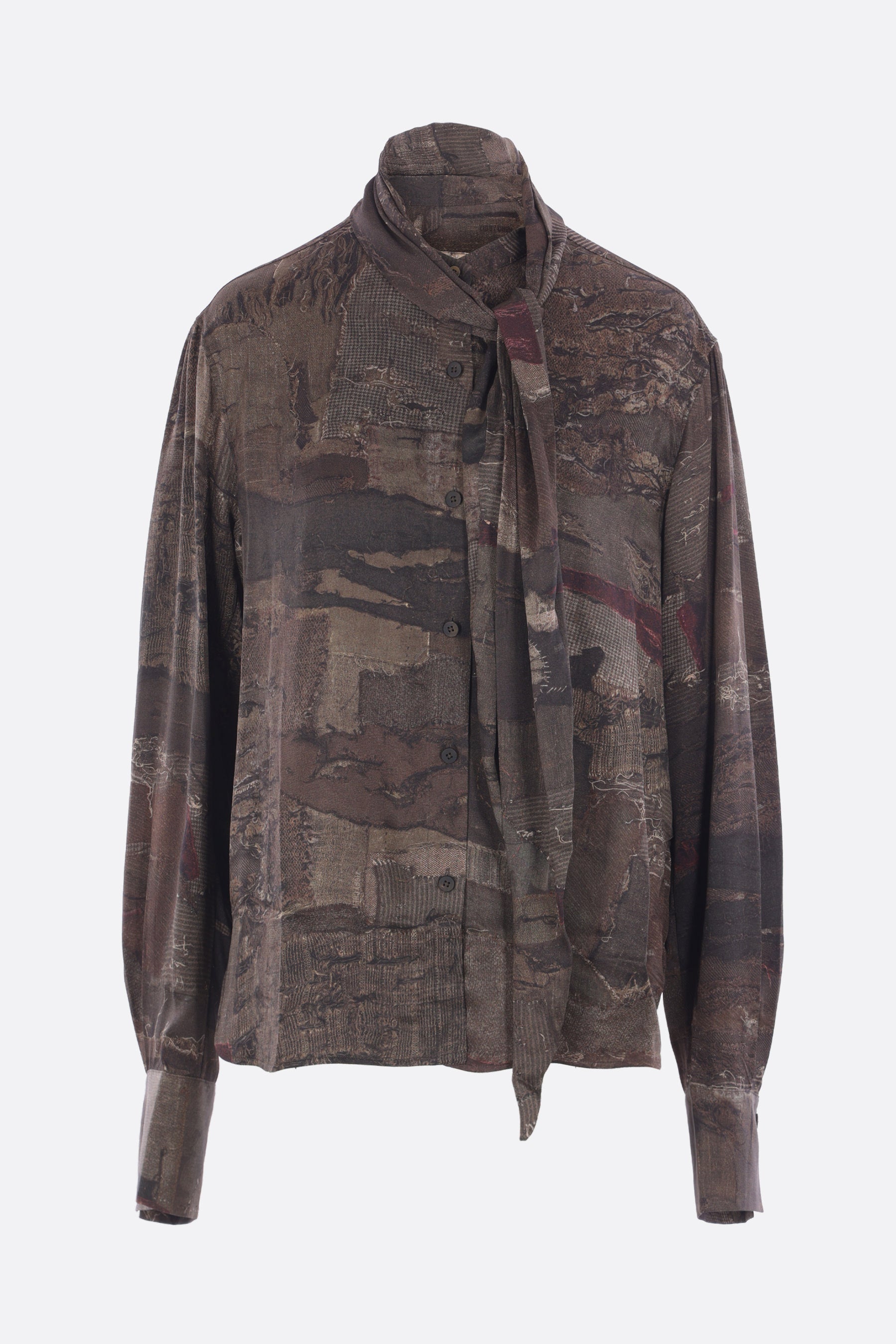 Ziggy Chen shirt made of silk with a digital print in dark grey tones. Featuring a scarf collar, front button closure, long sleeves with buttoned cuffs, and a rounded hem.
