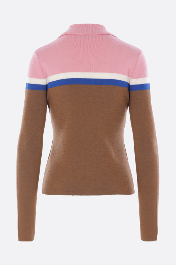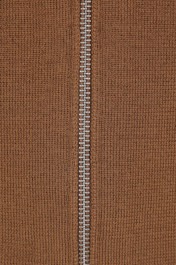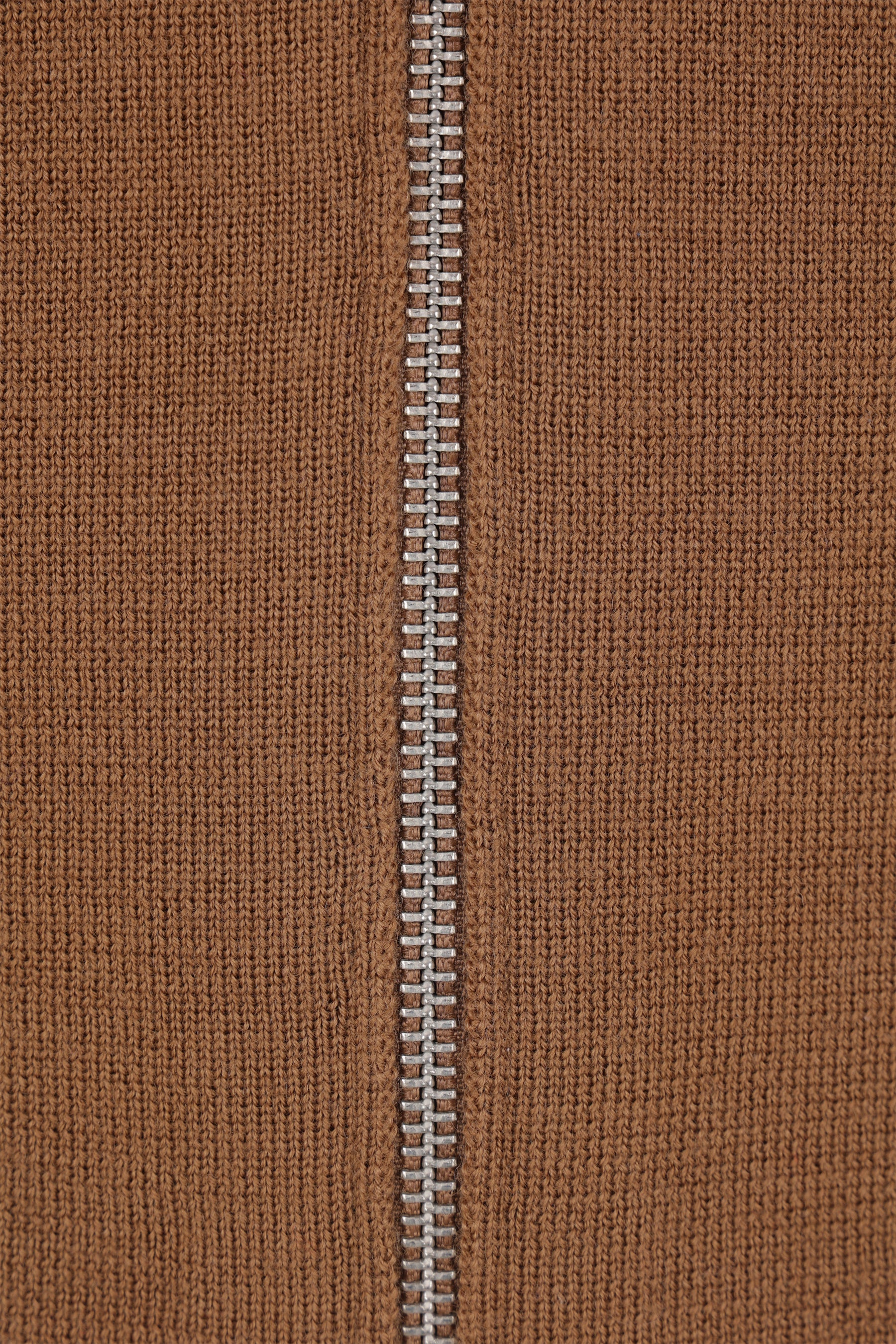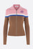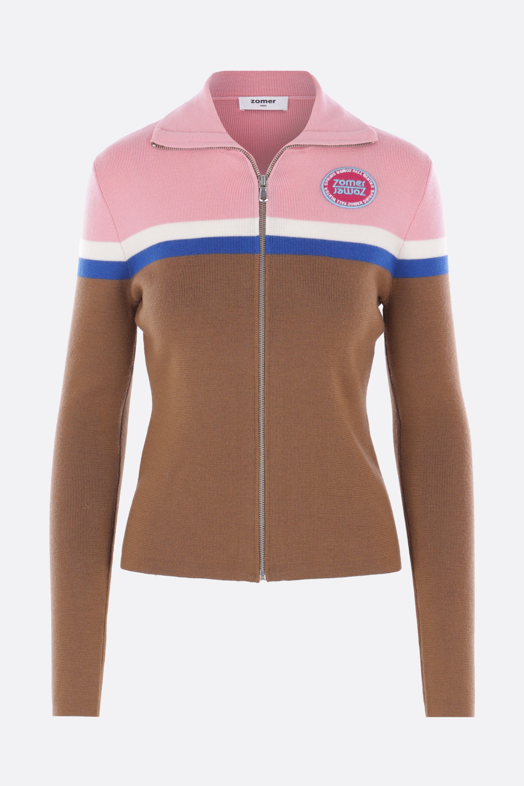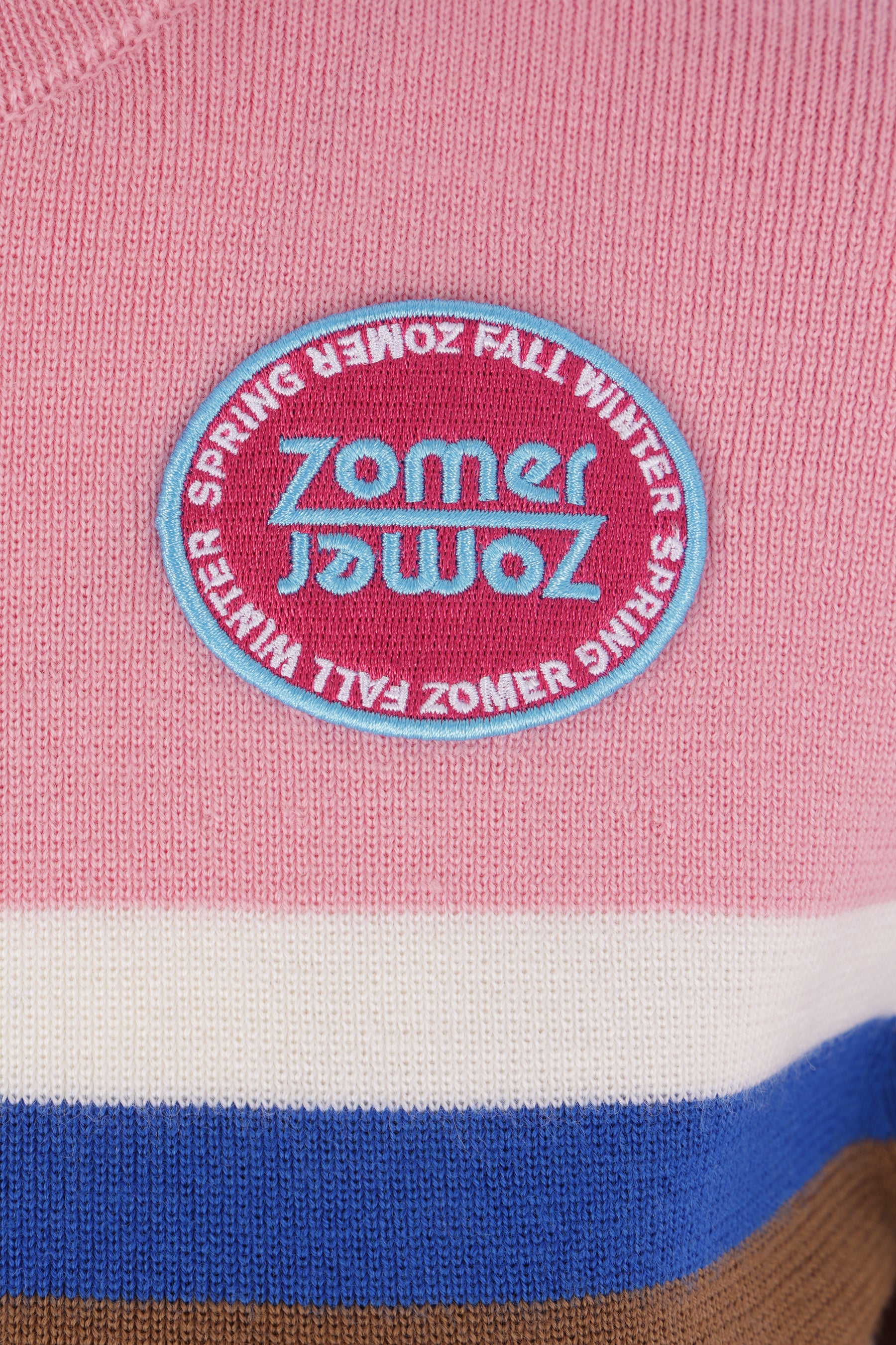 Zomer cardigan crafted in brown and pink wool knit with contrasting stripes and a logo patch on the chest. Featuring a high collar, front zip fastening, long sleeves, and straight hem.