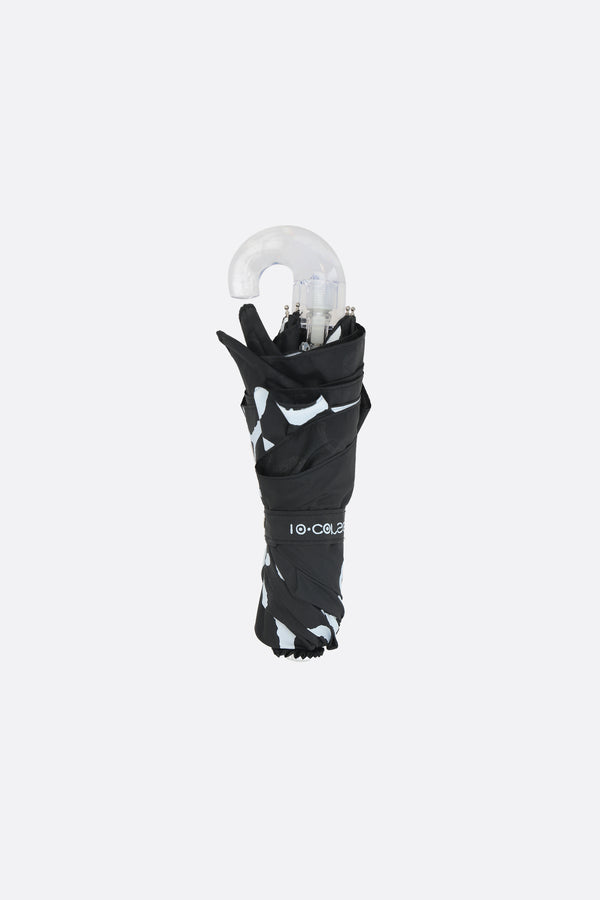 10 Corso Como pocket umbrella made from black nylon with contrasting logo lettering print. Featuring a transparent plastic handle, snap-button closure, aluminum ribs, and a matching transparent plastic case.