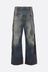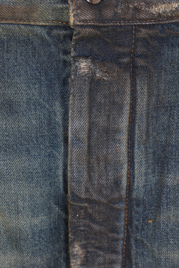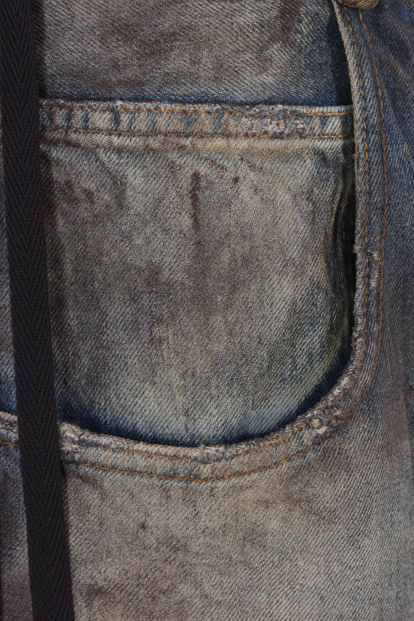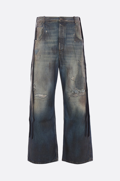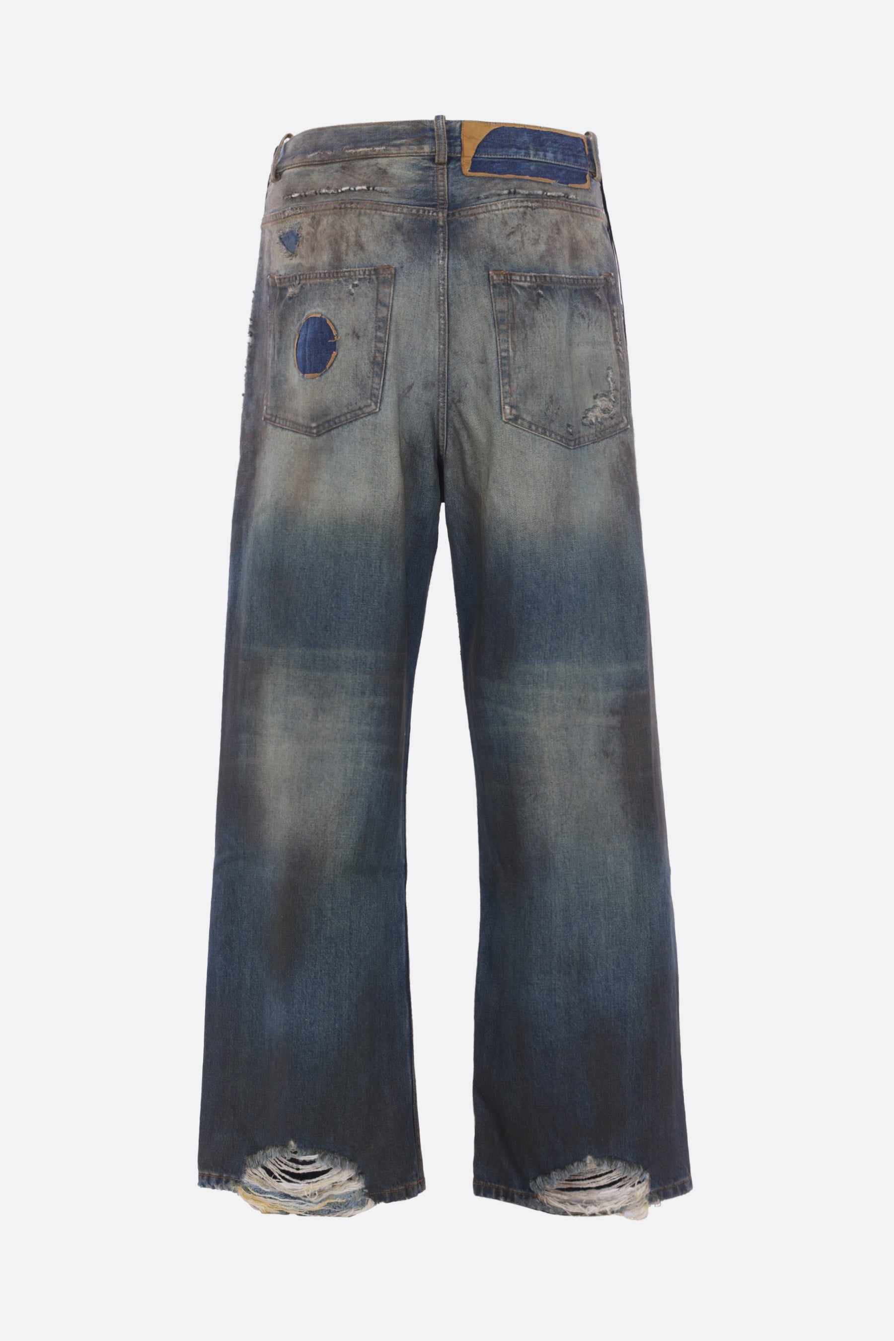 Ann Demeulemeester baggy jeans made of blue cotton denim with a distressed and washed-out effect. Features a front metal button closure, belt loops, and five classic pockets. The design is completed by decorative laces at the waist.
