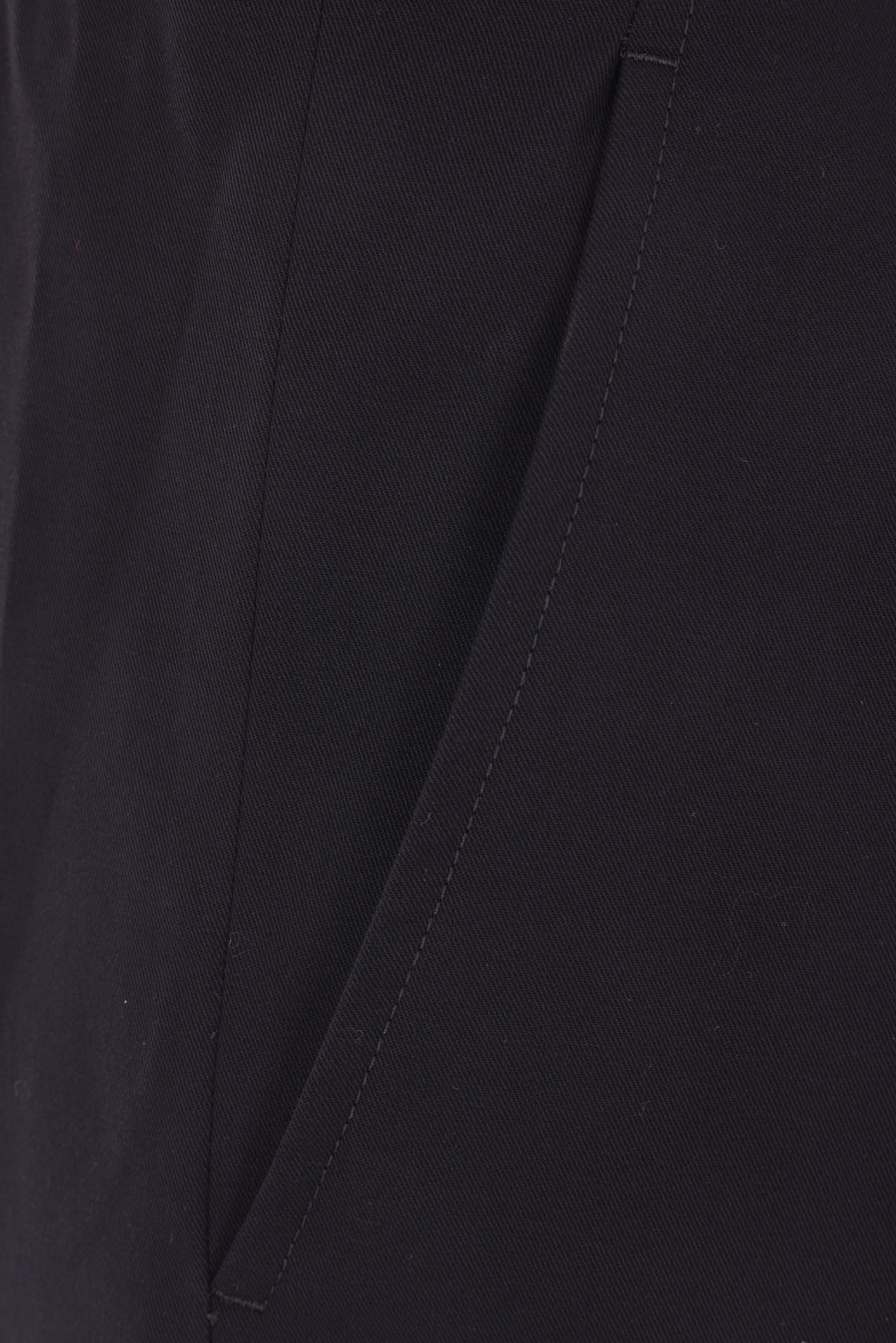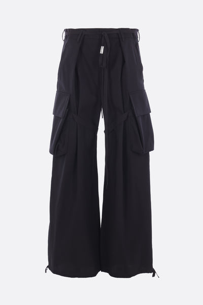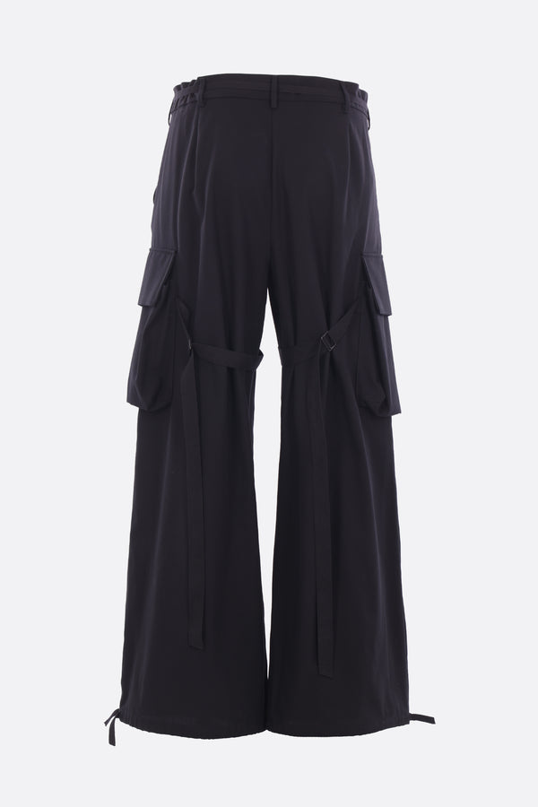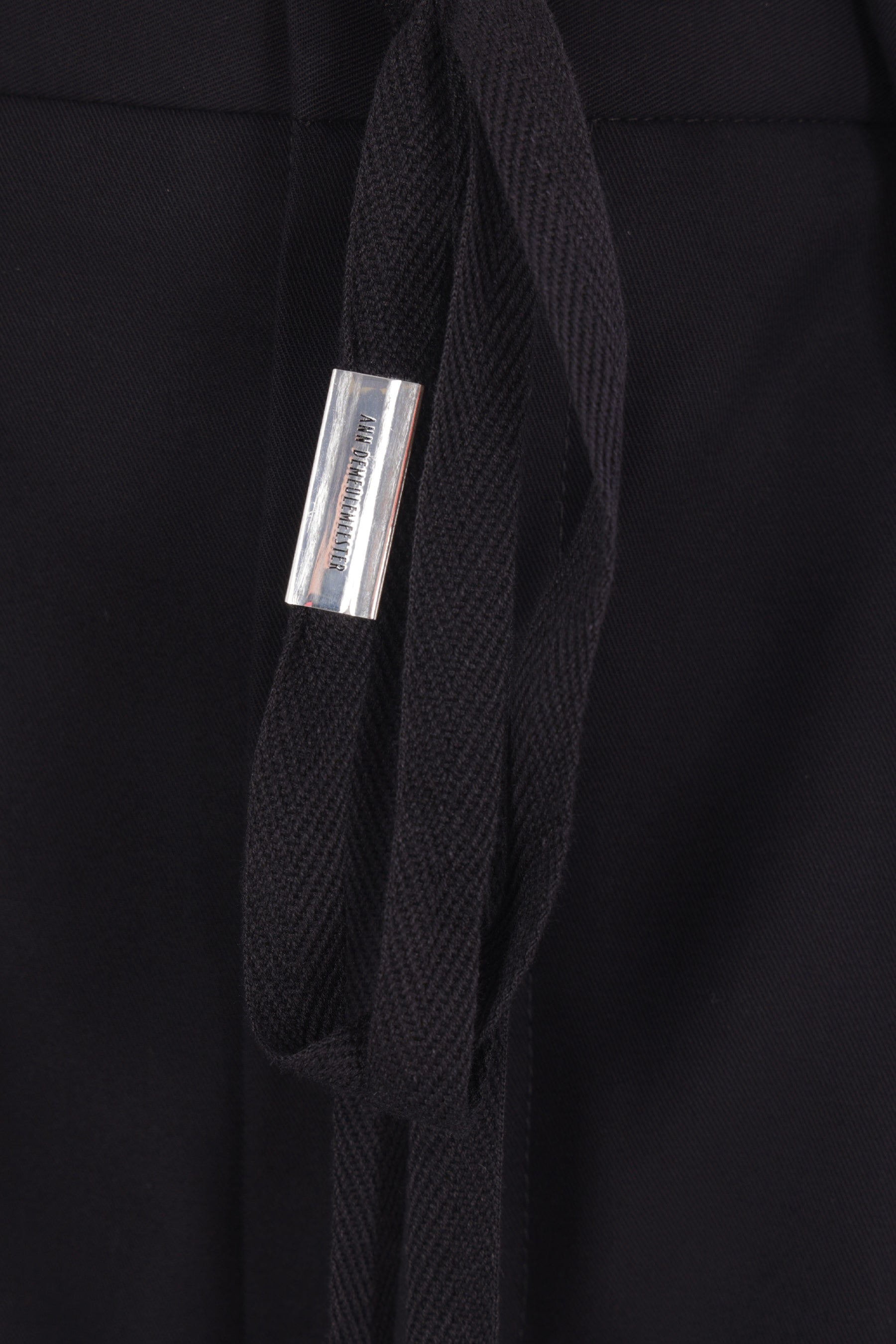 Ann Demeulemeester cargo trousers made of black cotton twill. Features a front button closure, belt loops, pleated waist, multiple pockets, and adjustable drawstring hems. The design is completed by a decorative strap with metal logo plaque.
