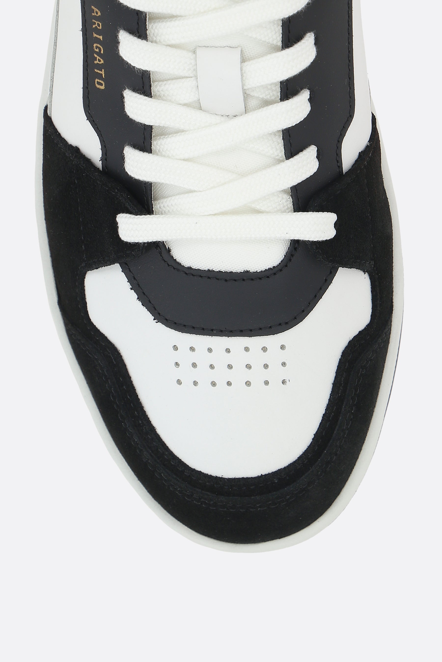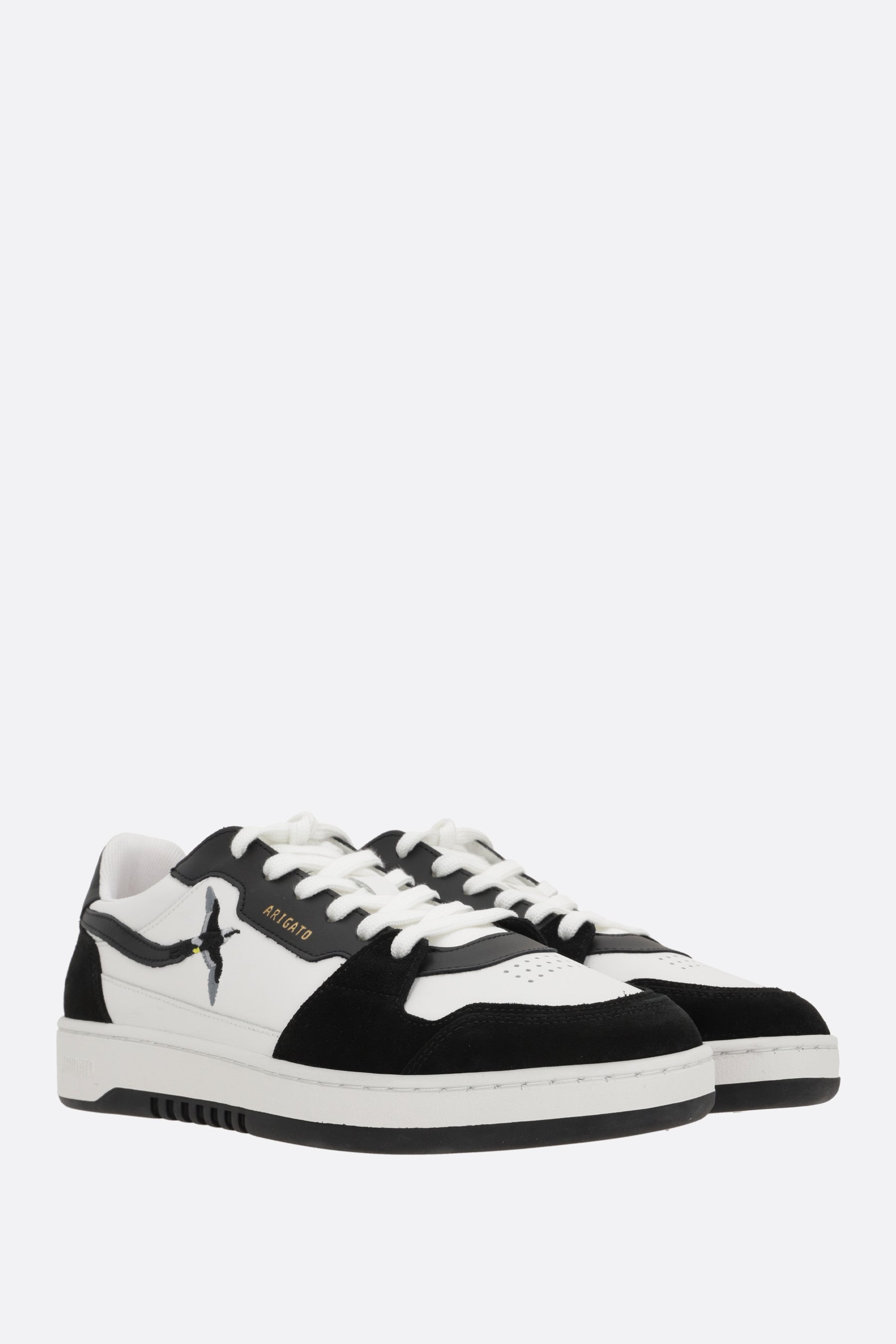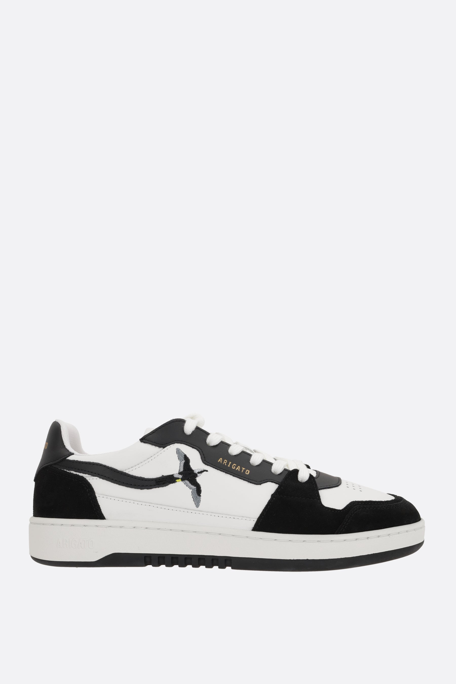 Axel Arigato low-top sneakers crafted in white smooth leather and black suede with Bee Bird embroidery on side. Featuring lace-up closure, a round-toe silhouette, fabric lining and recycled rubber sole. The design is completed by the iconic logo embossed on side.
